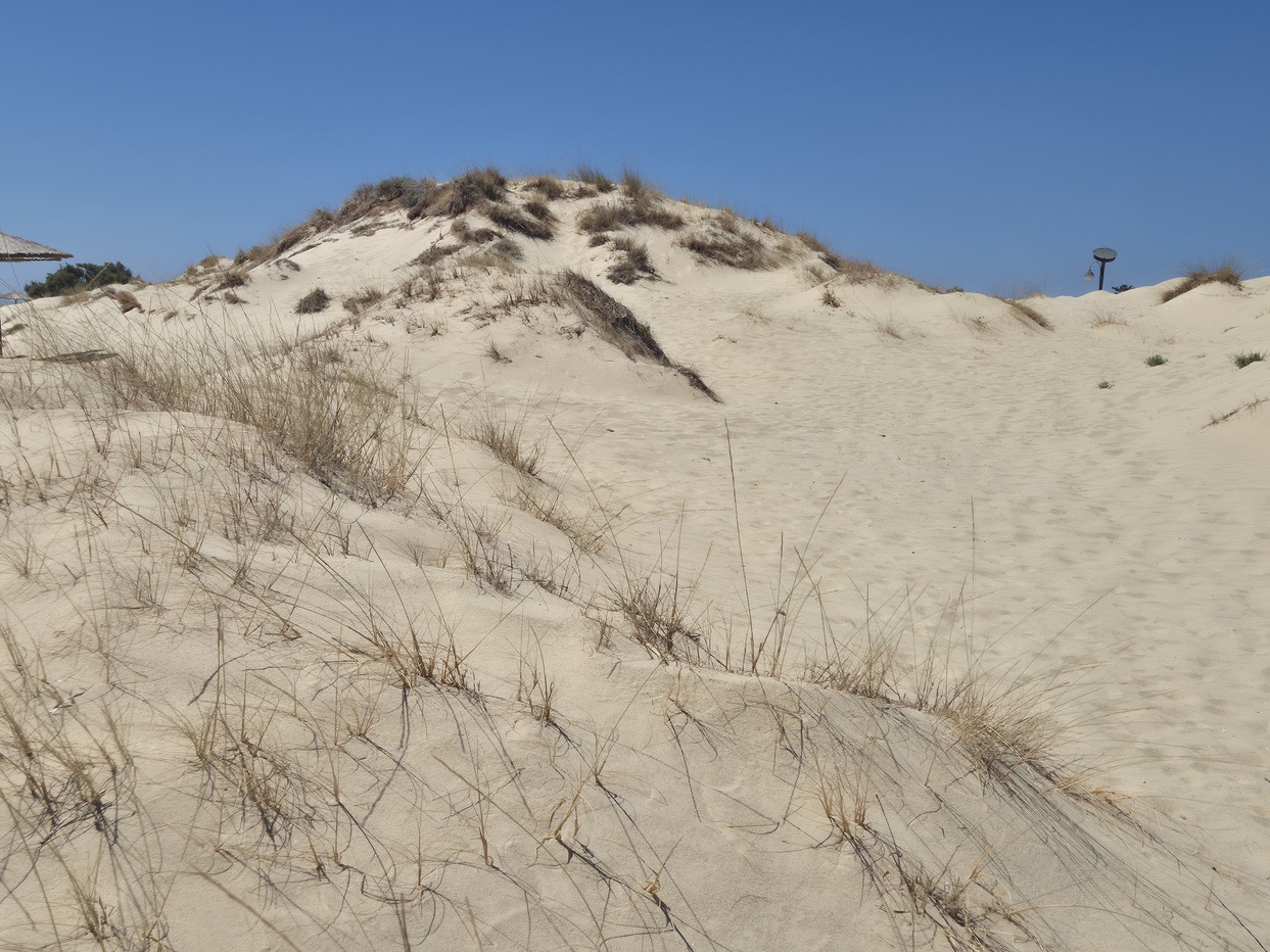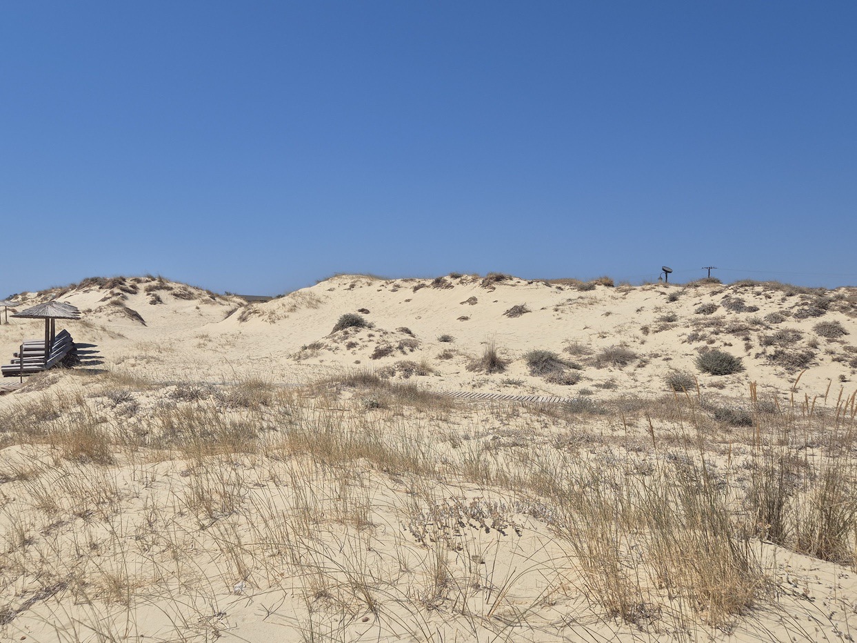 Η χρυσή άμμος απλώνεται σε απαλές καμπύλες που σκαρφαλώνουν στον ορίζοντα, δημιουργώντας μια φυσική «ζωγραφιά». Καθώς ο ήλιος αλλάζει θέση, οι αμμόλοφοι βάφονται με διαφορετικά χρώματα – από το χρυσαφί του πρωινού, στο ζεστό πορτοκαλί του δειλινού. Το σκηνικό είναι μαγευτικό και μοναδικό σε όλο το Αιγαίο.