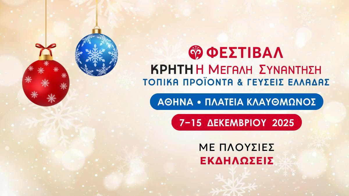 Το Φεστιβάλ "Κρήτη: Η Μεγάλη Συνάντηση – Τοπικά προϊόντα και γεύσεις Ελλάδας" καταφθάνει στην Πλατεία Κλαυθμώνος, στην καρδιά της εορταστικής Αθήνας, από 7 έως και 15 Δεκεμβρίου 2025