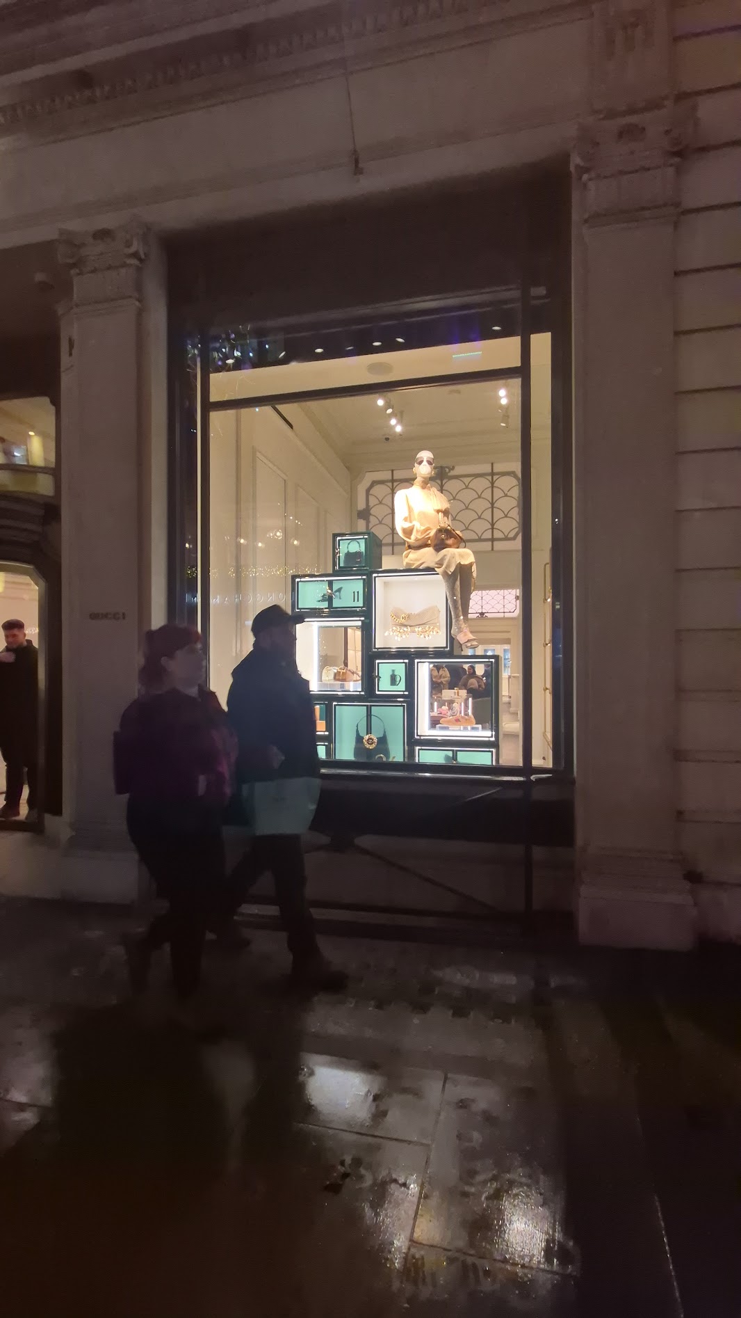 Η Gucci προσεγγίζει τη βιτρίνα ως σύγχρονη αφήγηση. Φιγούρες, αντικείμενα και φωτισμός συνθέτουν ένα σκηνικό που θυμίζει περισσότερο εικαστική εγκατάσταση παρά εμπορική παρουσίαση. Στη Bond Street, ακόμη και η βιτρίνα έχει άποψη.