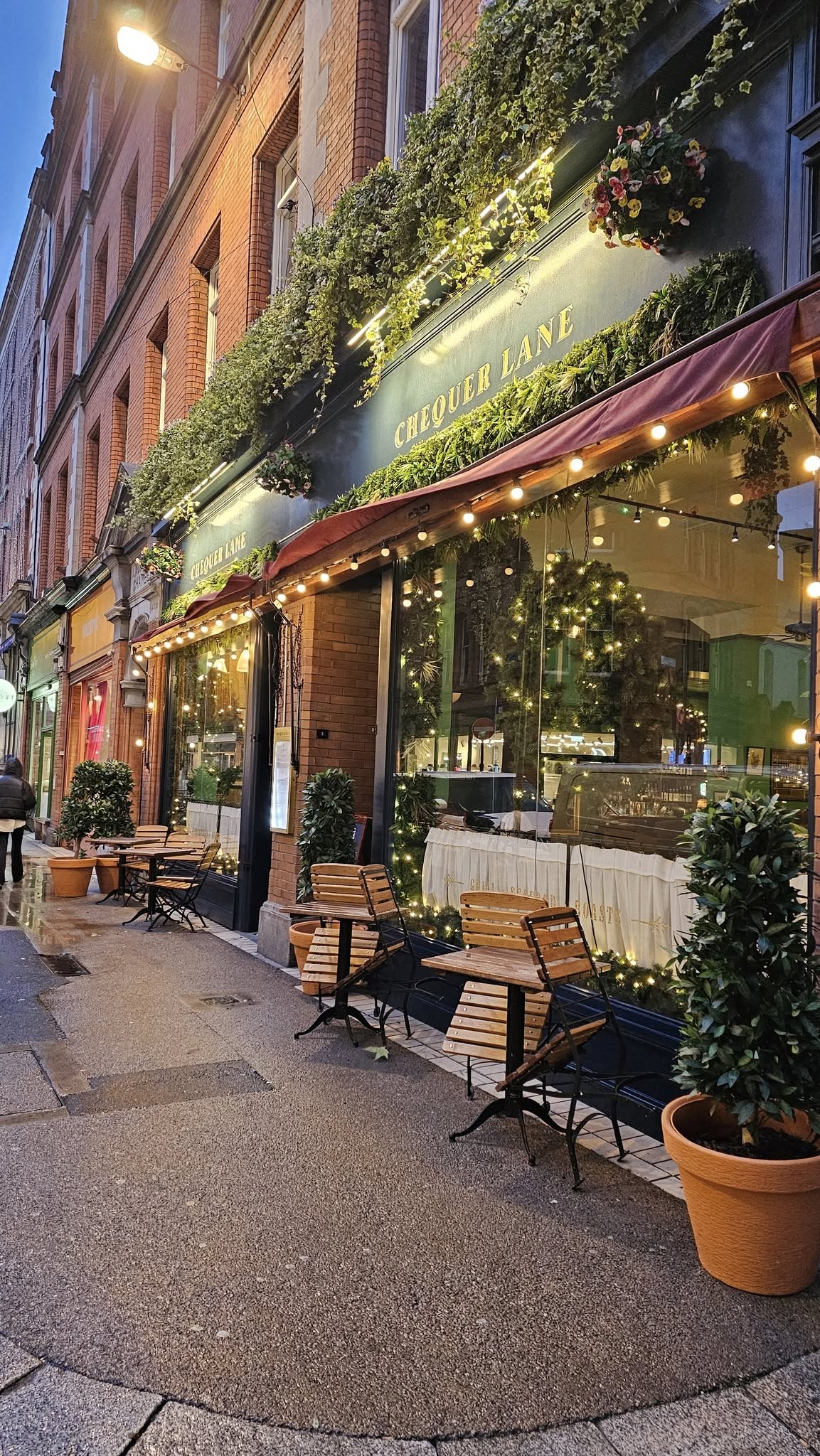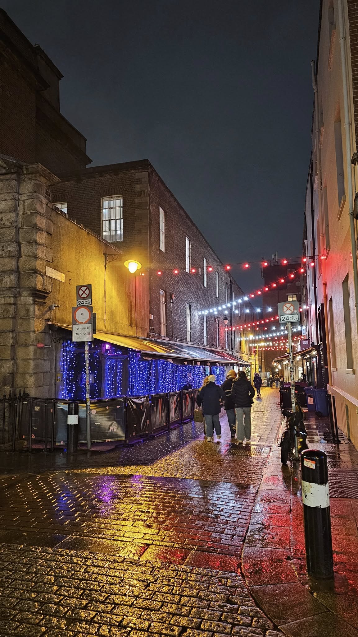 • Τα στενά γύρω από το Drury Street – βρεγμένα, λαμπερά, με μια σχεδόν κινηματογραφική διάθεση.