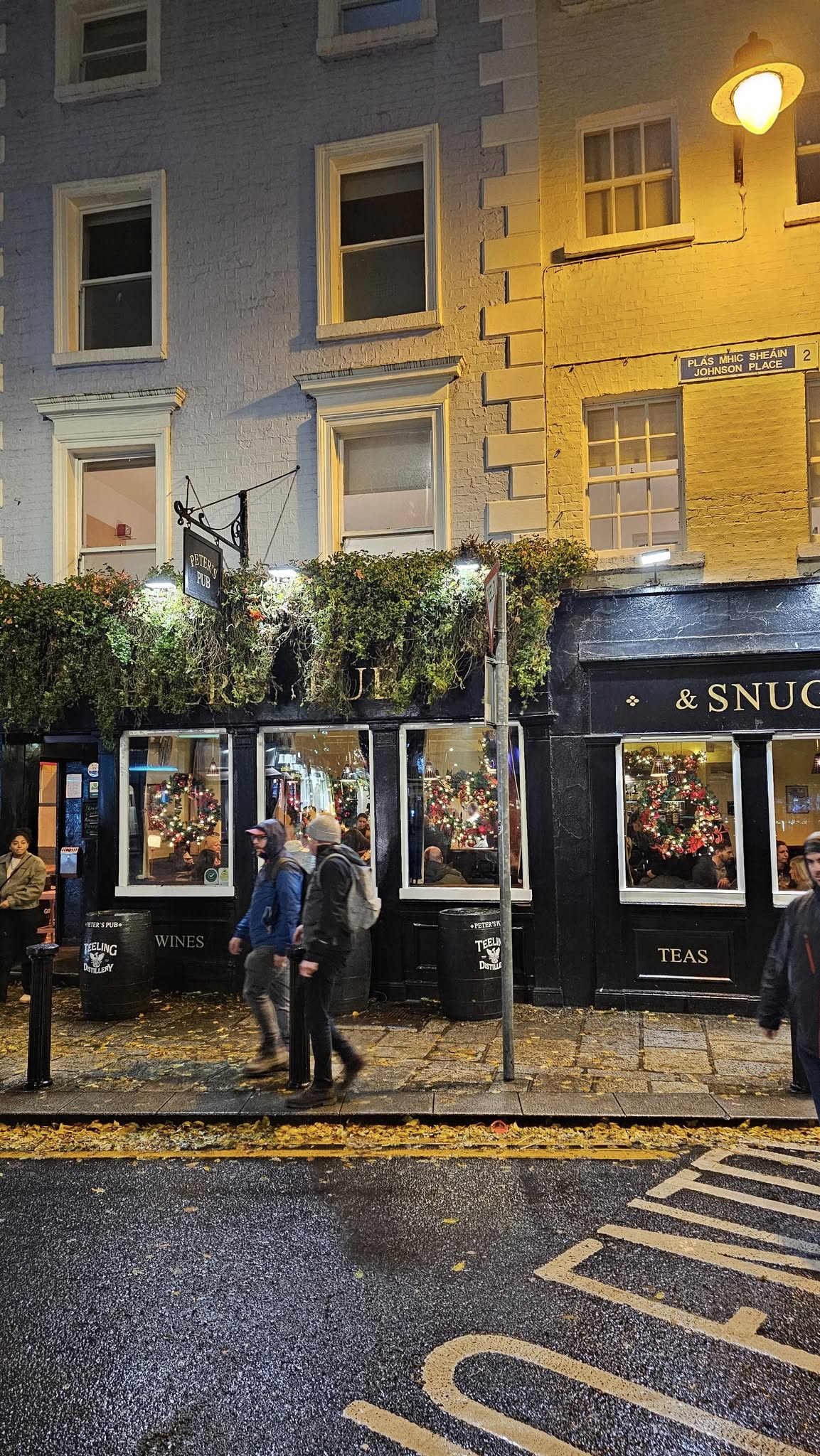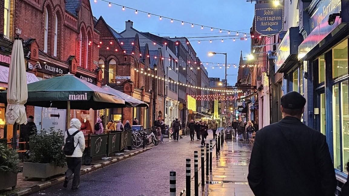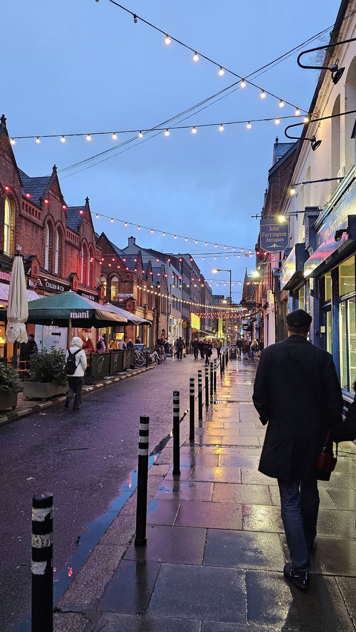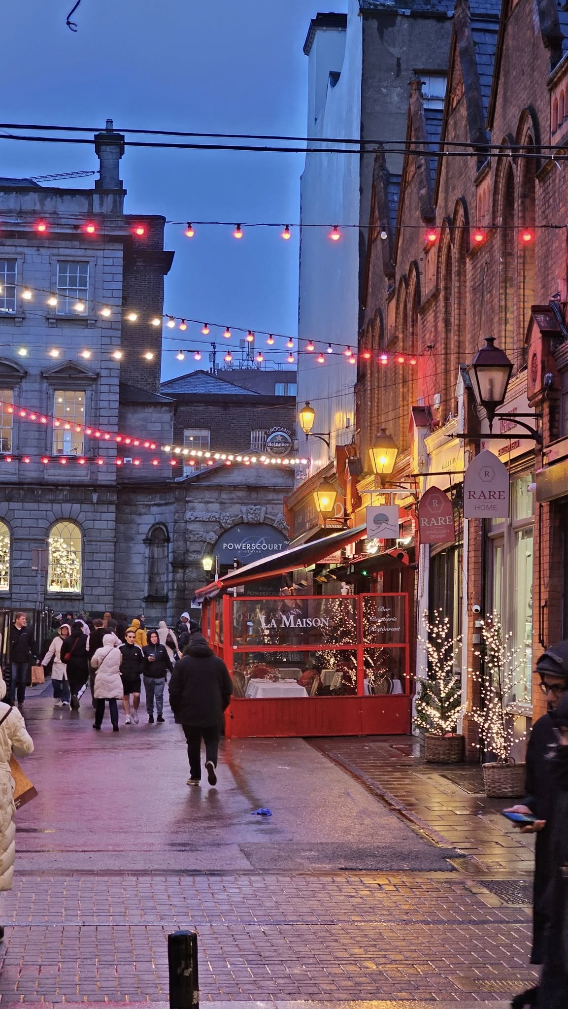 Οι δρόμοι γύρω από το Powerscourt Townhouse, την Castle Lounge και τα φωτισμένα δρομάκια της Creative Quarter λάμπουν. Τα λαμπιόνια –κόκκινα, λευκά, χρυσά– κάνουν ένα περίεργο παιχνίδι με τις σταγόνες της βροχής, δημιουργώντας αντανακλάσεις που μοιάζουν σχεδόν σκηνοθετημένες. Το νερό γίνεται καθρέφτης, τα φώτα χορεύουν κι ο κόσμος περπατά γρήγορα, κουμπωμένος μέχρι πάνω στα μπουφάν.
