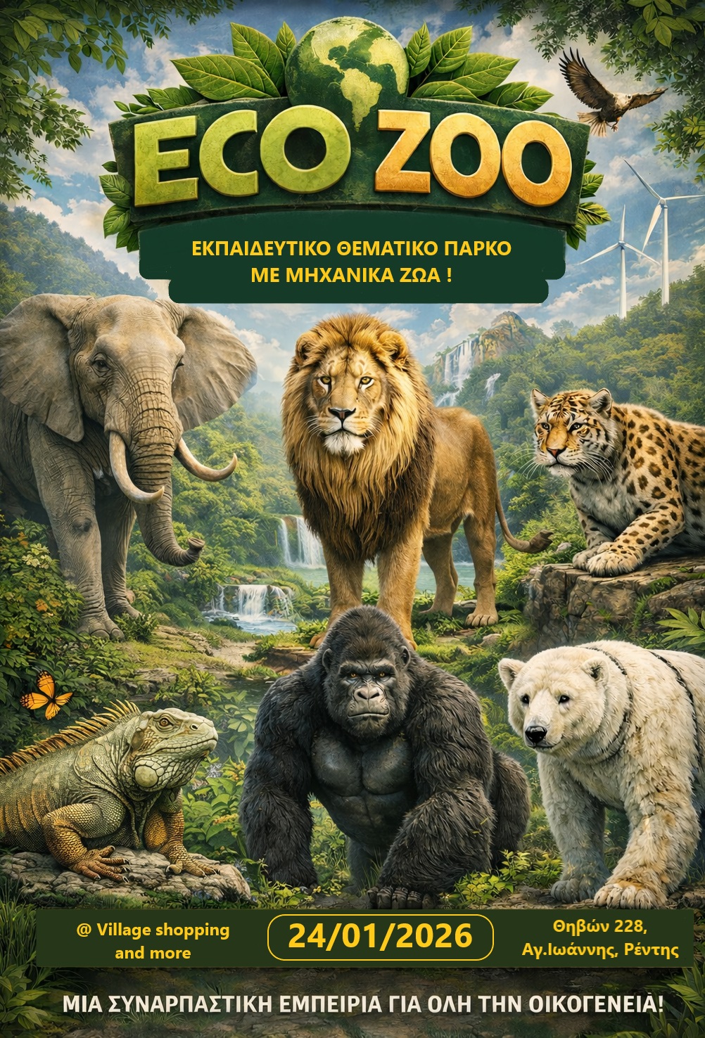 Ένα εντυπωσιακό, πρωτότυπο και επίκαιρο θεματικό πάρκο ξεκινάει την λειτουργία του στο Village shopping & more, στο Ρέντη από τις 24 Ιανουαρίου του 2026 και για όλη τη σχολική χρονιά. Είναι ο πρώτος στον κόσμο «Ζωολογικός Κήπος» με ζώα δίχως αιχμαλωσία!