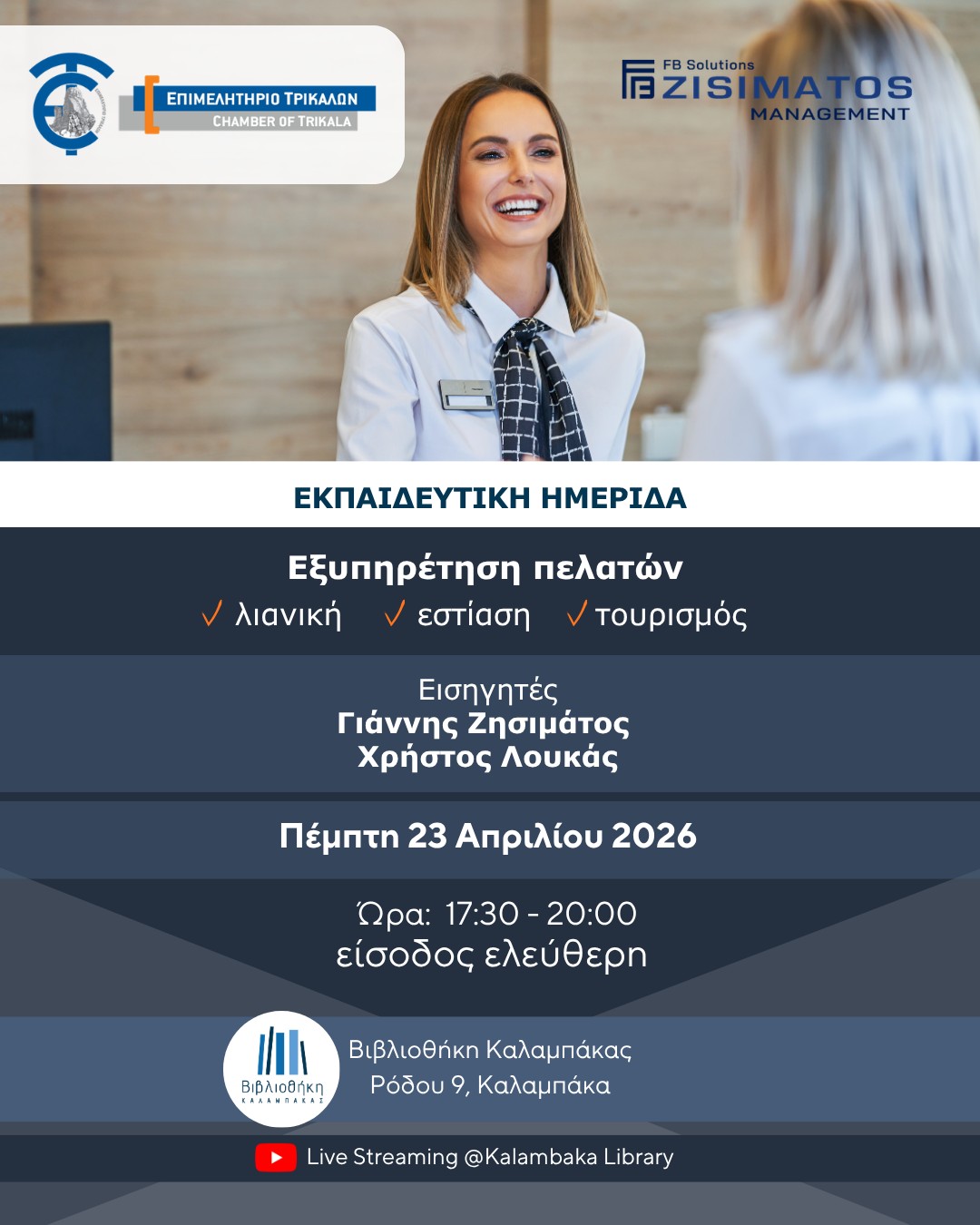 Το Επιμελητήριο Τρικάλων σας προσκαλεί στην εκπαιδευτική ημερίδα με θέμα: «Εξυπηρέτηση πελατών στη λιανική, στην εστίαση και στον τουρισμό», που θα πραγματοποιηθεί την Πέμπτη, 23 Απριλίου 2026 και ώρες 17:30 – 20:00, στη Βιβλιοθήκη Καλαμπάκας (Ρόδου 9, Καλαμπάκα).