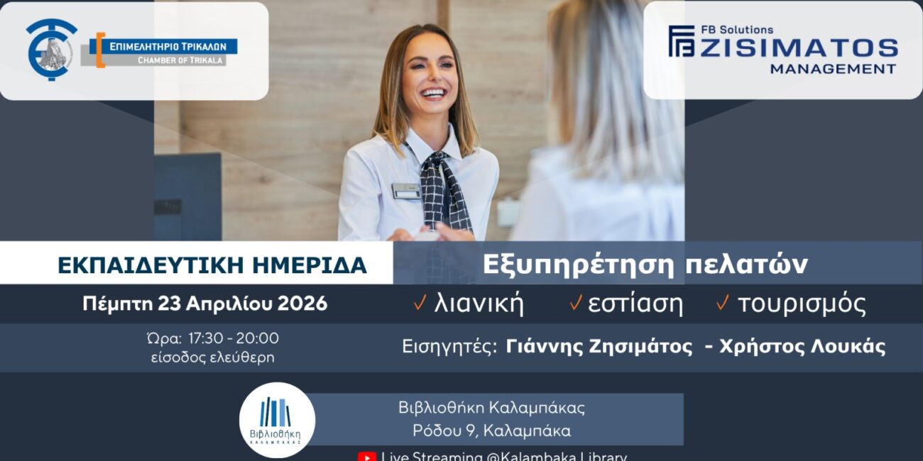 «Εξυπηρέτηση πελατών στη λιανική,στην εστίαση κα ιστον τουρισμό»,που θα πραγματοποιηθεί τηνΠέμπτη, 23 Απριλίου 2026 και ώρες 17:30 – 20:00,