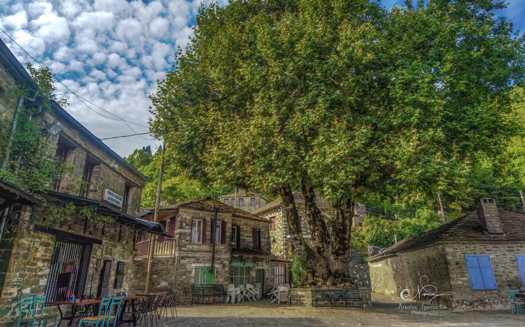 At the centre of the village lies the main square, shaded by a towering plane tree. This is where life in Dikorifo beats gently: the community building, the small cafés with a handful of tables, and voices that fade softly into the natural calm of the landscape. The stone fountain with its flowing water adds a touch of old Epirot serenity. It’s one of those corners that make you want to stay a little longer, just to breathe in the atmosphere.