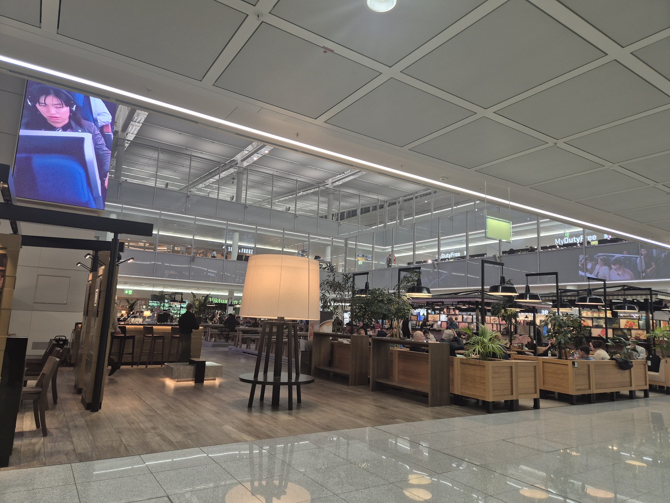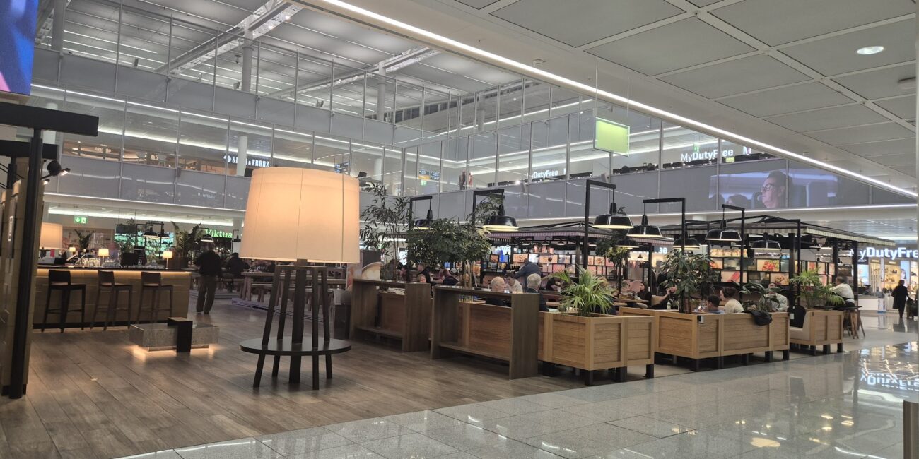 Οι χώροι αναμονής και εστίασης έχουν σχεδιαστεί με όρους φιλοξενίας και όχι απλής λειτουργικότητας. Ξύλινες υφές, διακριτικός φωτισμός, πράσινες παρεμβάσεις και καθίσματα με εργονομική άνεση συνθέτουν μια ατμόσφαιρα που θυμίζει lobby σύγχρονου design hotel. Η μετάβαση από την καθημερινότητα στο ταξίδι γίνεται σχεδόν ανεπαίσθητα.
