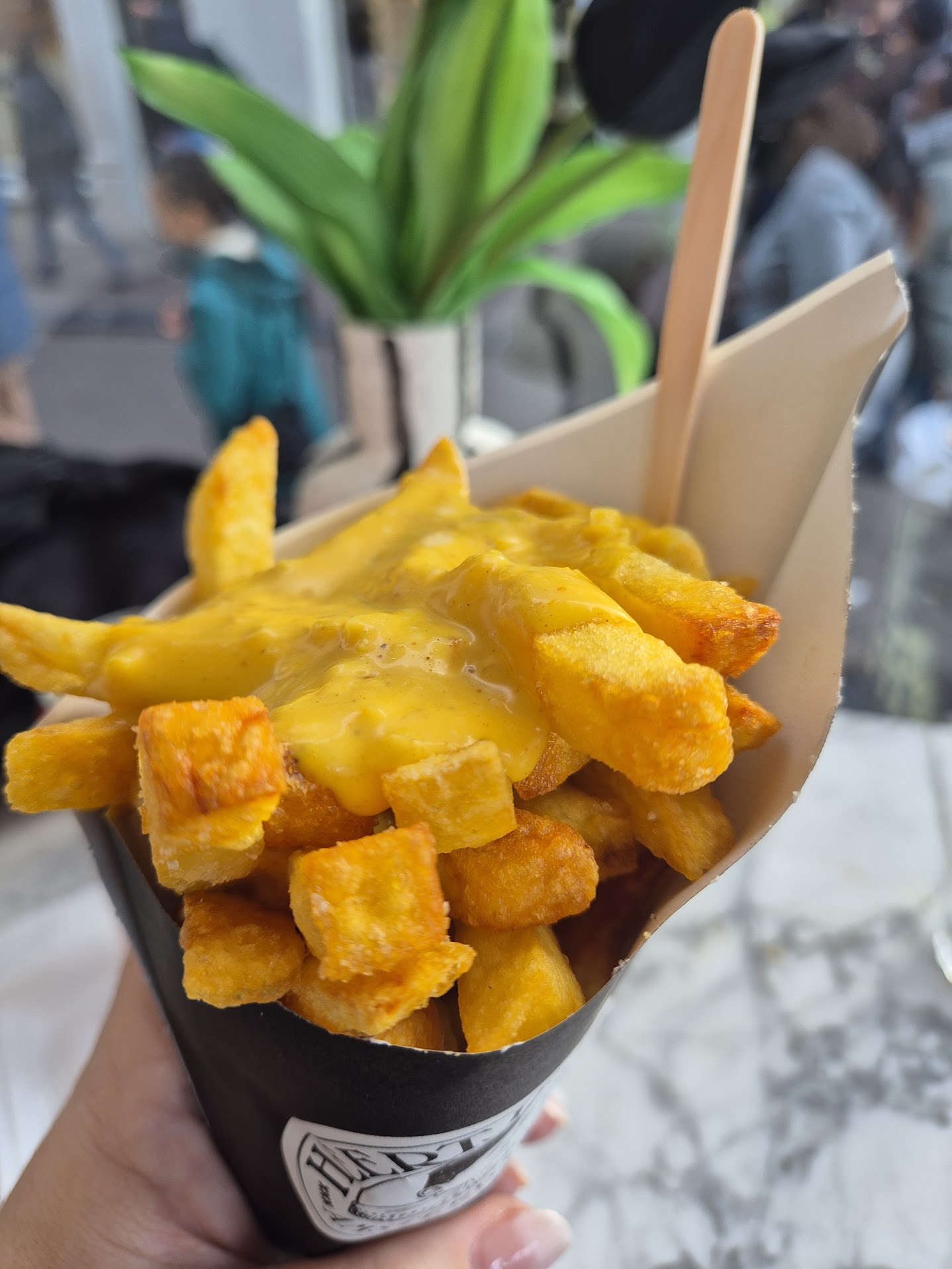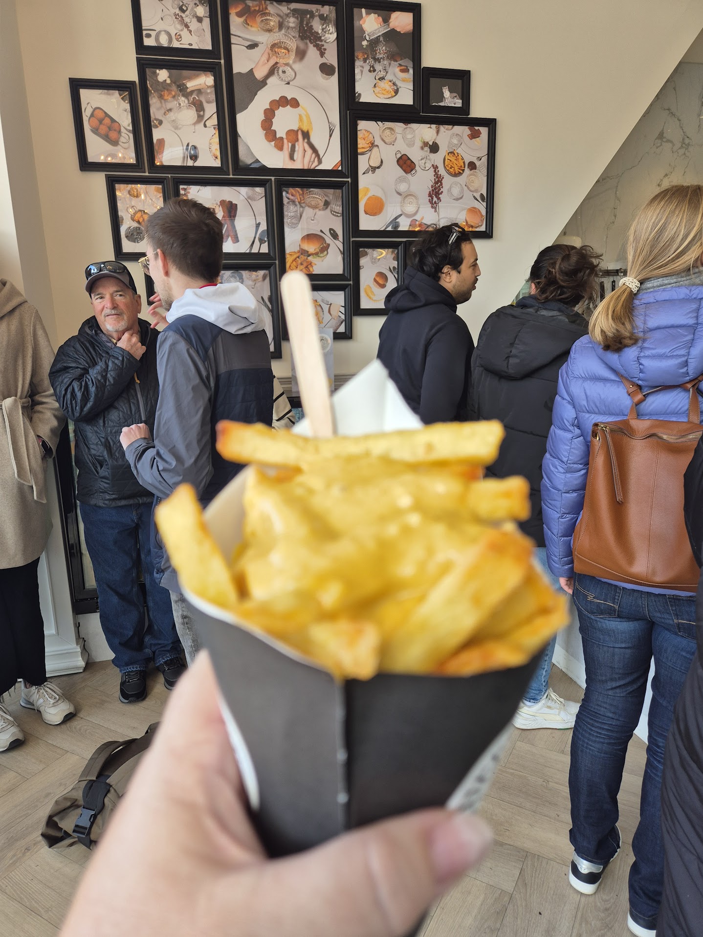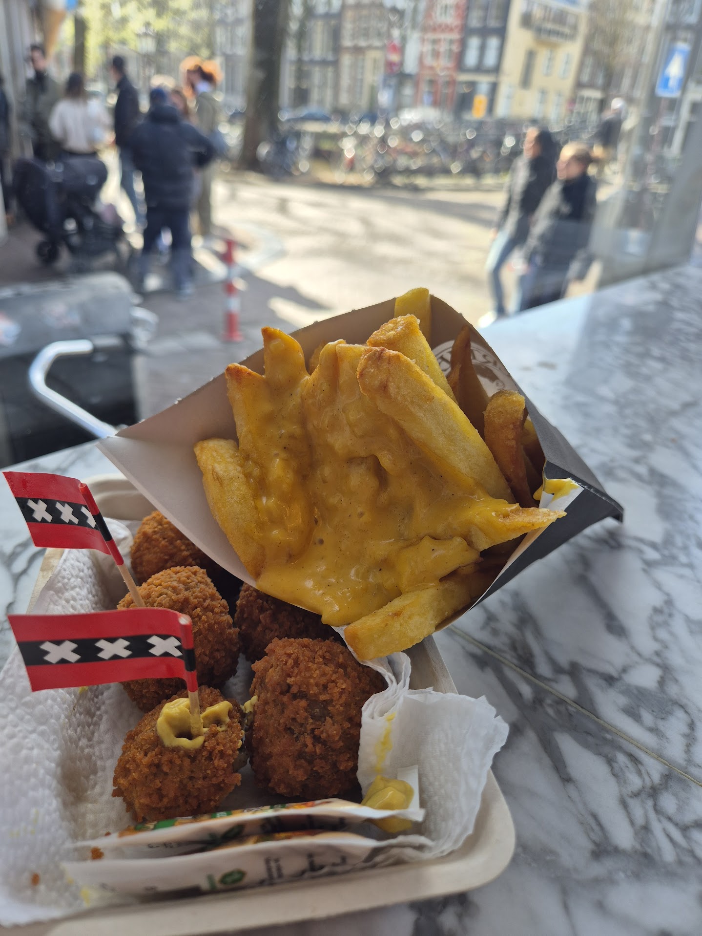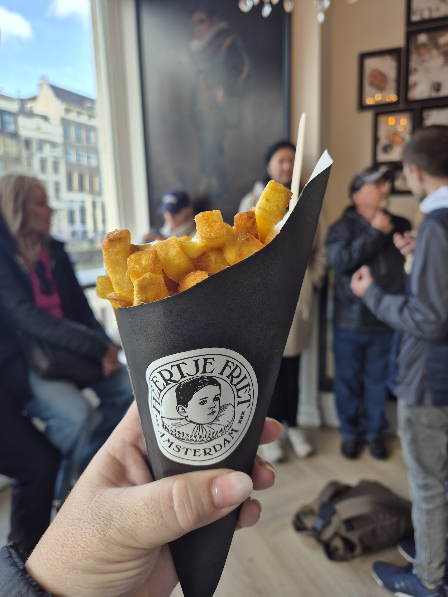 Κάπως έτσι, βρέθηκα μπροστά σε ένα μικρό μαγαζί στο κέντρο της πόλης. Η μυρωδιά από τις τηγανητές πατάτες — ειδικά με την πείνα να έχει χτυπήσει κόκκινο — και η ουρά των ανθρώπων που περίμεναν υπομονετικά ήταν αρκετή για να με πείσει ότι ήμουν στο σωστό σημείο. Άλλωστε, δεν βρέθηκα εκεί τυχαία. Η Laura – Maria Maramenou, η Ελληνίδα ξεναγός μου στο Άμστερνταμ, ήταν εκείνη που μου το είχε προτείνει. «Να πας οπωσδήποτε. Μπορεί να μην είναι αυτό που προτιμούν οι ντόπιοι, όμως είναι από τα πιο viral μαγαζιά», μου είχε πει.