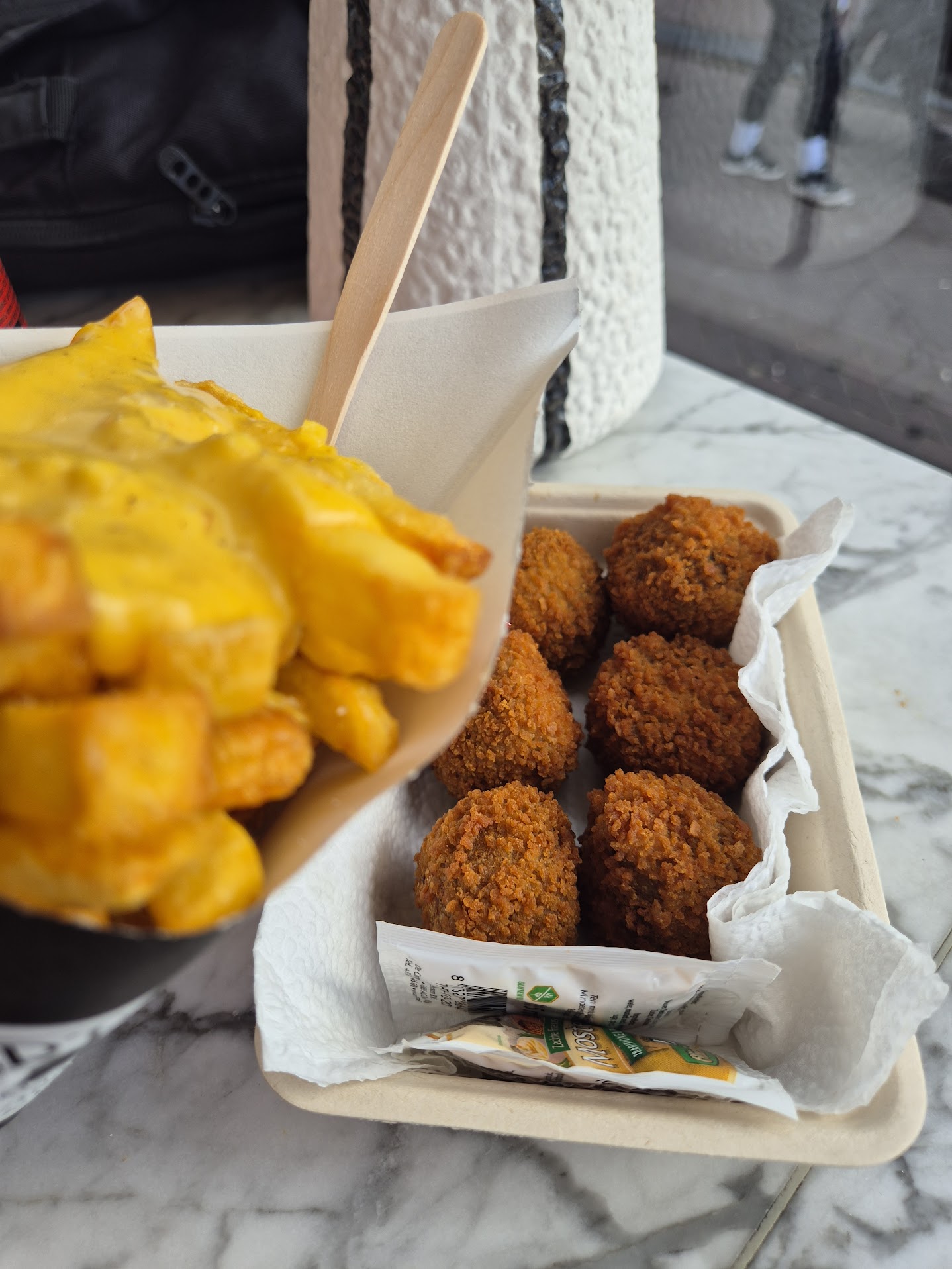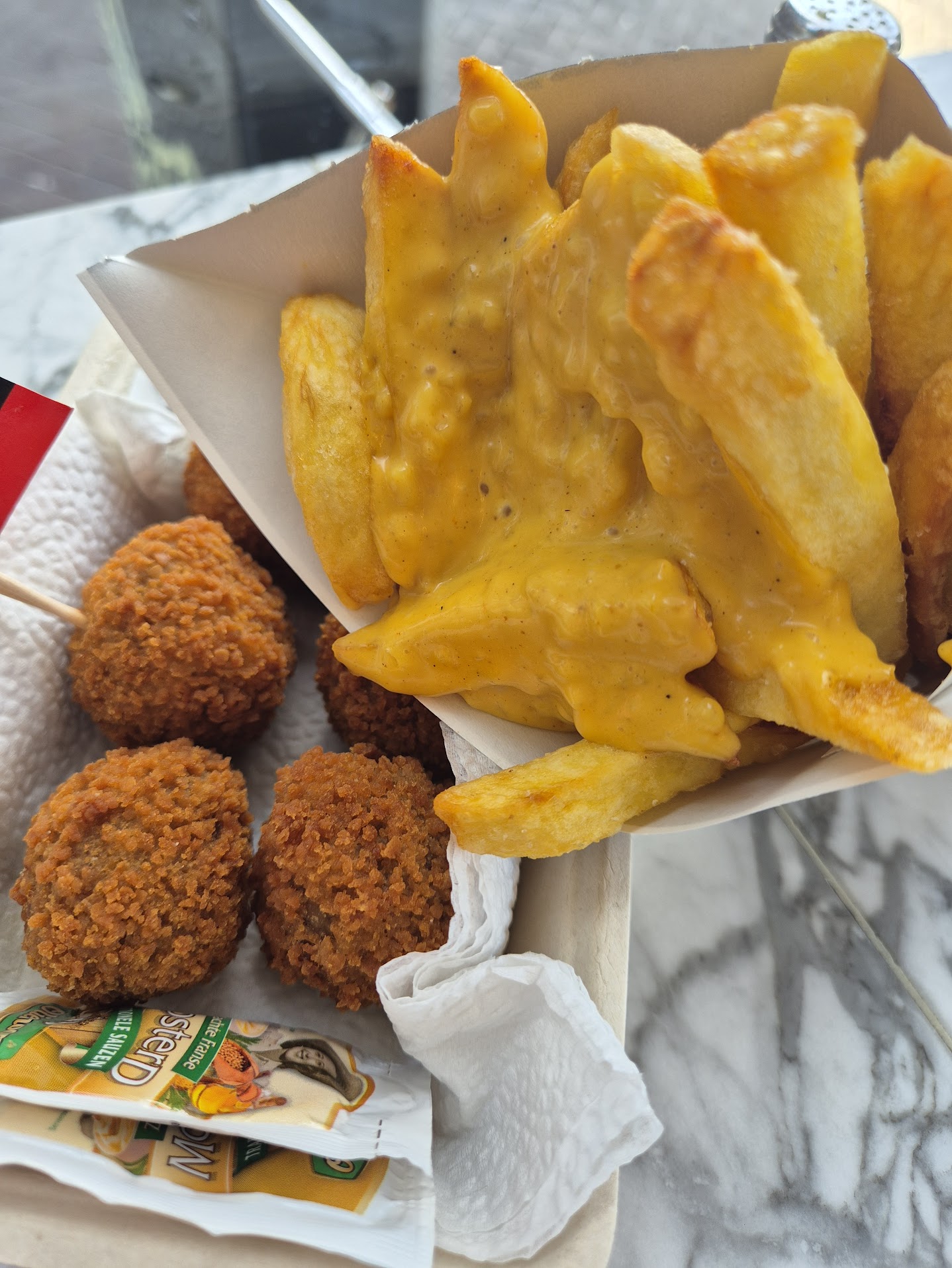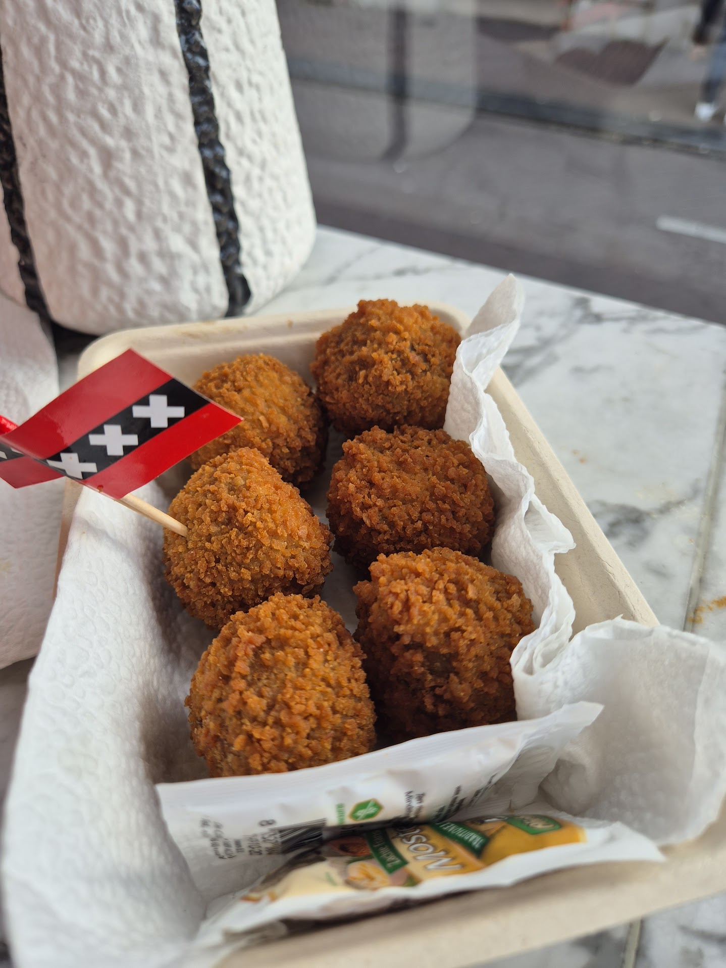 Δίπλα στις fries, δοκίμασα και τα περίφημα bitterballen. Μικρές τραγανές μπουκιές με κρεμώδη γέμιση κρέατος, που σερβίρονται με μουστάρδα. Ένα καθαρά ολλανδικό snack, με έντονη γεύση και διαφορετική υφή.