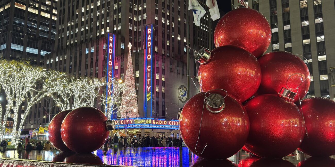 Στην καρδιά του Μανχάταν, μπροστά από το εμβληματικό Radio City Music Hall, η Νέα Υόρκη λάμπει πιο πολύ από ποτέ. Οι τεράστιες κόκκινες μπάλες και οι φωτισμένοι ουρανοξύστες γύρω από το Rockefeller Center δημιουργούν ένα σκηνικό που μοιάζει βγαλμένο από χριστουγεννιάτικη ταινία.