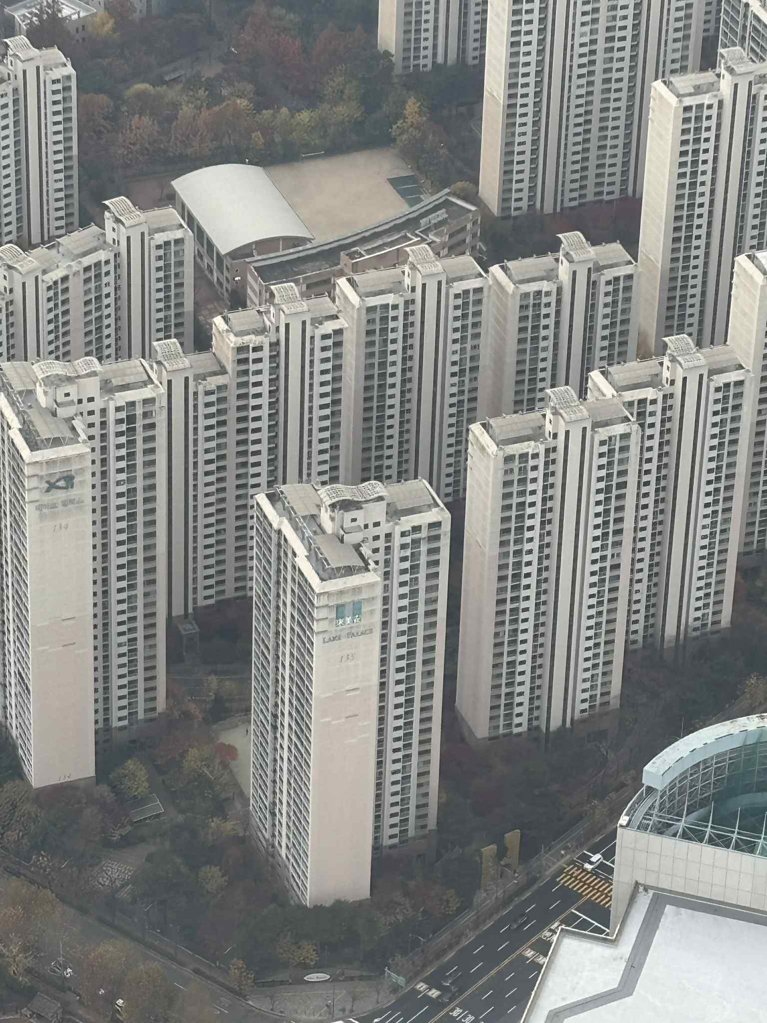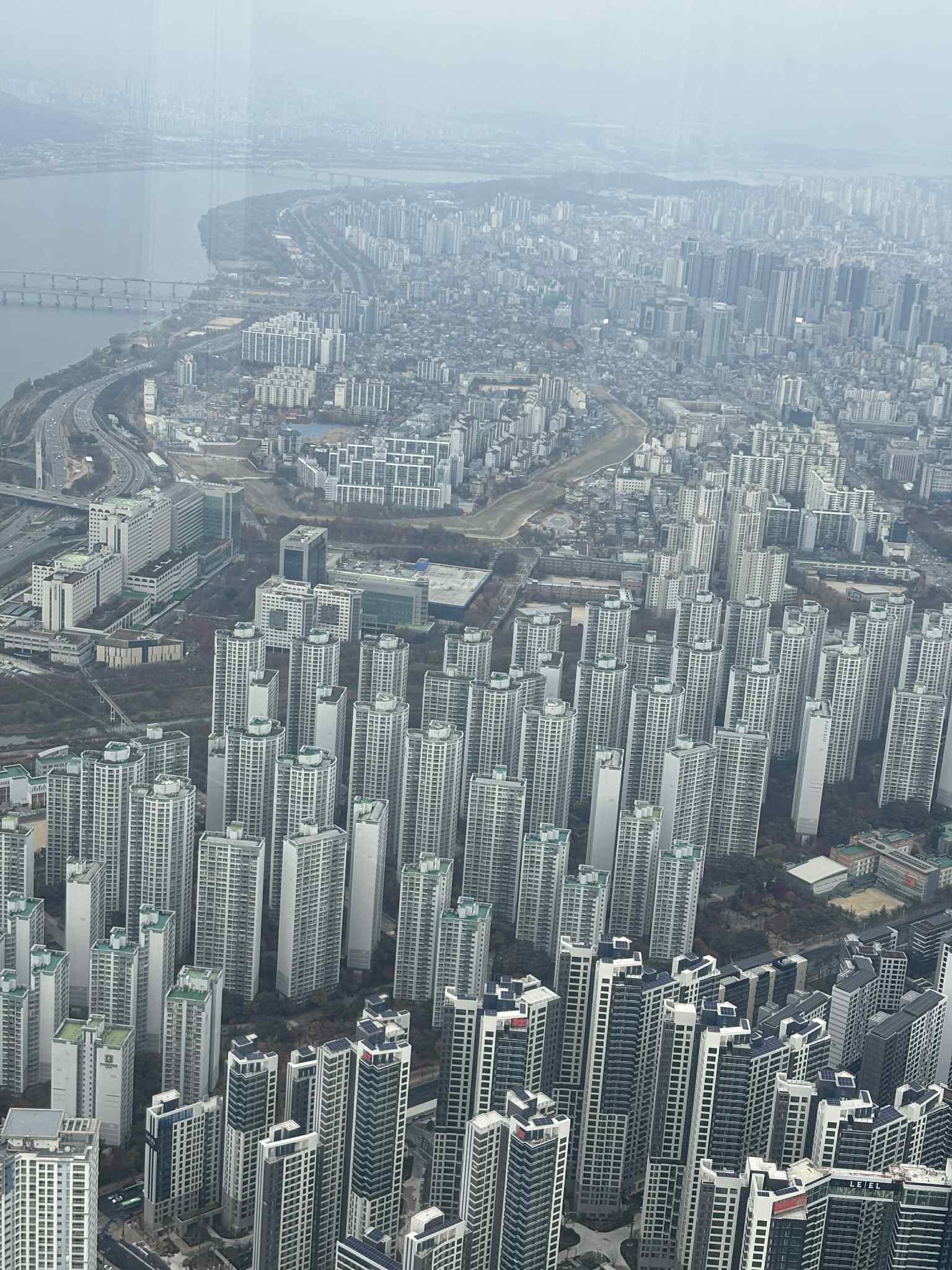 Ο ποταμός Han διασχίζει την πόλη σαν ασημένια κορδέλα, με τις γέφυρες να ενώνουν διαφορετικούς κόσμους. Σειρές από πολυκατοικίες, σχεδόν πανομοιότυπες αλλά ταυτόχρονα μοναδικές, δημιουργούν ένα γεωμετρικό μοτίβο που μοιάζει ατελείωτο. Ανάμεσά τους, μικρές γειτονιές, δρόμοι, πάρκα και κτίρια χαμηλότερα, συνθέτουν ένα αστικό μωσαϊκό που δεν σταματά να κινείται.
