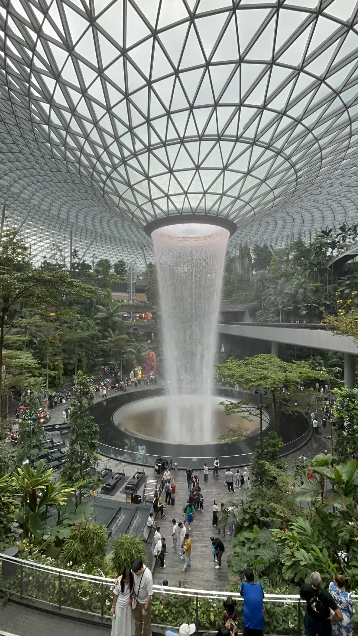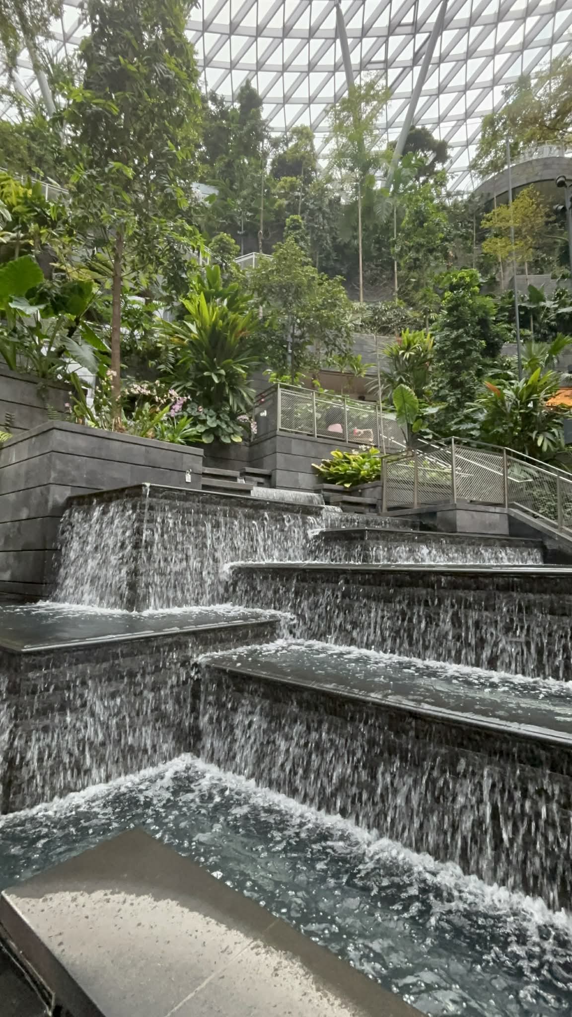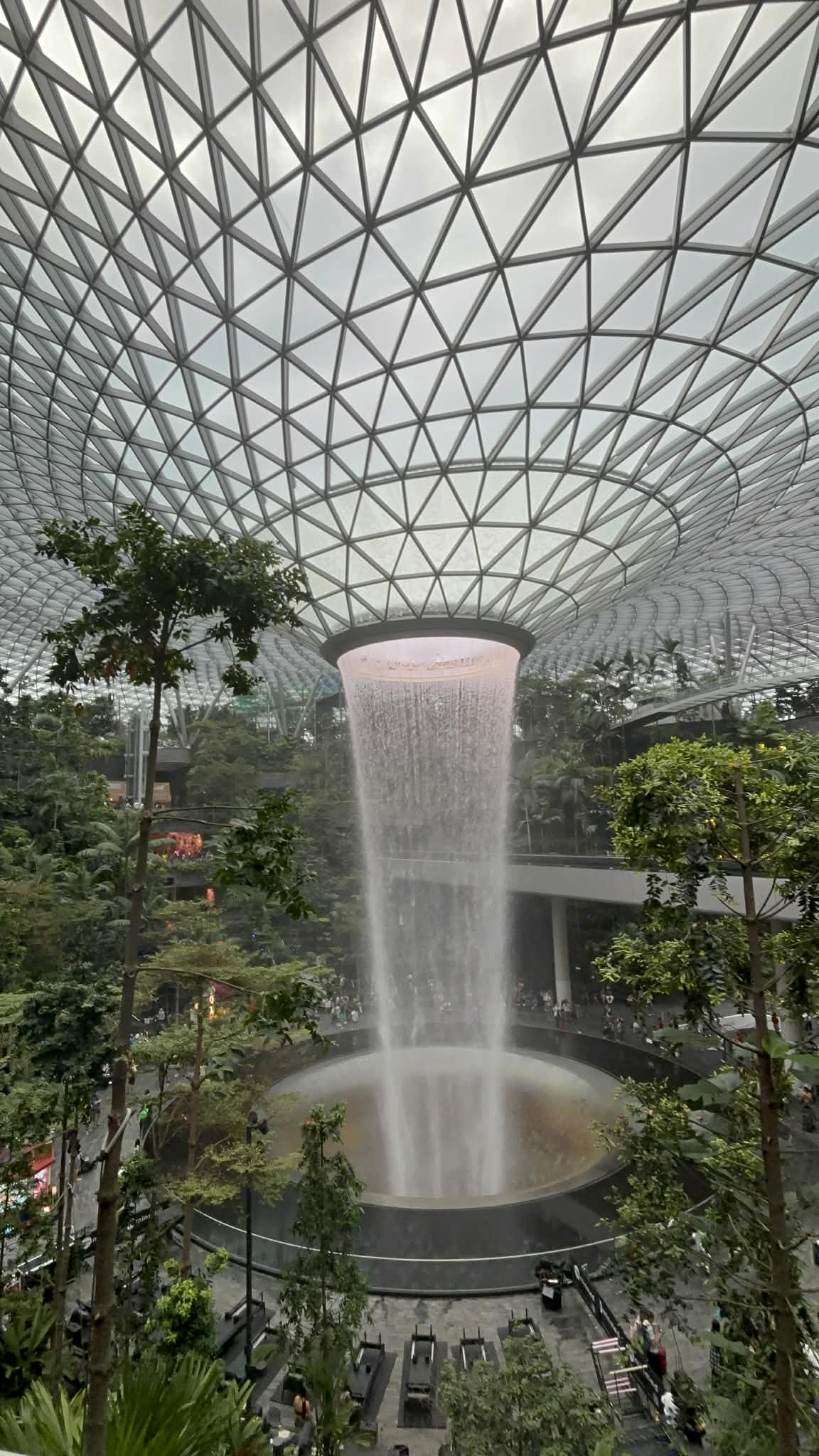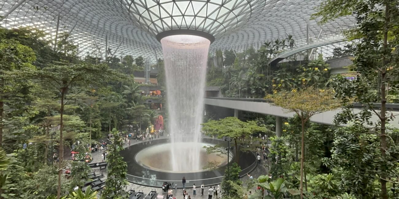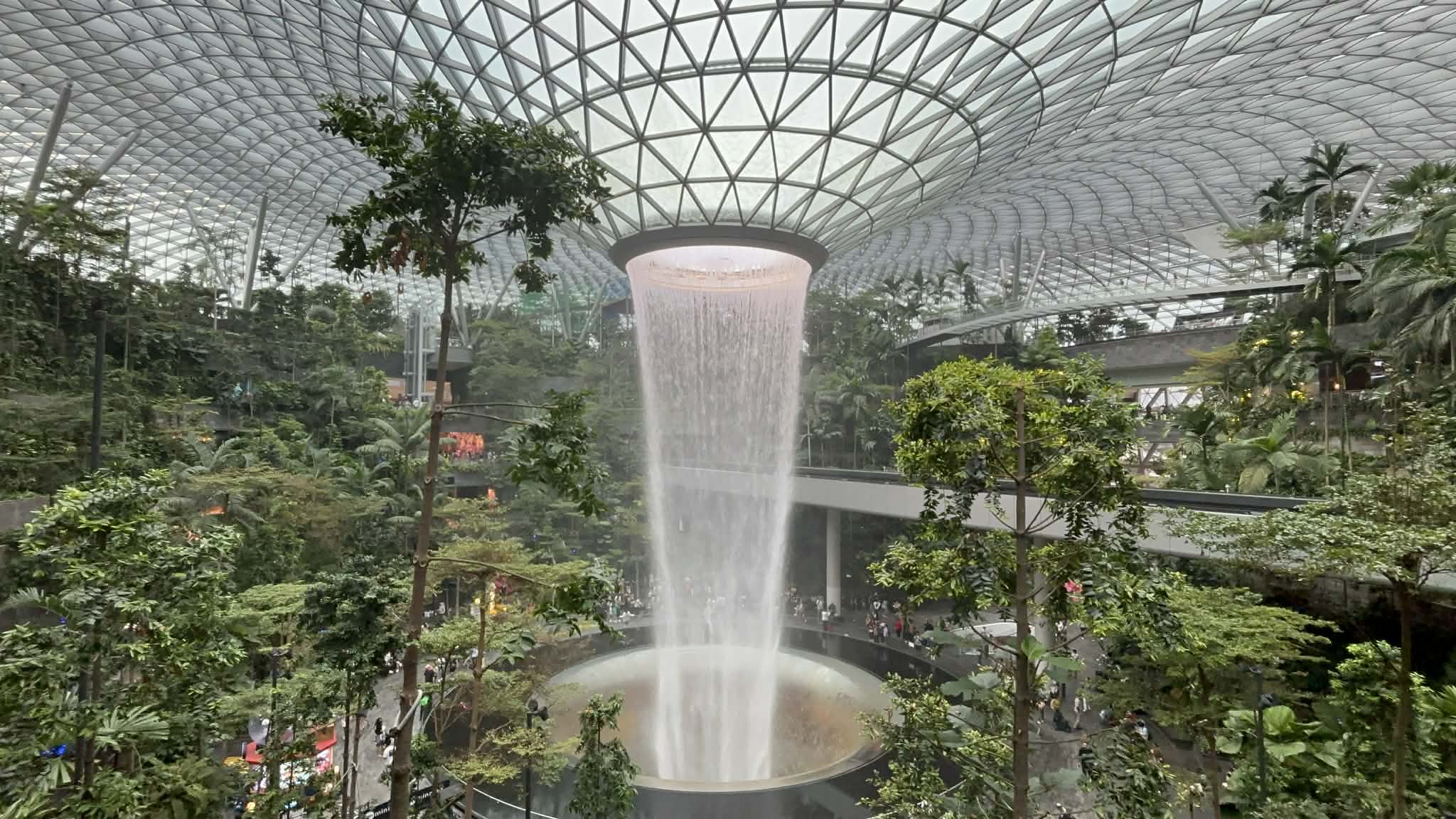 Μπαίνοντας στο Jewel, το βλέμμα μου σταμάτησε απότομα. Μπροστά μου άνοιγε ένας τεράστιος εσωτερικός χώρος που έμοιαζε περισσότερο με σκηνικό από ταινία παρά με αεροδρόμιο. Και στο κέντρο… ένας καταρράκτης. Όχι απλά εντυπωσιακός. Επιβλητικός. Ο Rain Vortex, ο ψηλότερος εσωτερικός καταρράκτης στον κόσμο, πέφτει από ύψος περίπου 40 μέτρων μέσα σε έναν κυκλικό χώρο που μοιάζει να “αναπνέει” μαζί με το νερό.
