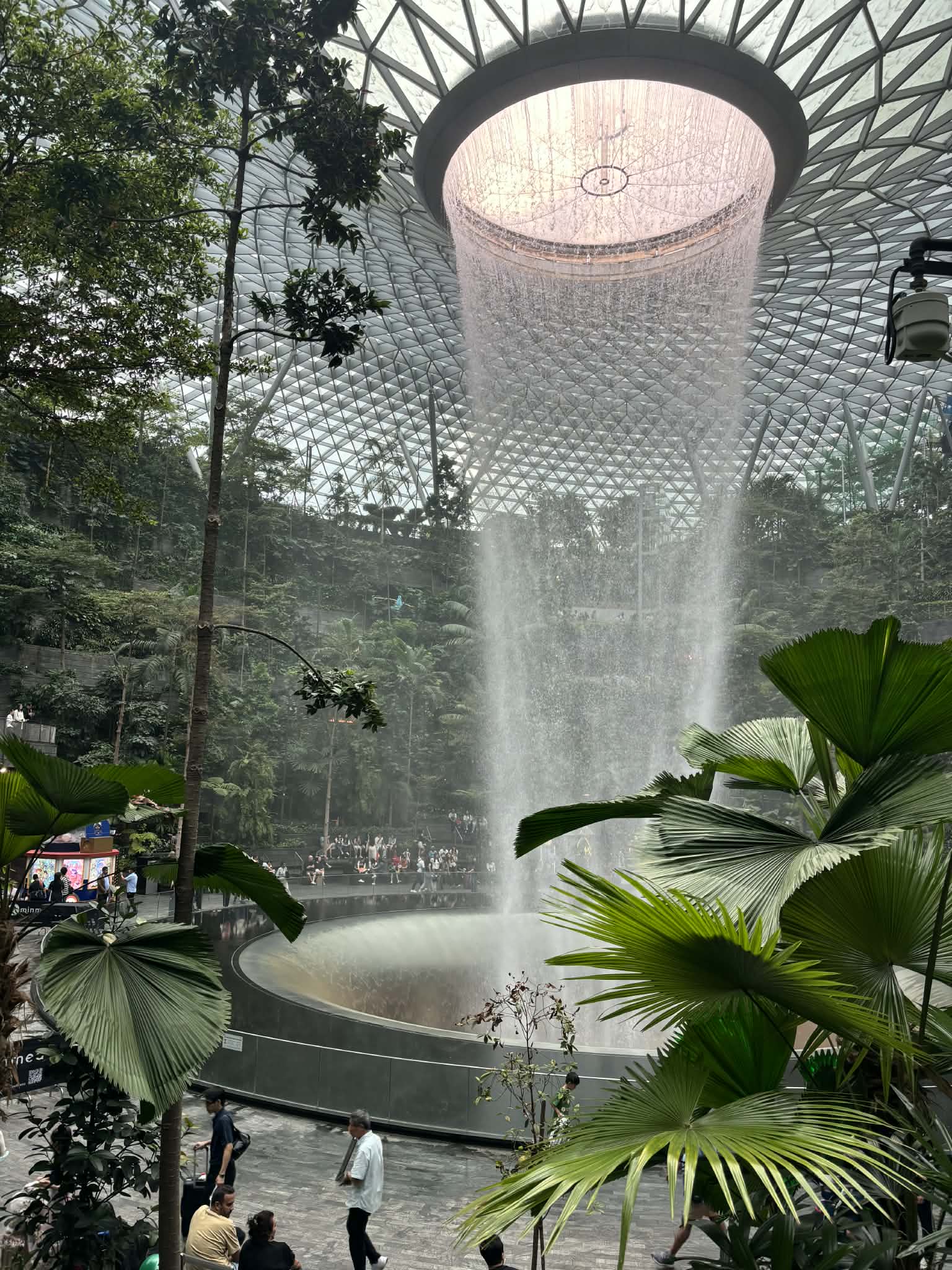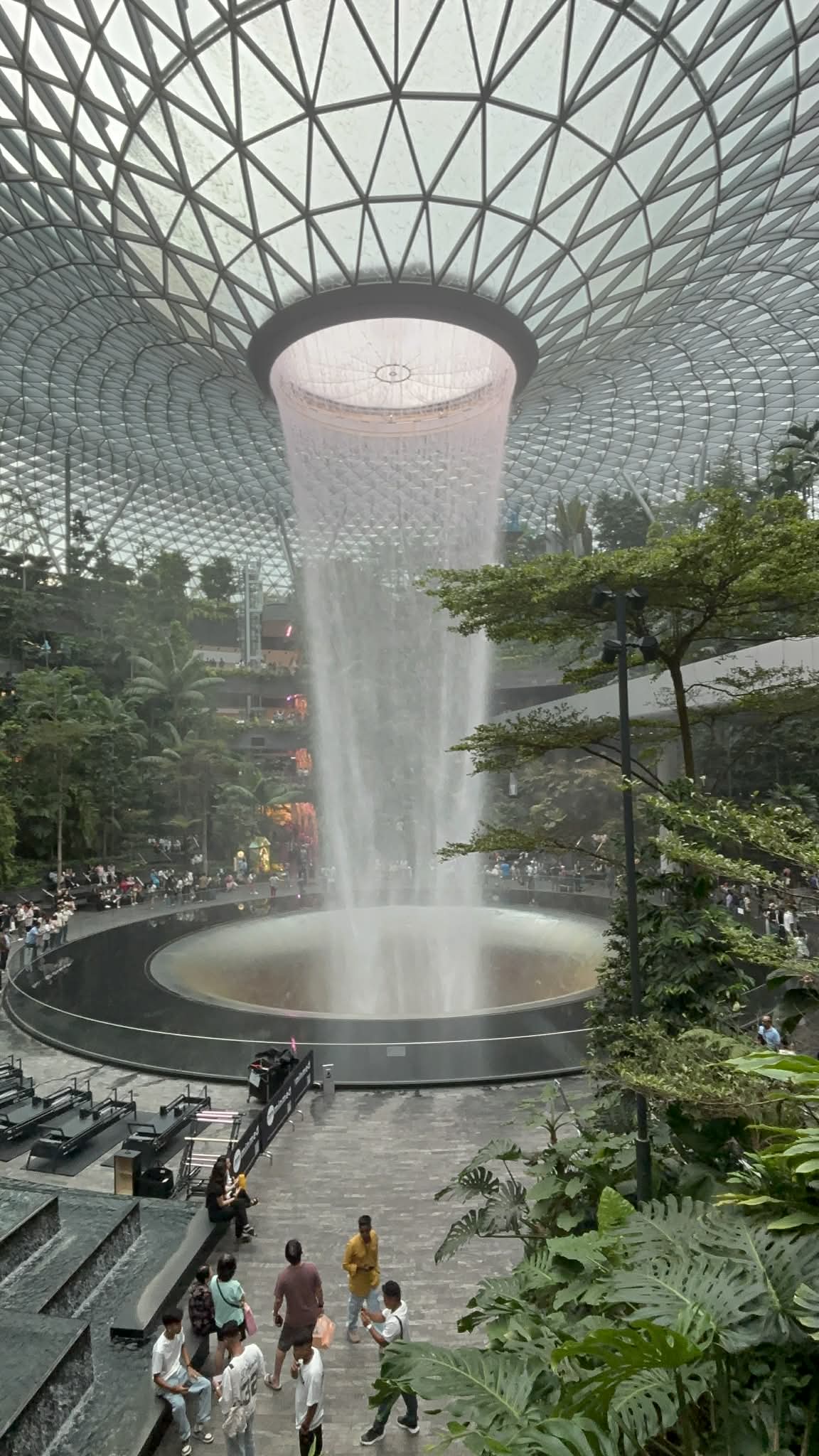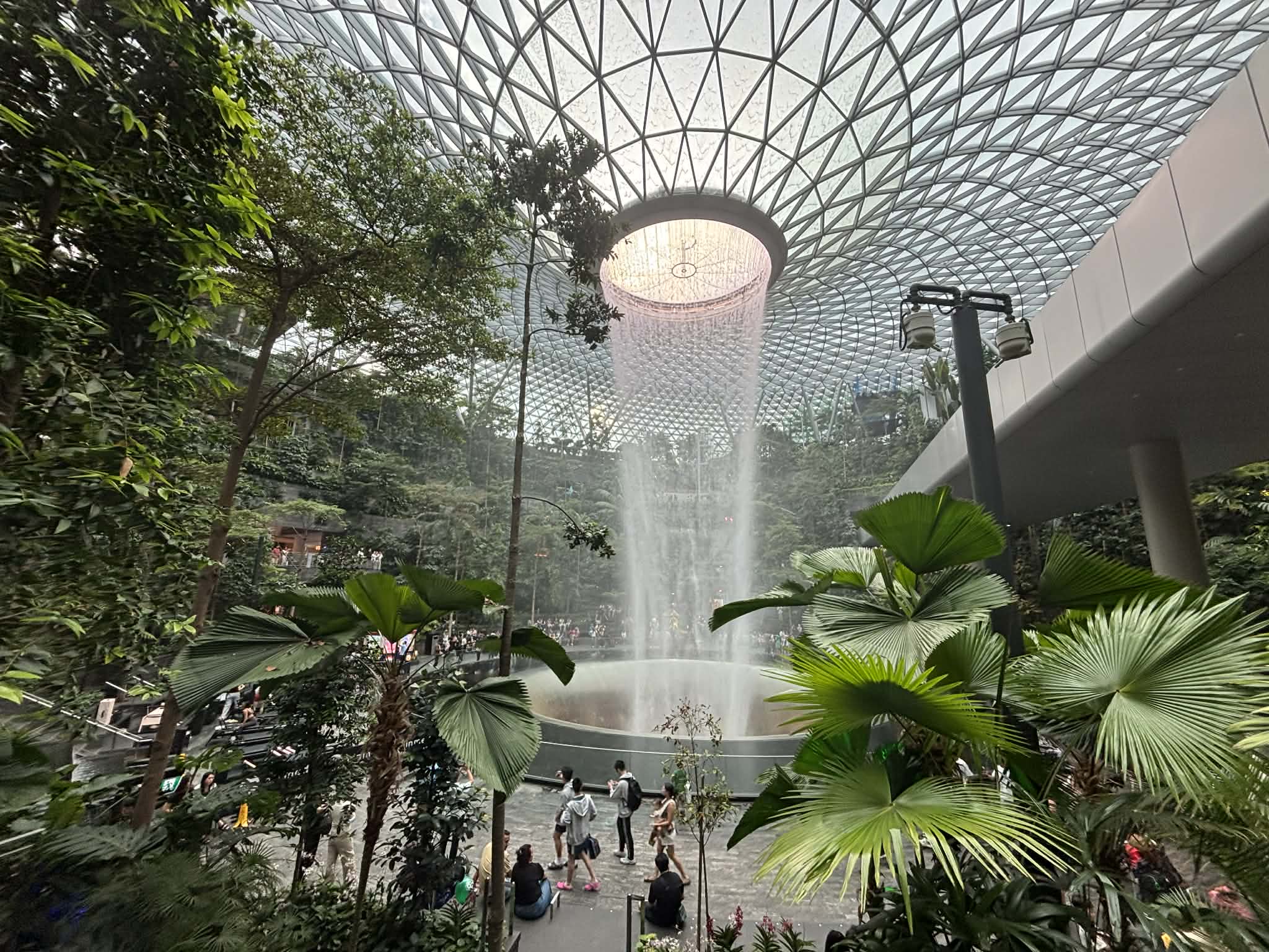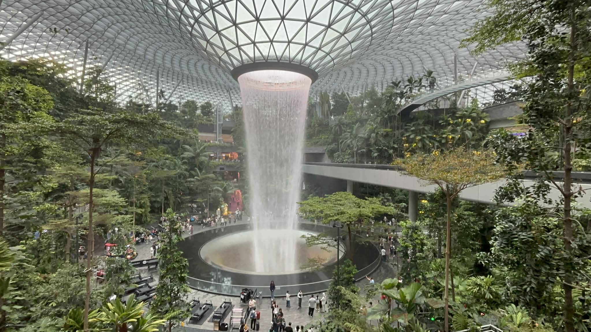 Μπαίνοντας στο Jewel, το βλέμμα μου σταμάτησε απότομα. Μπροστά μου άνοιγε ένας τεράστιος εσωτερικός χώρος που έμοιαζε περισσότερο με σκηνικό από ταινία παρά με αεροδρόμιο. Και στο κέντρο… ένας καταρράκτης. Όχι απλά εντυπωσιακός. Επιβλητικός. Ο Rain Vortex, ο ψηλότερος εσωτερικός καταρράκτης στον κόσμο, πέφτει από ύψος περίπου 40 μέτρων μέσα σε έναν κυκλικό χώρο που μοιάζει να “αναπνέει” μαζί με το νερό.
