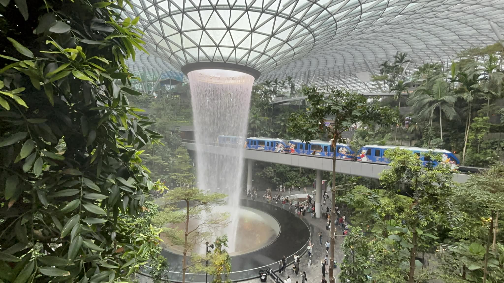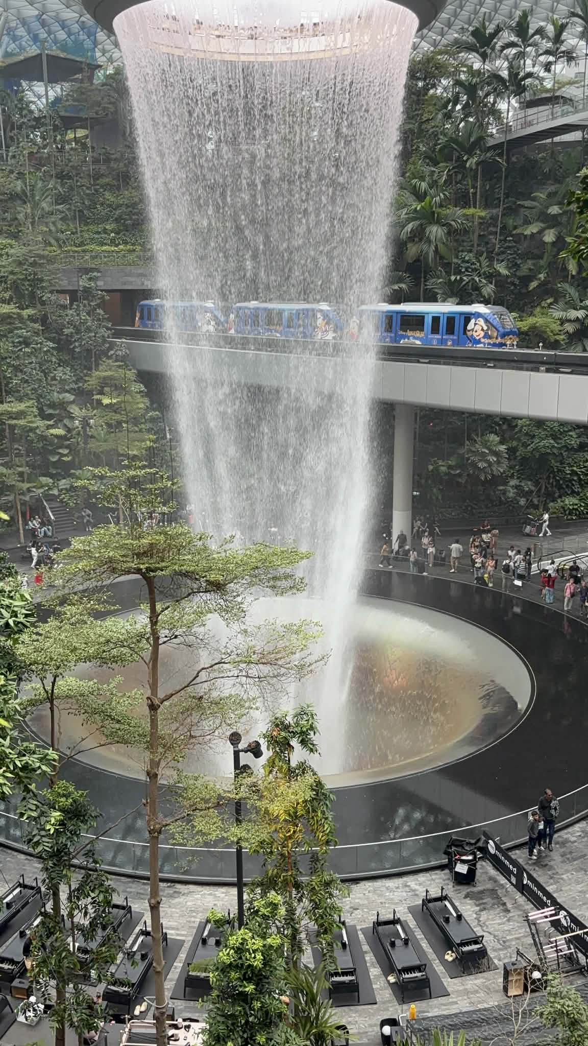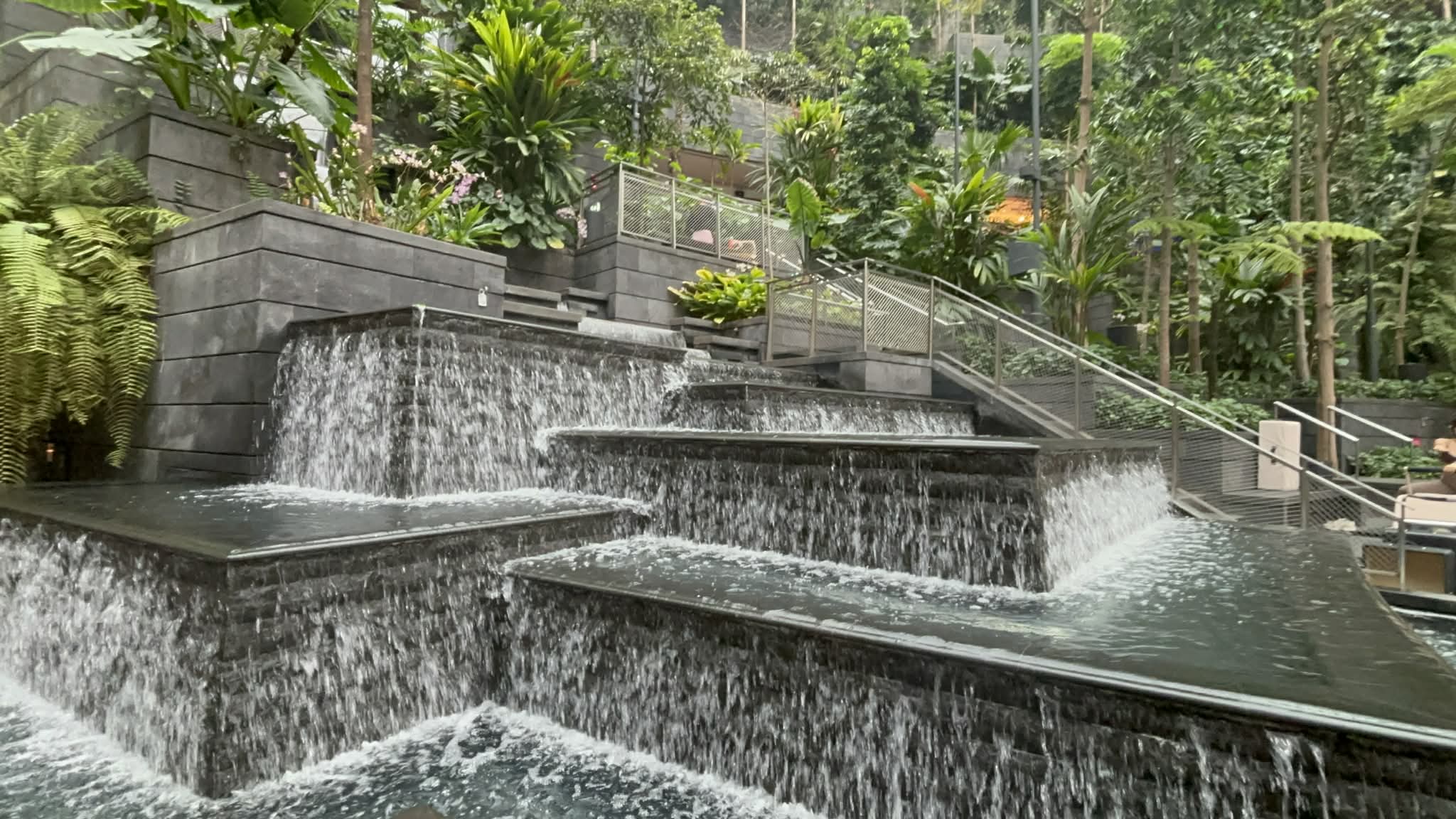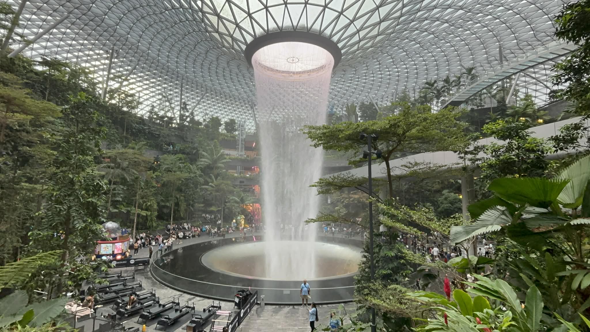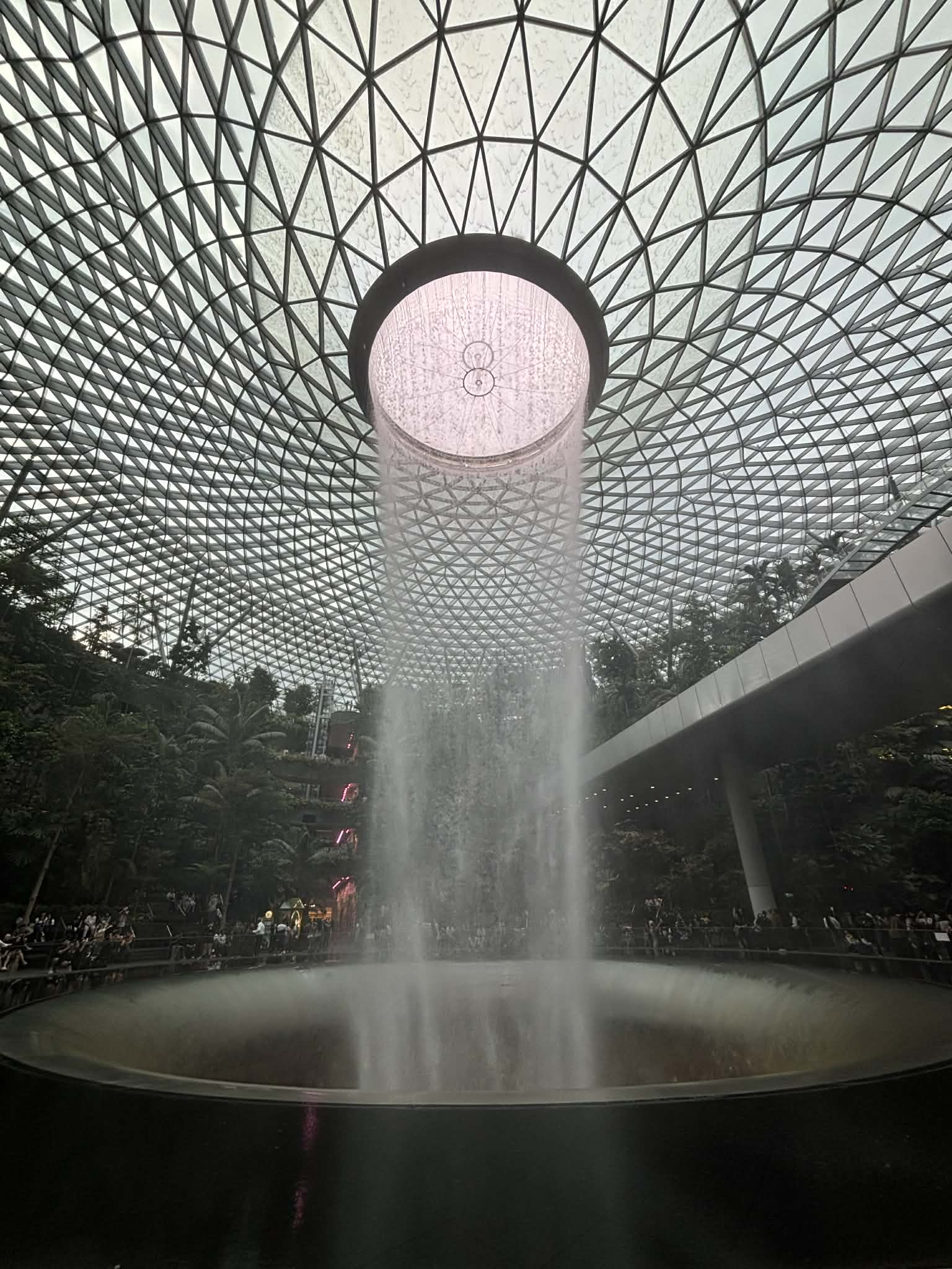 Μπαίνοντας στο Jewel, το βλέμμα μου σταμάτησε απότομα. Μπροστά μου άνοιγε ένας τεράστιος εσωτερικός χώρος που έμοιαζε περισσότερο με σκηνικό από ταινία παρά με αεροδρόμιο. Και στο κέντρο… ένας καταρράκτης. Όχι απλά εντυπωσιακός. Επιβλητικός. Ο Rain Vortex, ο ψηλότερος εσωτερικός καταρράκτης στον κόσμο, πέφτει από ύψος περίπου 40 μέτρων μέσα σε έναν κυκλικό χώρο που μοιάζει να “αναπνέει” μαζί με το νερό.