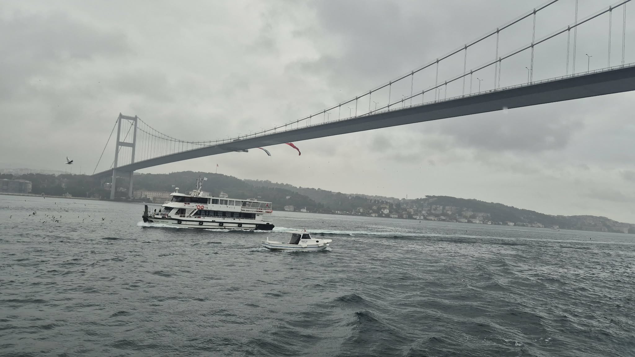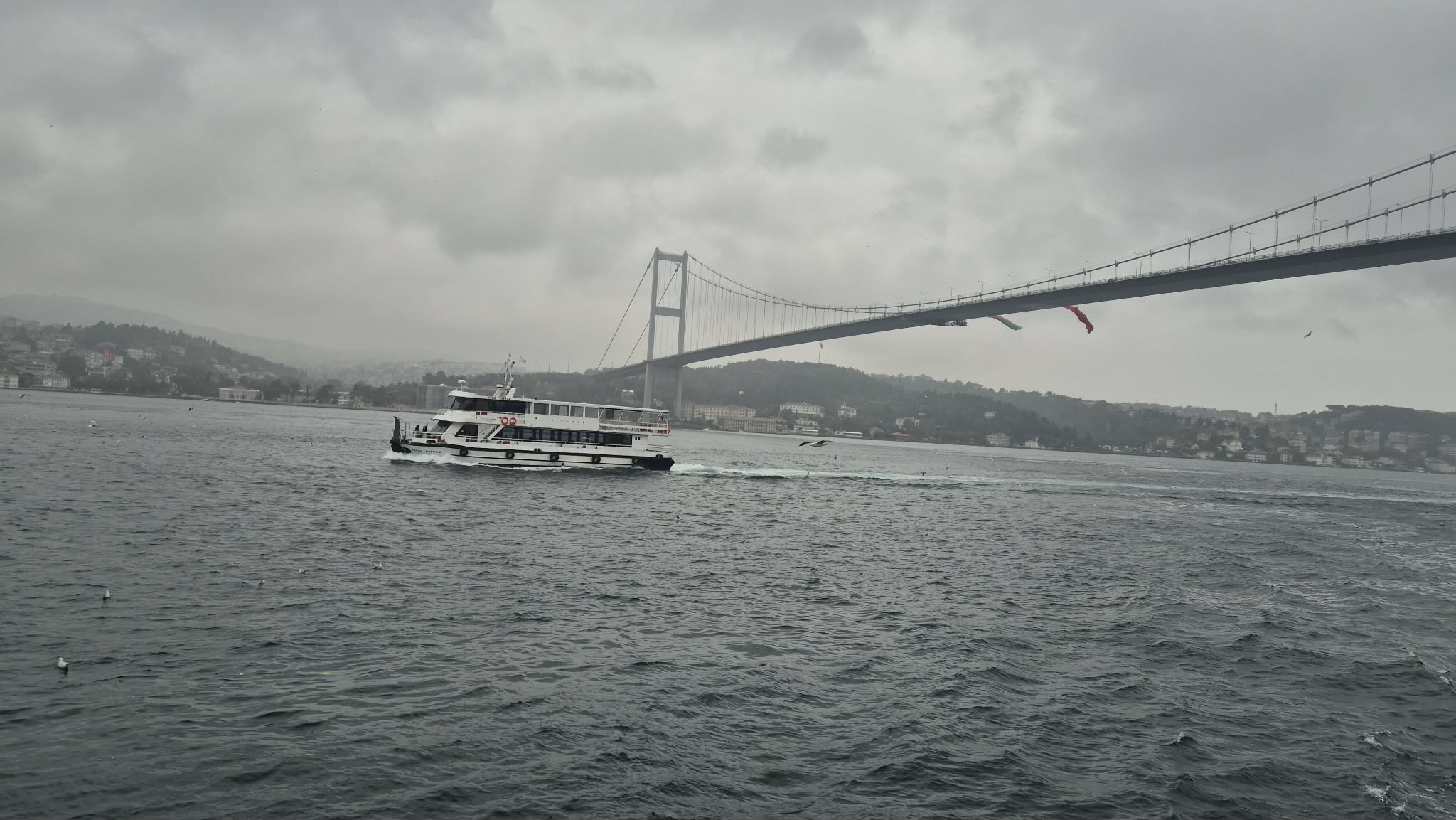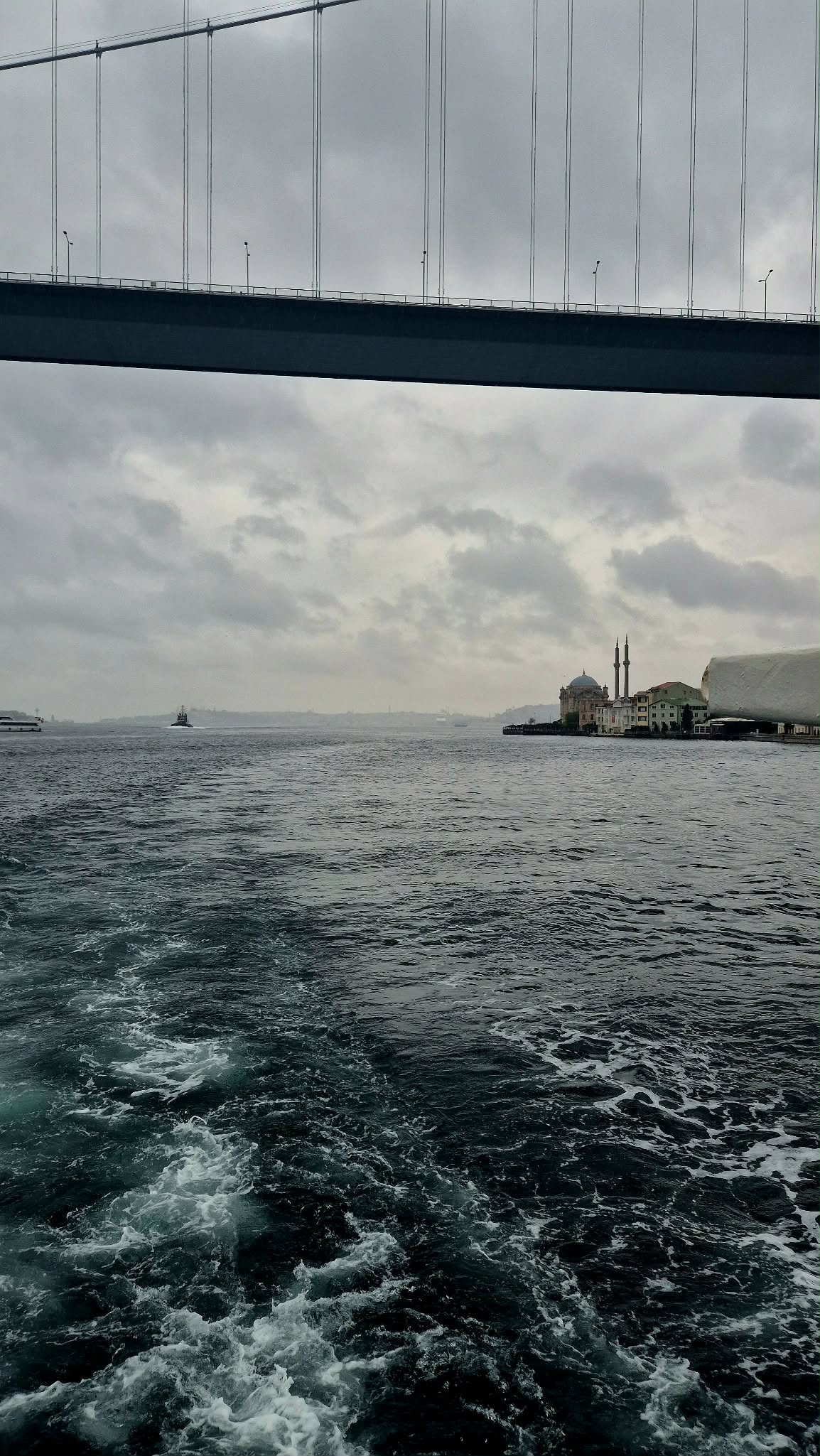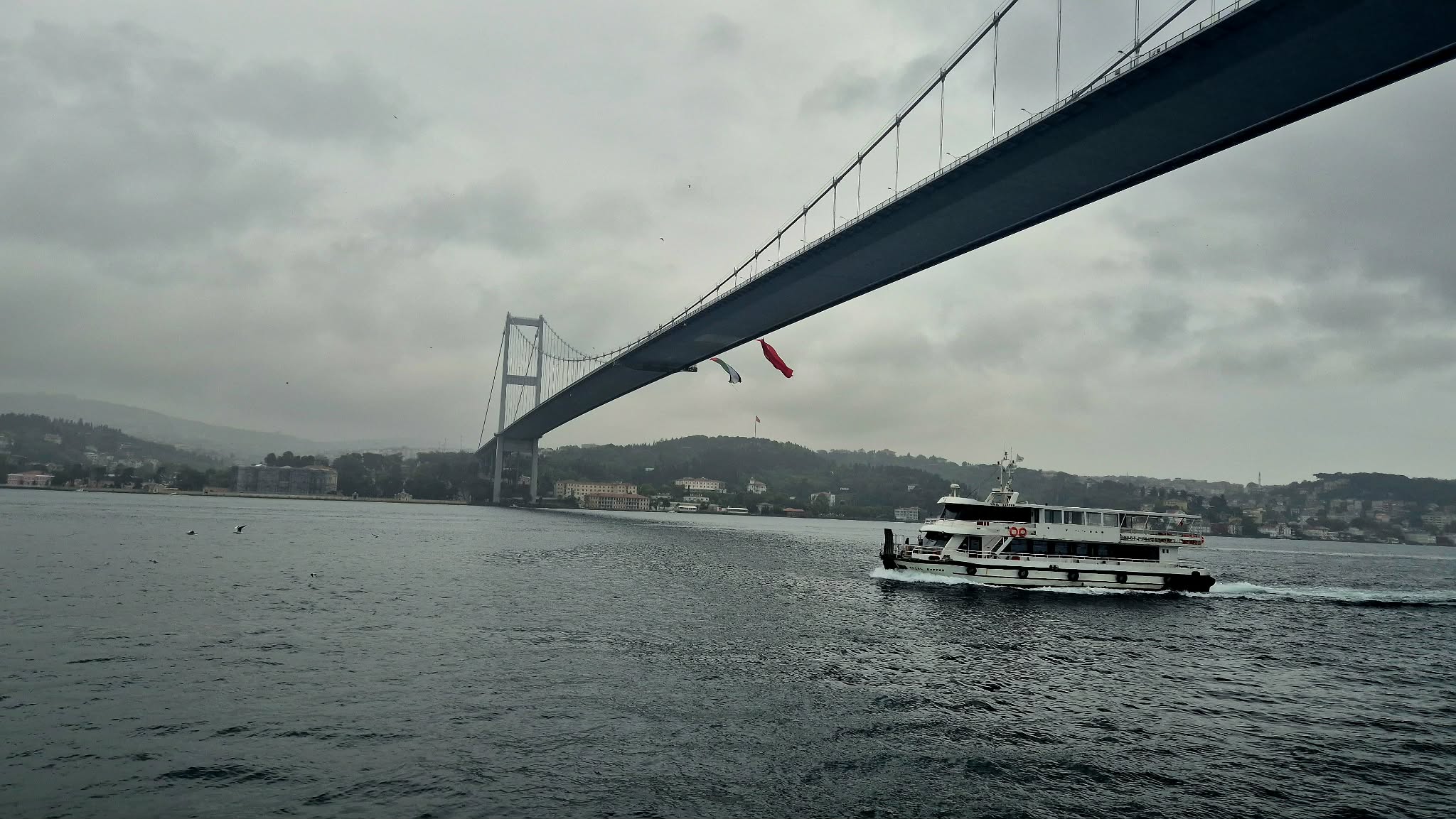 Η γέφυρα εμφανίζεται ξαφνικά και γεμίζει το κάδρο. Τεράστια, βαριά, ενώνει τις δύο όχθες και περνάς από κάτω της χωρίς να σταματήσεις. Πάνω της η πόλη κινείται γρήγορα, από κάτω όλα κυλούν πιο αργά. Η κίνηση συνεχίζεται αδιάλειπτα: επιβατηγά, μικρές βάρκες, μεγάλα πλοία που κινούνται με μετρημένο ρυθμό. Εκεί καταλαβαίνεις ότι βρίσκεσαι ακριβώς ανάμεσα στην Ευρώπη και την Ασία.