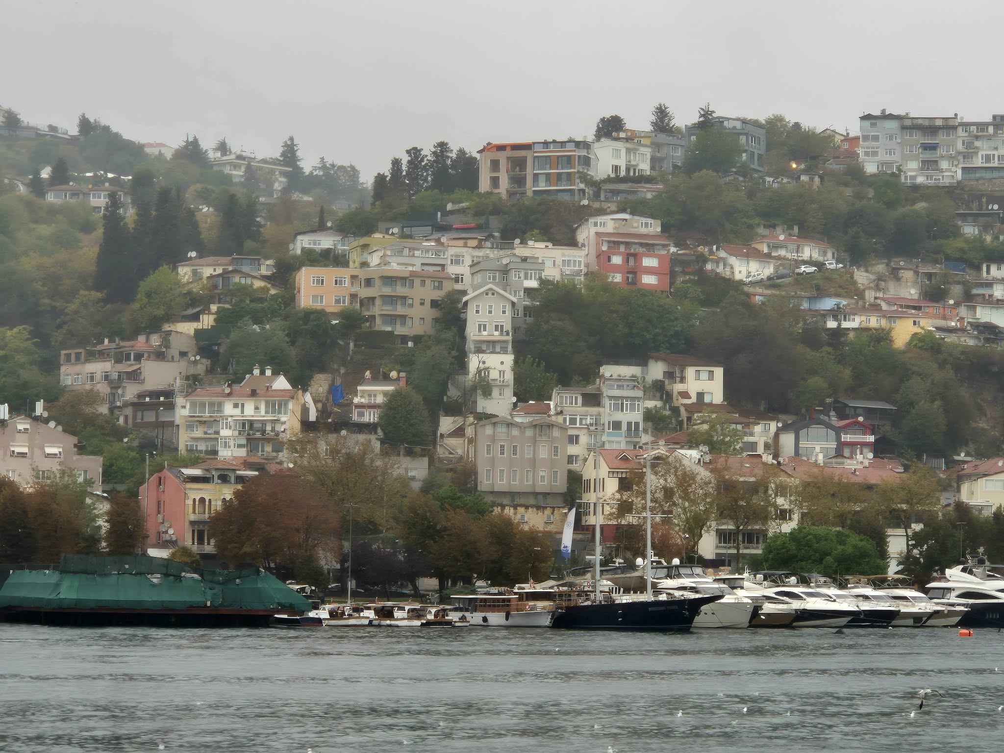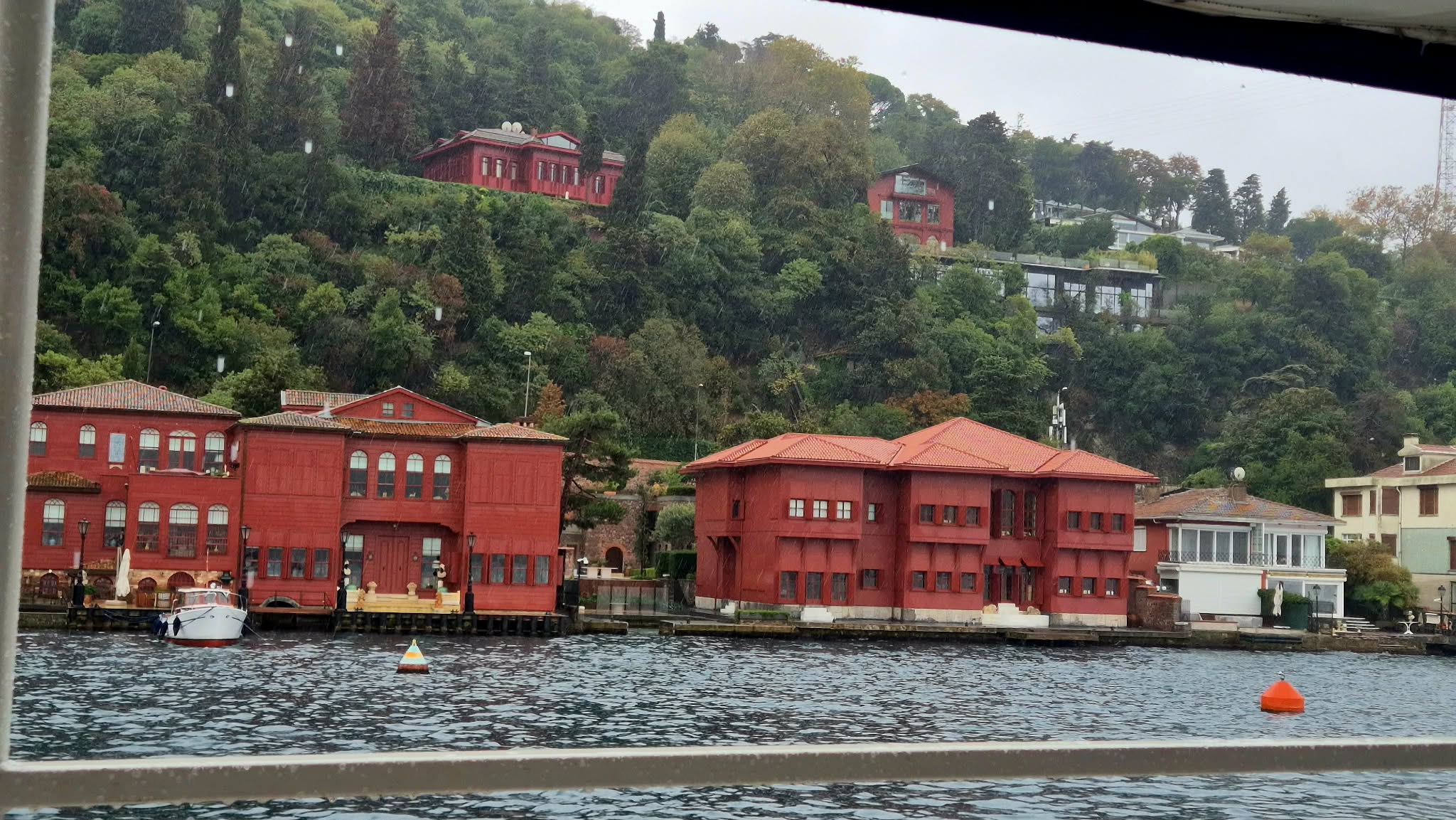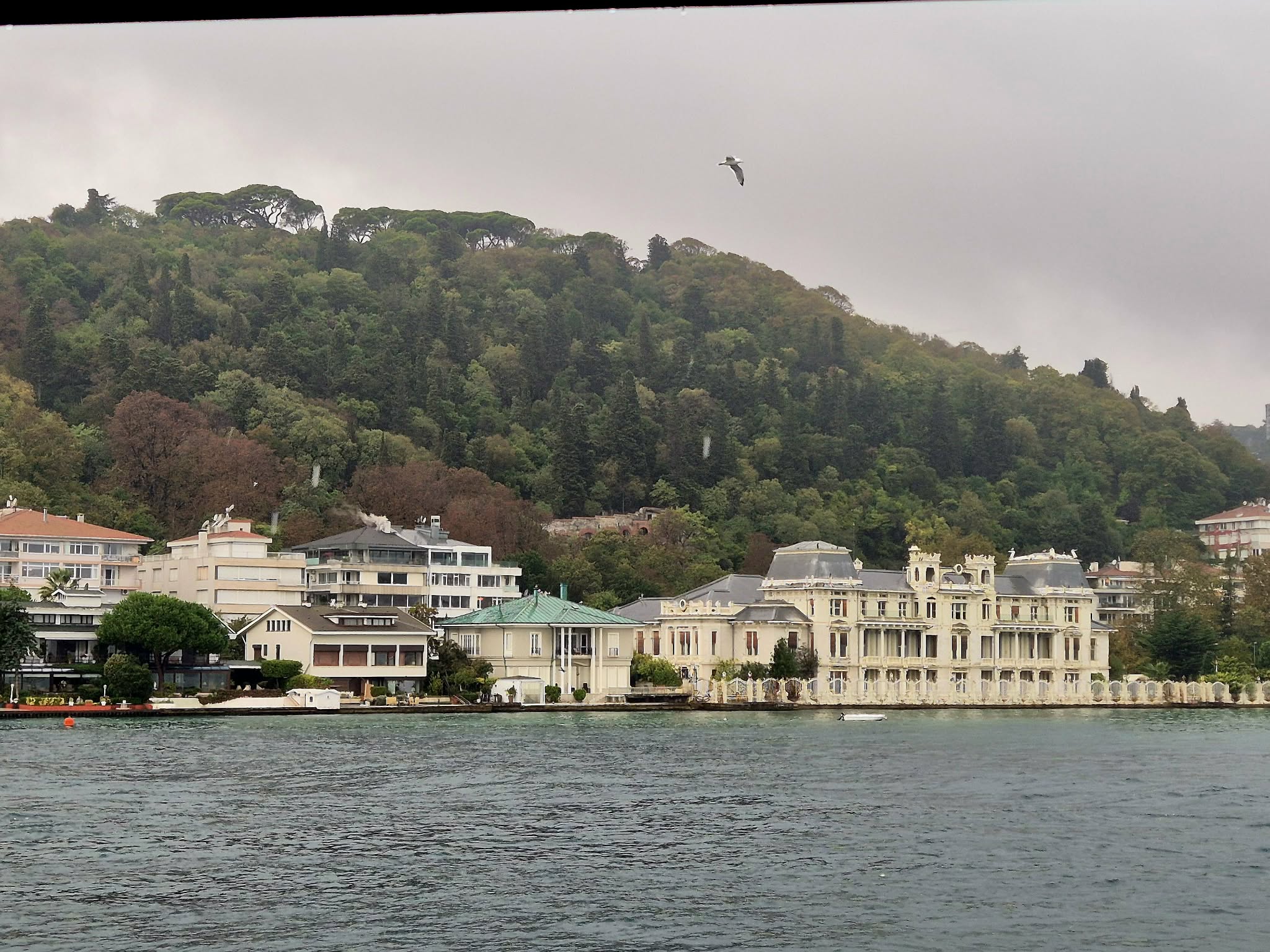 Η προσέγγιση της από το νερό, που μοιάζει σαν φυσικός καθρέφτης για ό,τι έχει χτιστεί δίπλα του, αλλάζει την κλίμακα της πόλης. Οι ακτές πλησιάζουν, οι αποστάσεις μικραίνουν και η Κωνσταντινούπολη αποκαλύπτεται όχι ως μητρόπολη των εκατομμυρίων, αλλά ως μια συνεχής λωρίδα ζωής ανάμεσα στη στεριά και τη θάλασσα. Παλιά αρχοντικά, χαμηλά σπίτια, μεγάλες επαύλεις, όλα στη σειρά, σαν να παρακολουθούν τη διέλευση των καραβιών. Πίσω τους, οι λόφοι ανεβαίνουν απότομα, γεμάτοι δέντρα και διάσπαρτα σπίτια. Στις πλαγιές, παλιές ξύλινες επαύλεις και σύγχρονα κτίρια ακολουθούν τη φυσική κλίση του εδάφους, όλα στραμμένα προς το πέρασμα, όλα σε διάλογο με το νερό.