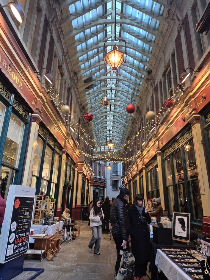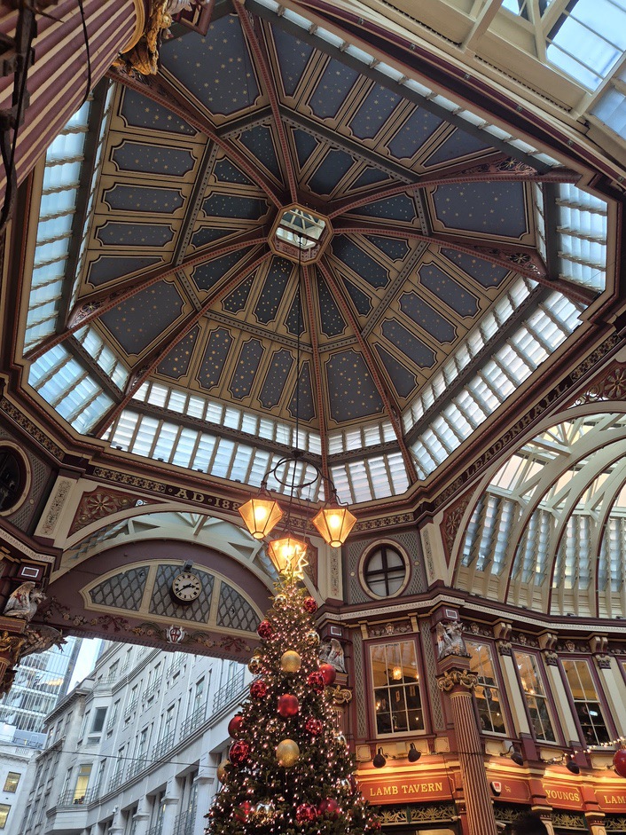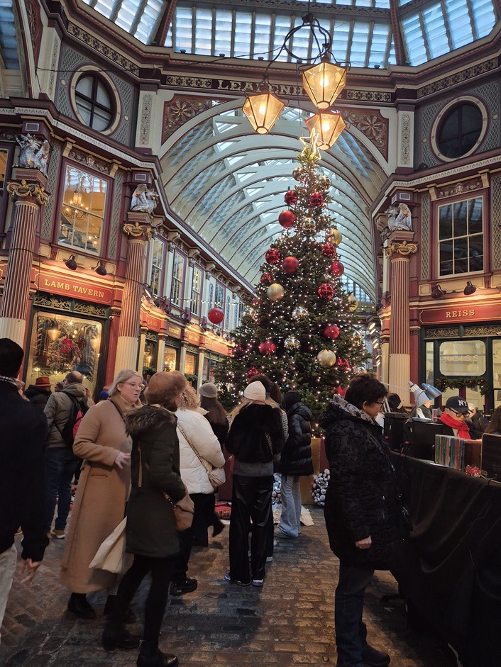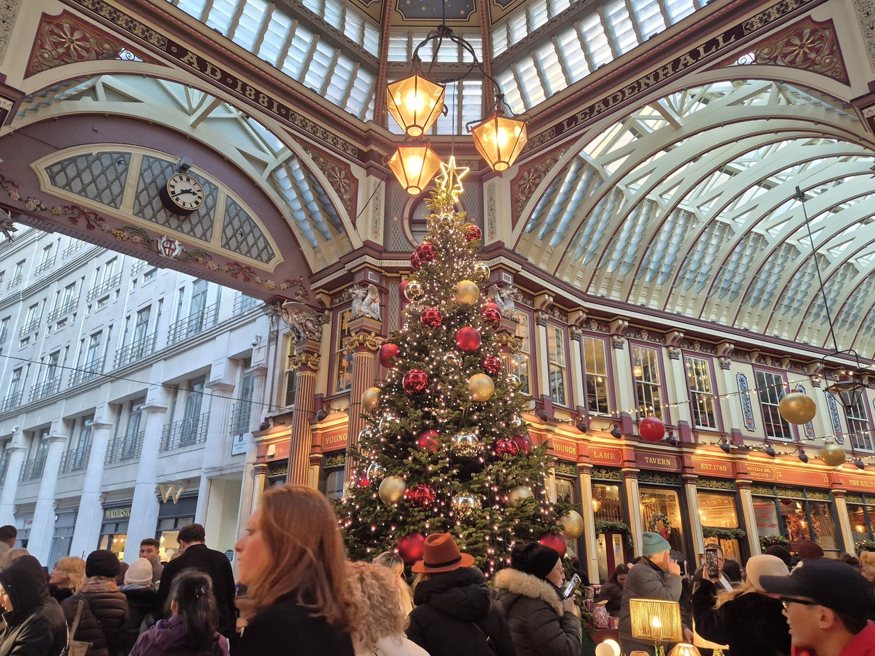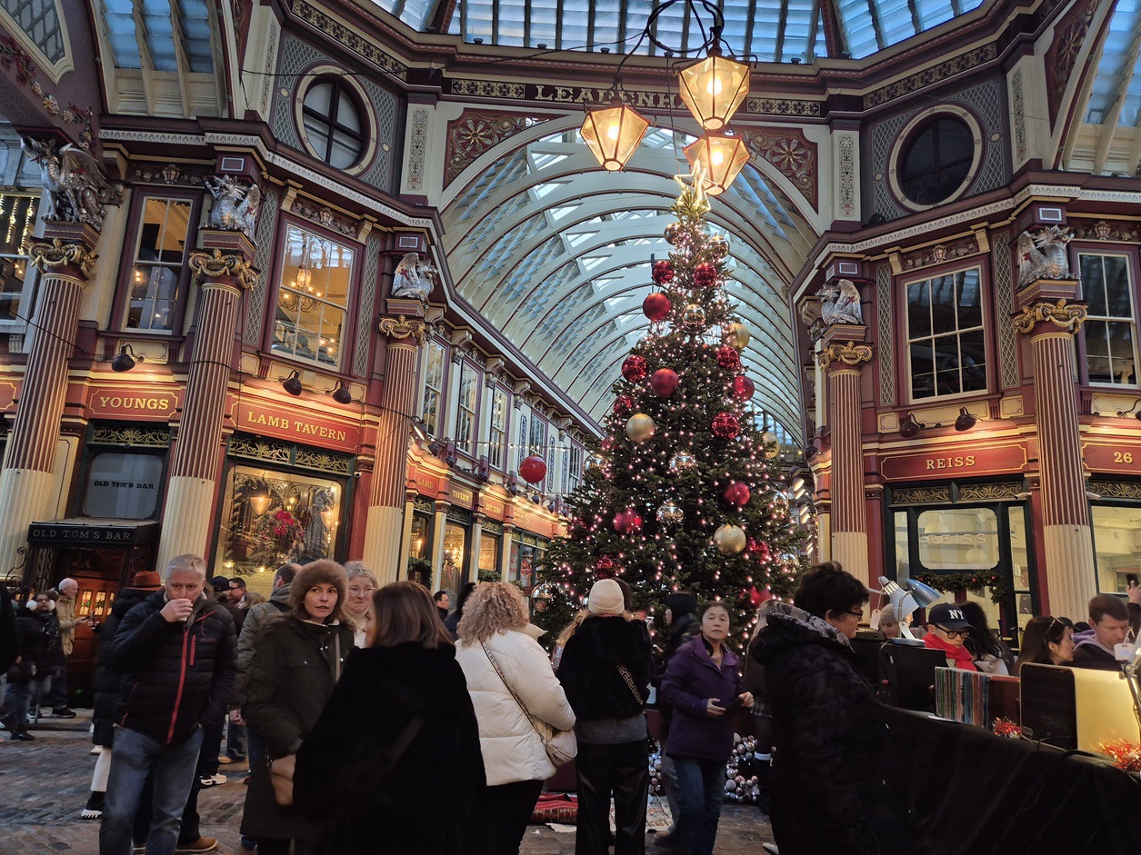 Την περίοδο των γιορτών, το Leadenhall Market μεταμορφώνεται. Φωτάκια, γιρλάντες, χριστουγεννιάτικες μπάλες και ένα εντυπωσιακό δέντρο στο κέντρο της στοάς δημιουργούν μια ατμόσφαιρα ζεστή και γιορτινή, χωρίς υπερβολές. Ο κόσμος κινείται αργά, κρατώντας ζεστό καφέ ή ένα ποτήρι κρασί, ενώ οι pubs και τα μικρά καταστήματα σφύζουν από ζωή.