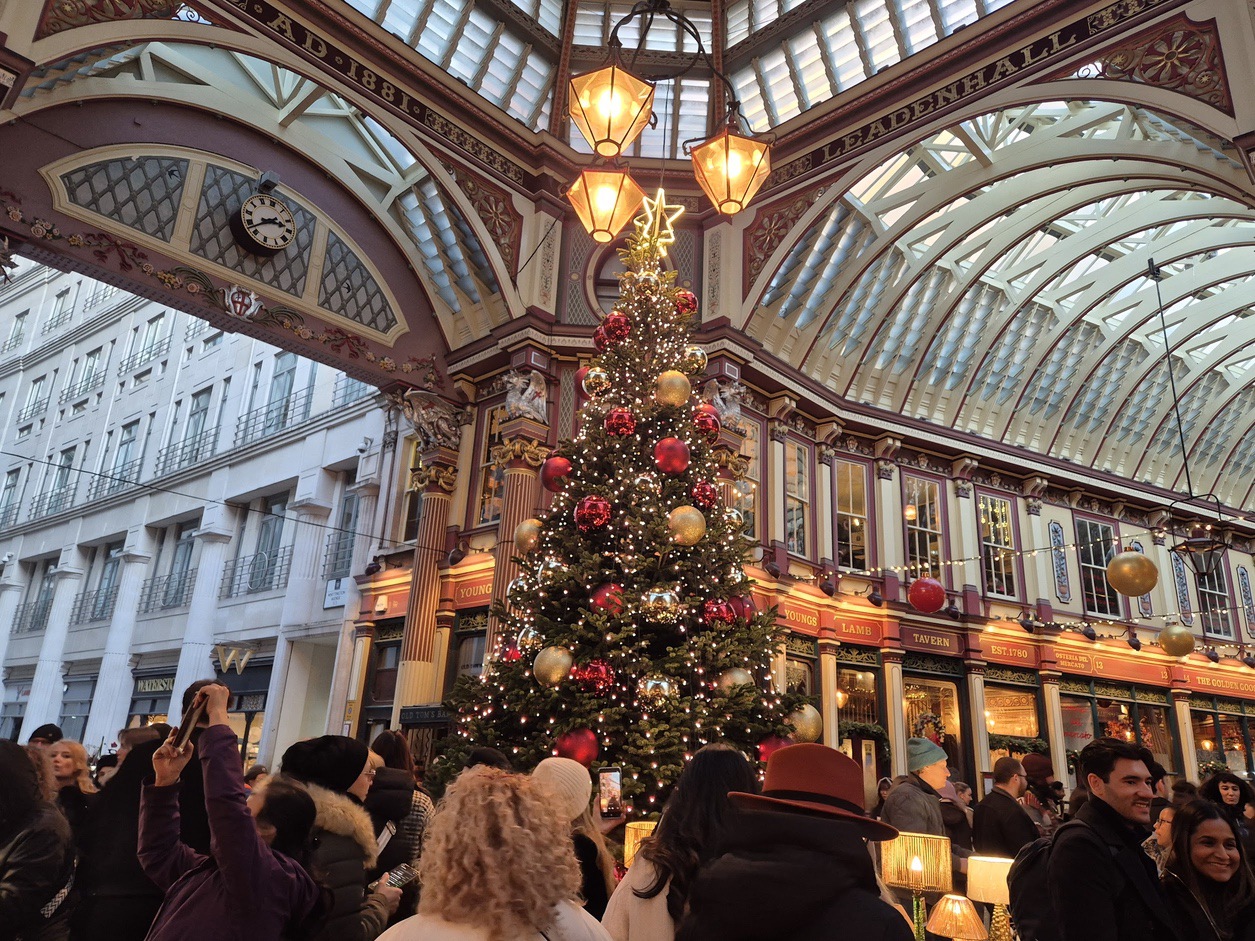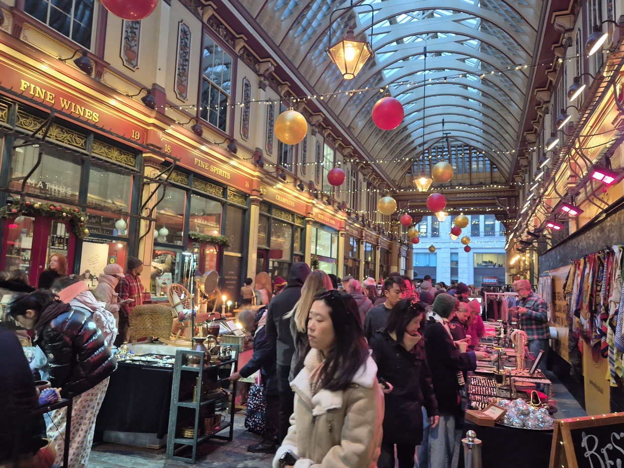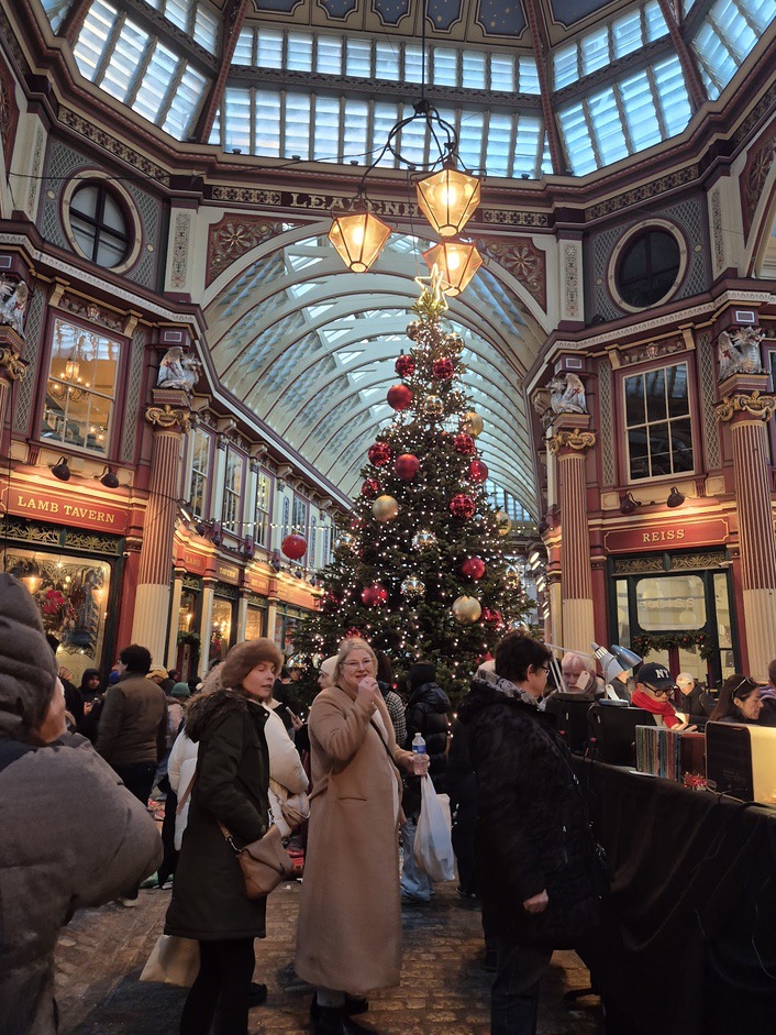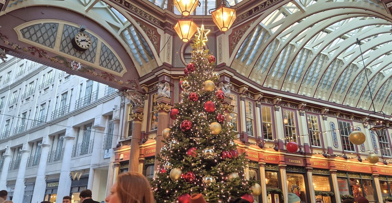 Την περίοδο των γιορτών, το Leadenhall Market μεταμορφώνεται. Φωτάκια, γιρλάντες, χριστουγεννιάτικες μπάλες και ένα εντυπωσιακό δέντρο στο κέντρο της στοάς δημιουργούν μια ατμόσφαιρα ζεστή και γιορτινή, χωρίς υπερβολές. Ο κόσμος κινείται αργά, κρατώντας ζεστό καφέ ή ένα ποτήρι κρασί, ενώ οι pubs και τα μικρά καταστήματα σφύζουν από ζωή.