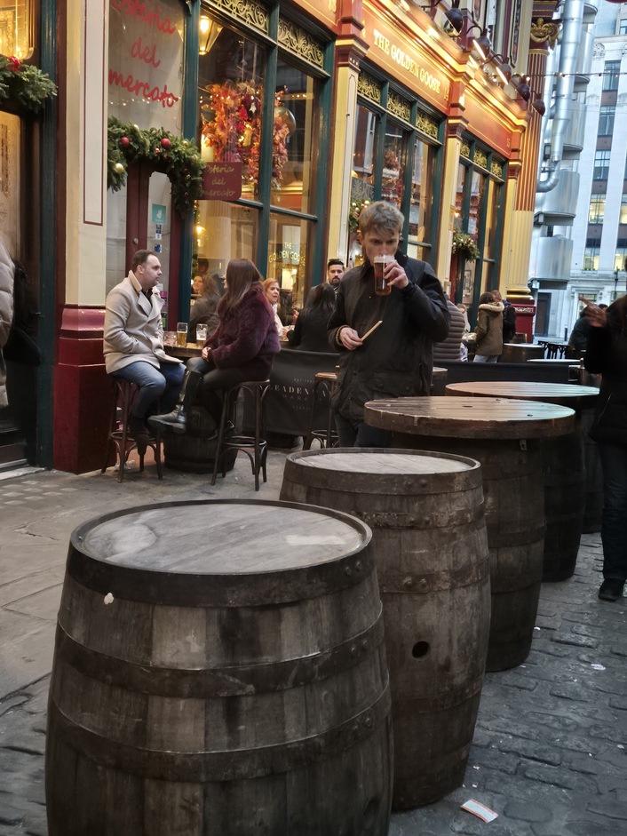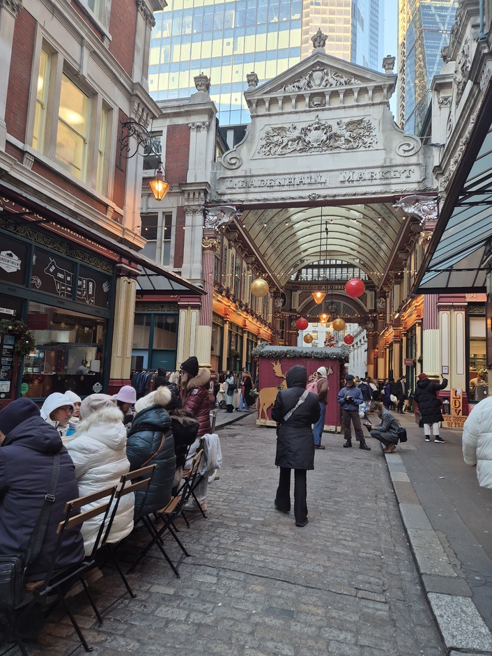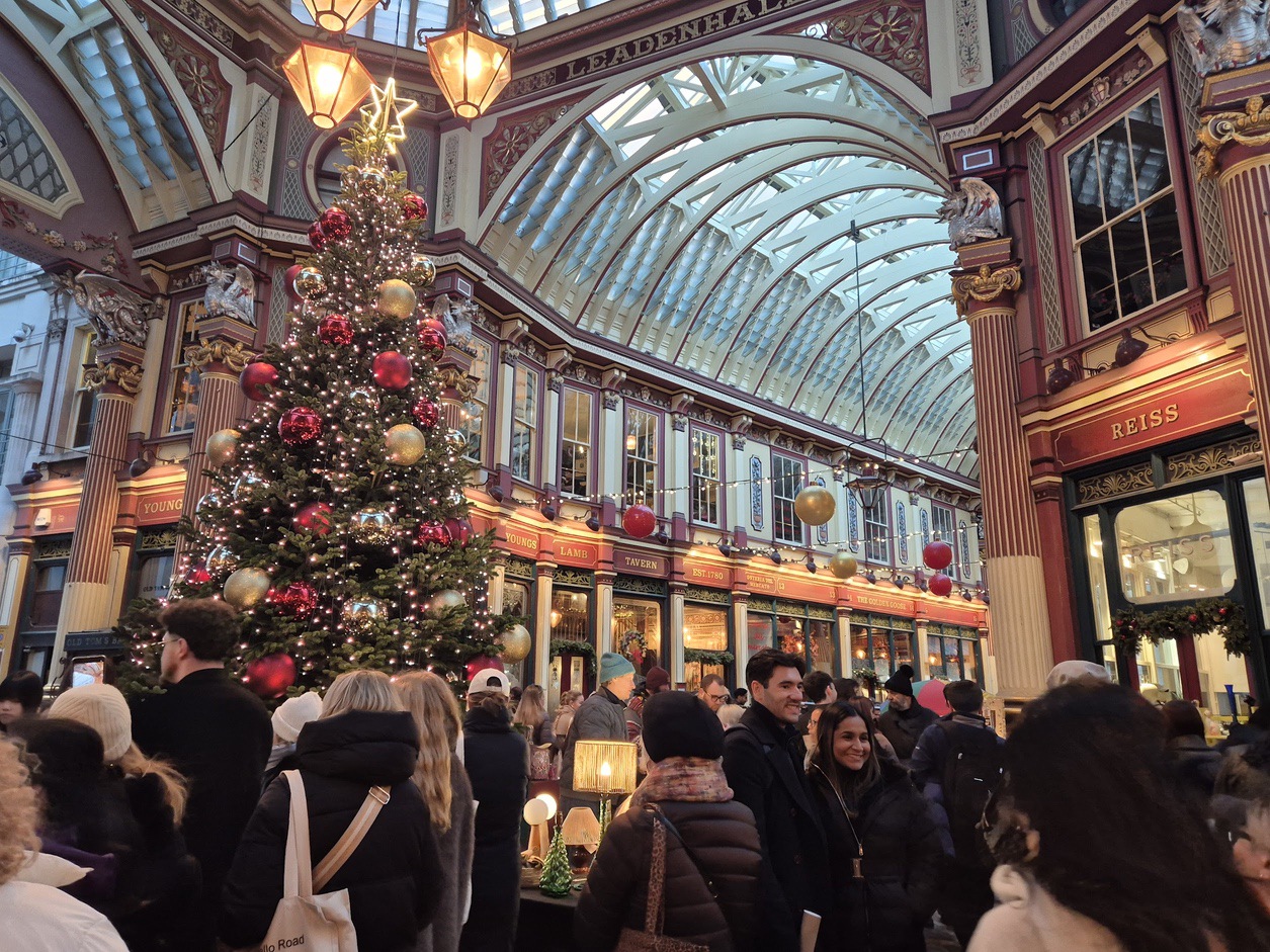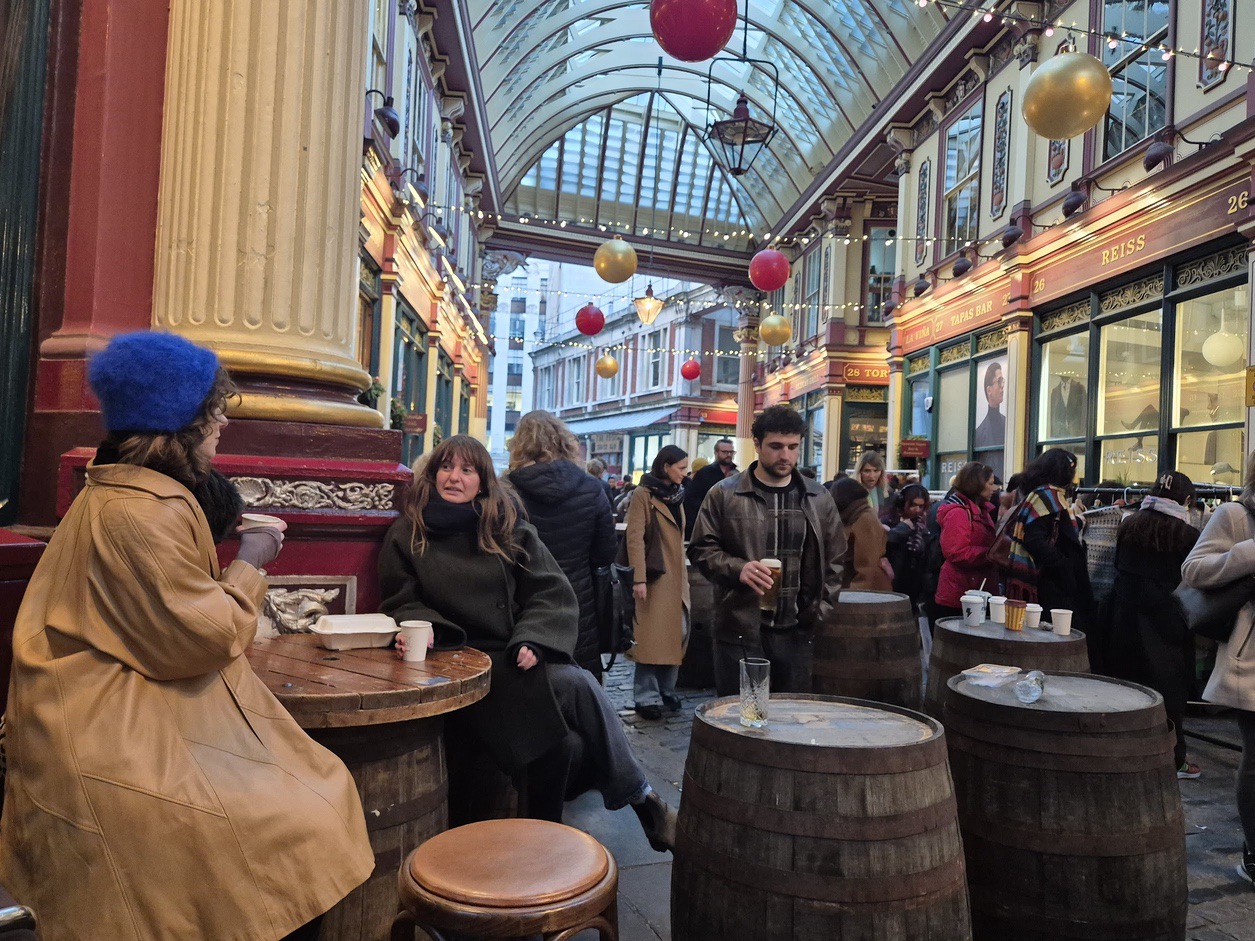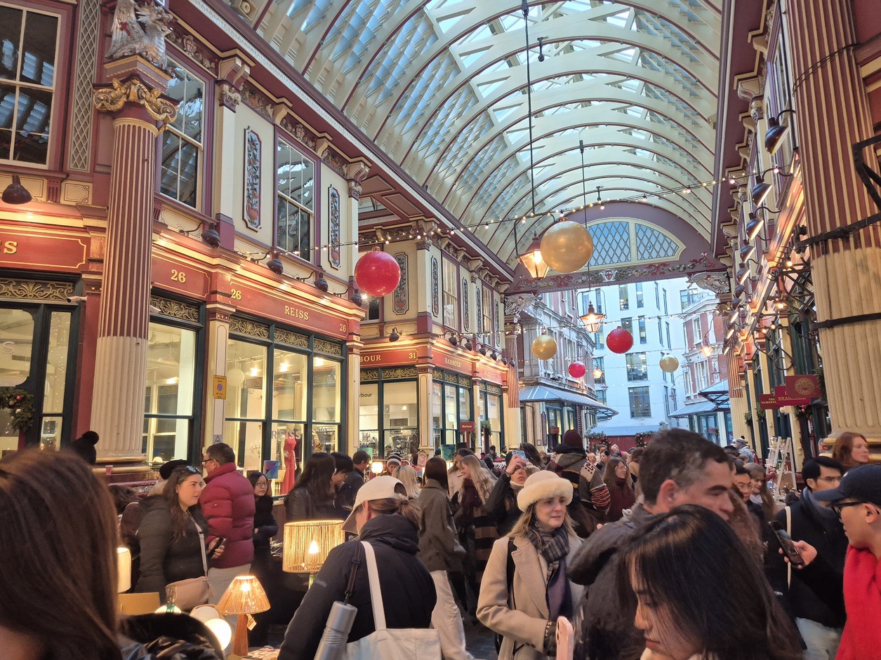 Την περίοδο των γιορτών, το Leadenhall Market μεταμορφώνεται. Φωτάκια, γιρλάντες, χριστουγεννιάτικες μπάλες και ένα εντυπωσιακό δέντρο στο κέντρο της στοάς δημιουργούν μια ατμόσφαιρα ζεστή και γιορτινή, χωρίς υπερβολές. Ο κόσμος κινείται αργά, κρατώντας ζεστό καφέ ή ένα ποτήρι κρασί, ενώ οι pubs και τα μικρά καταστήματα σφύζουν από ζωή.