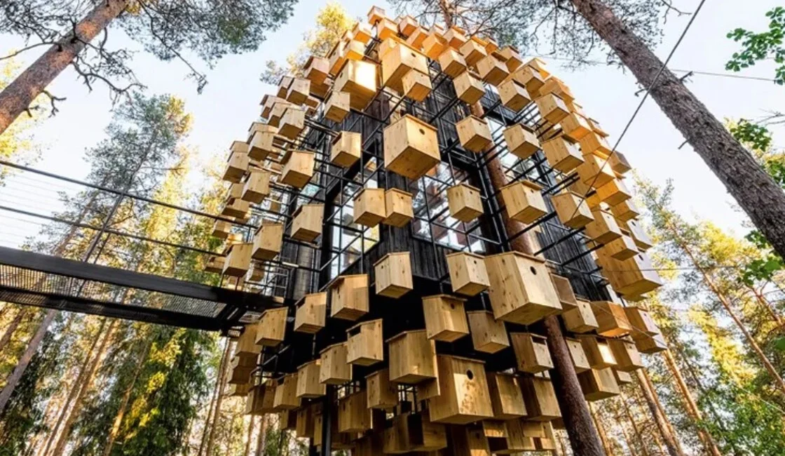 Για ορισμένους αρχιτέκτονες δεντρόσπιτων, η εγγύτητα με τη φύση σημαίνει ότι την προσκαλούν ενεργά μέσα τους. Φαίνεται να αιωρείται στο θόλο του δάσους, η Biosphere είναι γεμάτη με 350 σπίτια πουλιών, προσελκύοντας όχι μόνο πουλιά, αλλά και νυχτερίδες και μέλισσες. Η κατασκευή αποτελεί μέρος του Treehotel, ενός συνόλου οκτώ διαφορετικών σχεδίων. Δημιουργήθηκε σε συνεννόηση με έναν ορνιθολόγο ως απάντηση στην απώλεια των πτηνών. Οι ανθρώπινες ανέσεις είναι επίσης, καλά καλυμμένες, παρέχοντας υπηρεσίες και συνθήκες όπως σάουνα και ταράτσα κατάλληλη για περπάτημα.