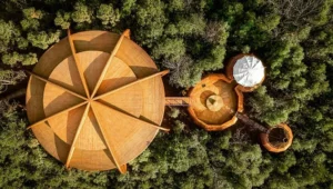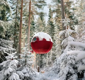 Η γιγάντια κόκκινη μπάλα που κρέμεται από πεύκα στο Näsets Marcusgård, ένα πρώην αγρόκτημα, δεν είναι χριστουγεννιάτικη διακόσμηση αλλά μια «σκηνή δέντρου» κατασκευασμένη από πλαίσιο αλουμινίου και κόντρα πλακέ, τυλιγμένη σε αδιάβροχο καμβά. Το προσαρμόσιμο δεντρόσπιτο, λέει ο ιδρυτής και διευθυντής σχεδιασμού της Tree Tents International, Jason Thawley, στοχεύει «να συνδέσει τους ανθρώπους με την ύπαιθρο μέσω του σχεδιασμού» και «λειτουργεί με τη φύση αντί να χτίζει πάνω ή γύρω από αυτήν». Ο Willem Terstegen, συνιδιοκτήτης της Näsets Marcusgård, λέει στο BBC: «Το να βρίσκεσαι ανάμεσα στα δέντρα προσφέρει μια μικρή αλλαγή που αισθάνεται τεράστια. Ο κόσμος φαίνεται πιο απαλός, ο χρόνος επιβραδύνεται και ακόμη και η σιωπή μοιάζει ζωντανή».