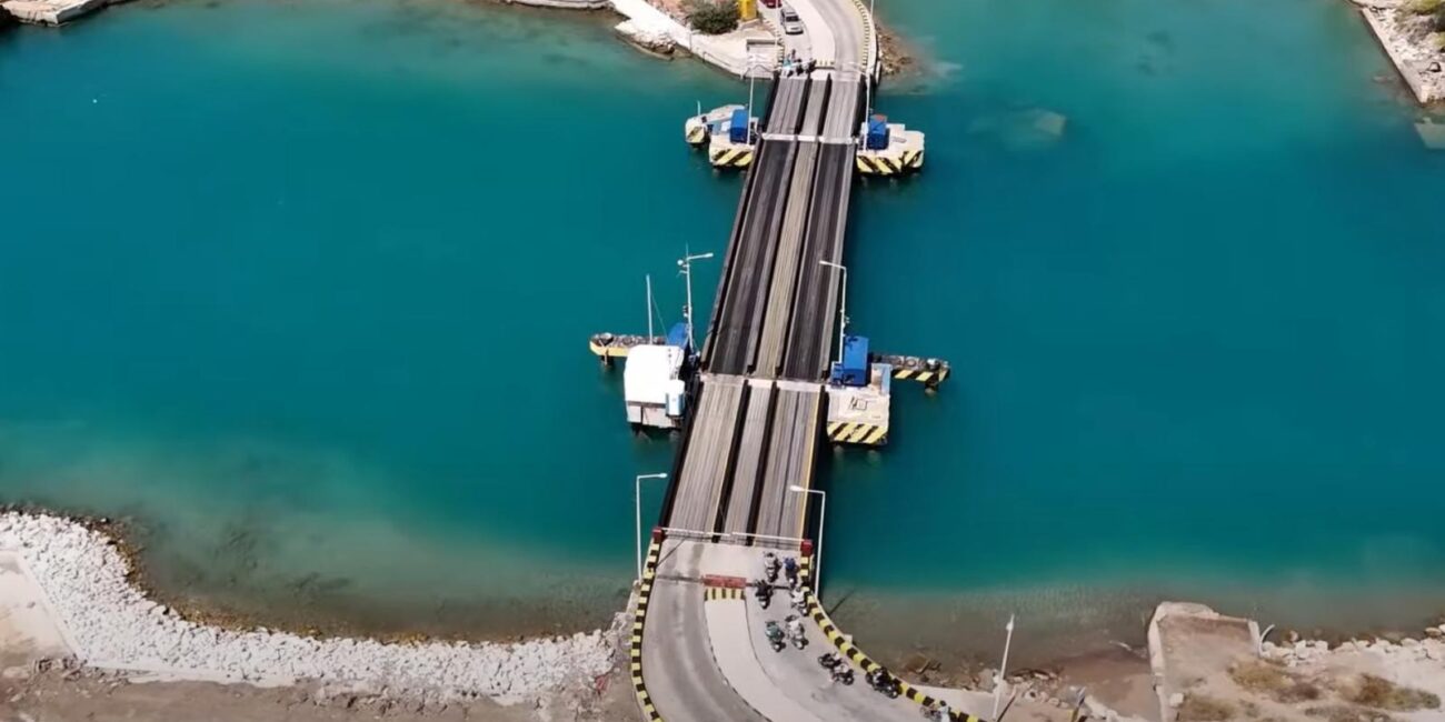 Πρόκειται για τις βυθιζόμενες γέφυρες της περιοχής, κατασκευές που εξυπηρετούν τη σύνδεση της Πελοποννήσου με την ηπειρωτική Ελλάδα με έναν τεχνικά άκρως ιδιότυπο τρόπο.