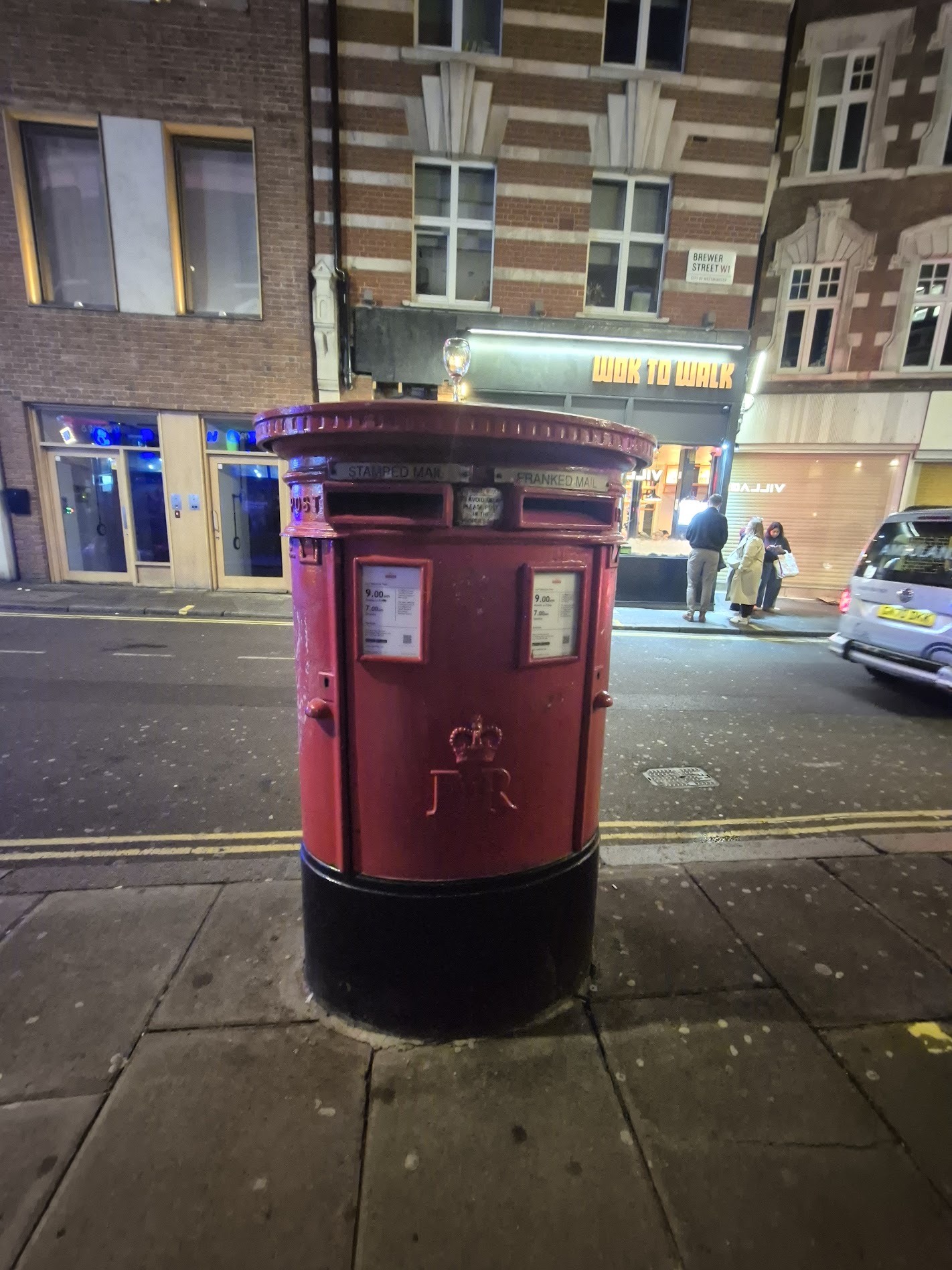 Στη Brewer Street του Soho, το συγκεκριμένο pillar box μοιάζει σχεδόν να πρωταγωνιστεί. Στέκεται στη μέση του δρόμου, σταθερό και αμετακίνητο, την ώρα που γύρω του ο κόσμος αλλάζει ρυθμούς, γελά, τρέχει, μιλά δυνατά, ζει. Οι neon επιγραφές, τα εστιατόρια που δεν ησυχάζουν ποτέ, οι περαστικοί που περνούν με βιαστικά βήματα δημιουργούν έναν αστικό καμβά που δεν σταματά ούτε στιγμή. Κι ανάμεσα σε όλα αυτά, ένα απλό κόκκινο κουτί κρατά μια διακριτική θέση στο σκηνικό.