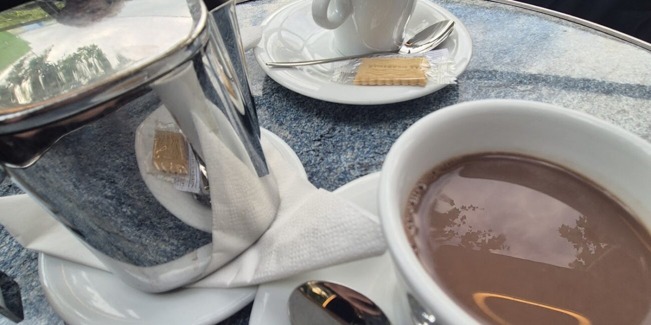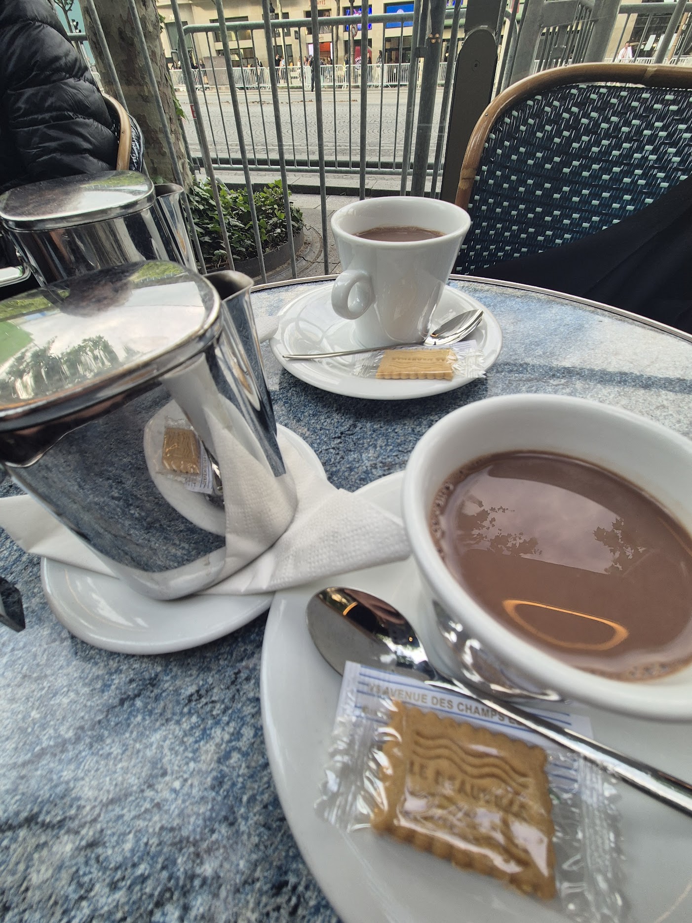 Παραγγείλαμε δύο ζεστές σοκολάτες, σερβιρισμένες με την κλασική γαλλική φινέτσα: η πυκνή, βελούδινη σοκολάτα έρχεται μέσα σε μεταλλική κανατά, έτσι ώστε να ξαναγεμίσεις το φλιτζάνι σου. Κι αυτό κάνει το ρόφημα να μοιάζει με μικρή τελετουργία — με εκείνη τη γεύση που θυμίζει παιδικές Κυριακές.