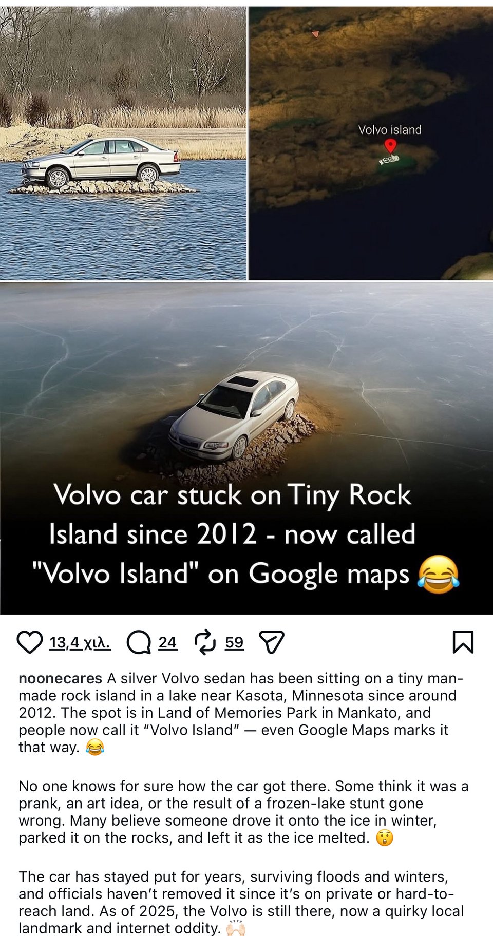 Στο Google Maps υπάρχει ένα μικρό νησί που ονομάζεται Volvo Island, όπου ένα αυτοκίνητο είναι παρκαρισμένο εδώ και 13 χρόνια