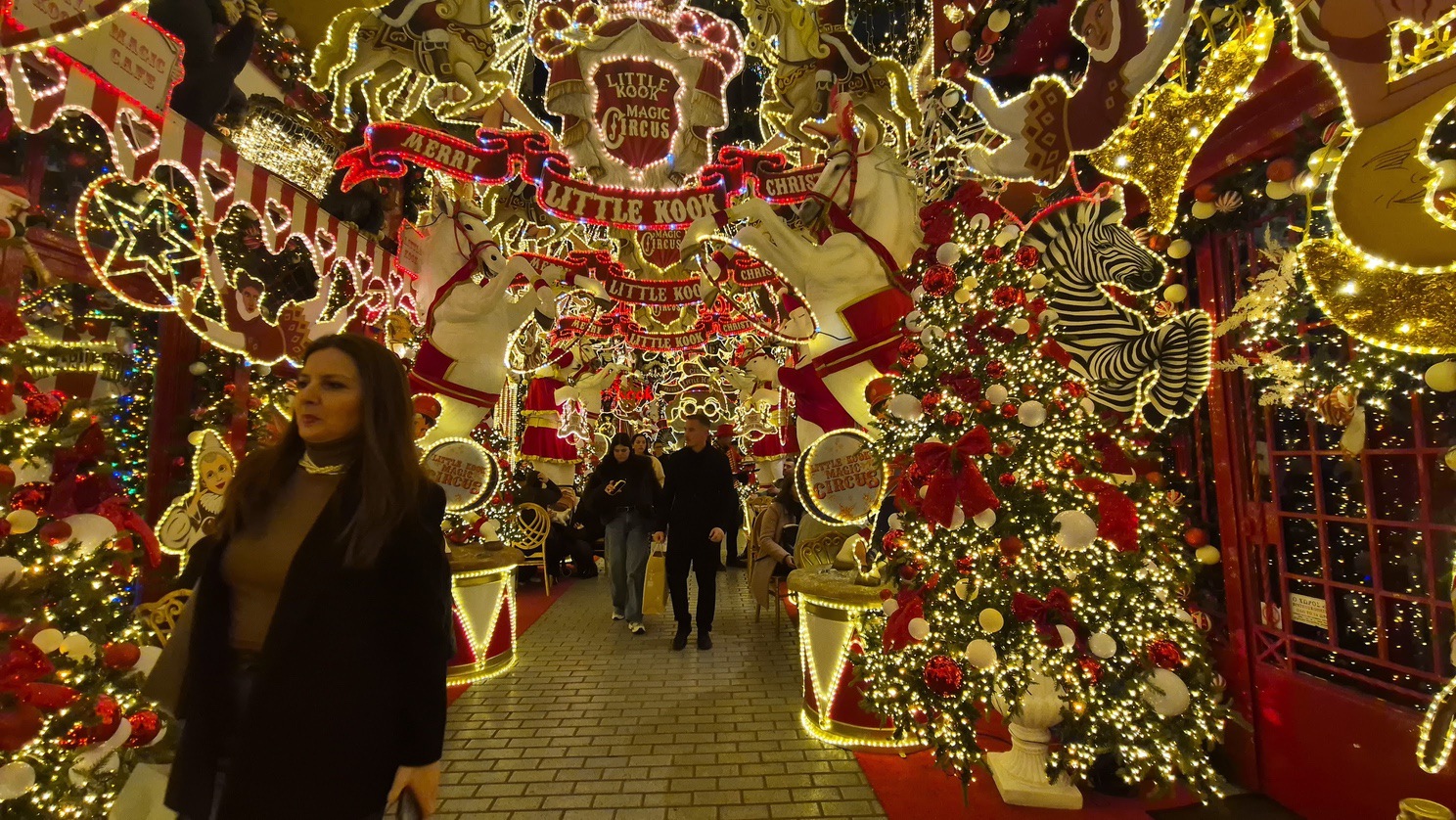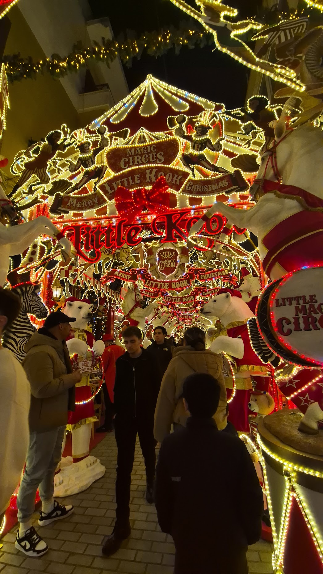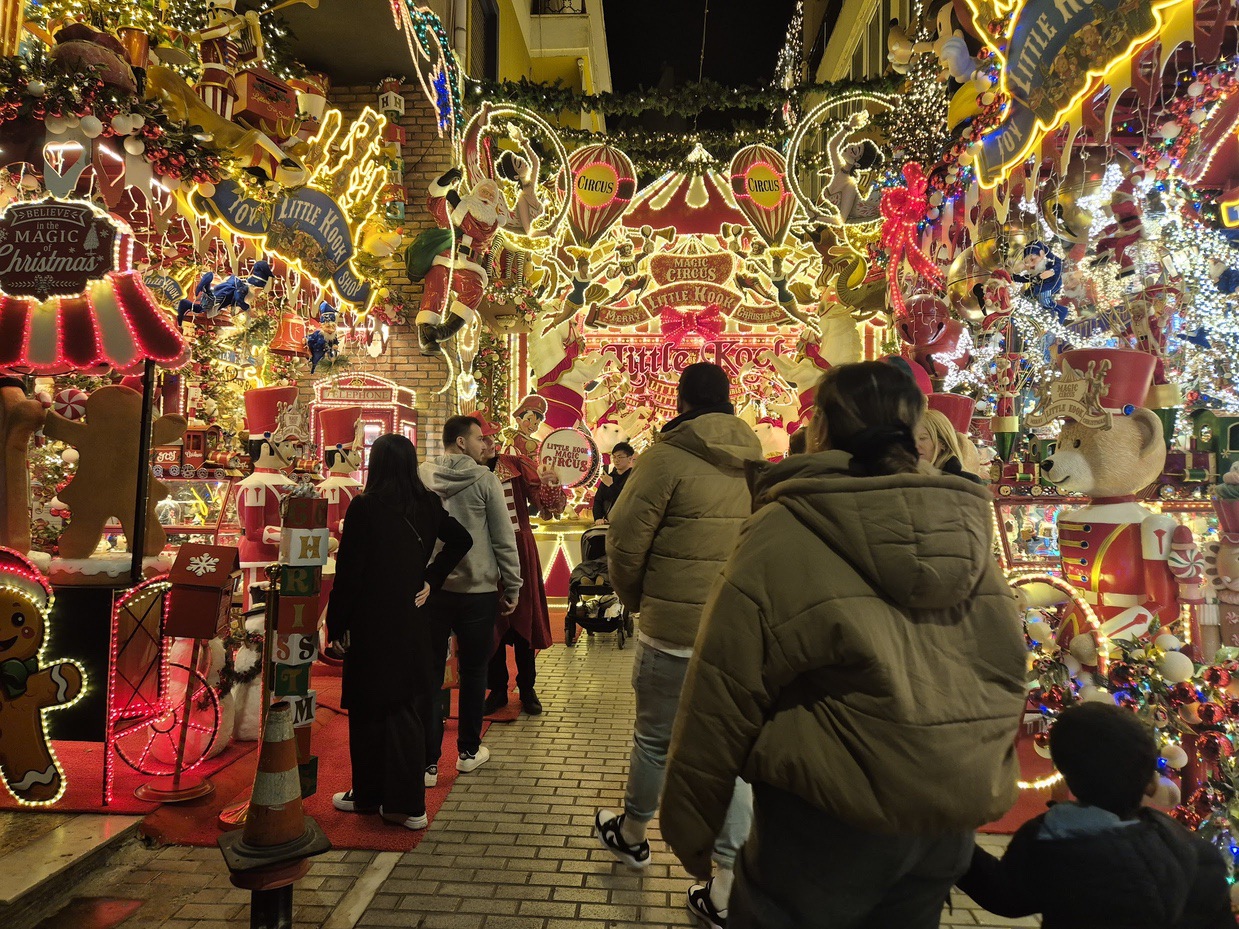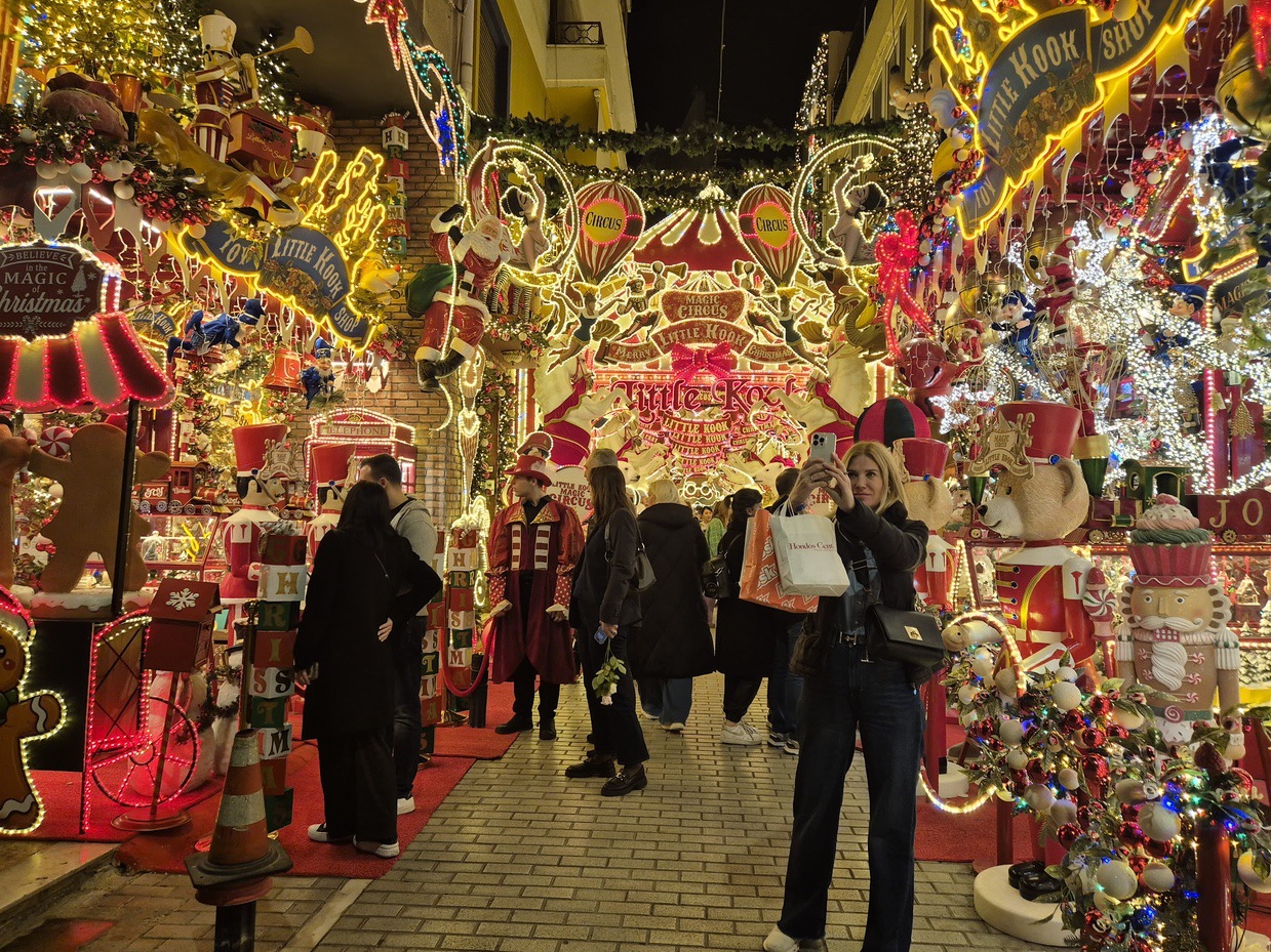 Οι πρώτες νότες της εμπειρίας ξεκινούν πριν καν πλησιάσεις. Από μακριά, το στενό πλημμυρίζει χρώματα, φως, μουσικές και κινούμενες φιγούρες. Άλογα, ζέβρες, τεράστιοι καρυοθραύστες, ζαχαρωτά, μπαλαρίνες και Άγιοι Βασίληδες δημιουργούν μια χριστουγεννιάτικη έκρηξη που εξαπλώνεται από το ένα κτίριο στο άλλο. Κάθε γωνιά, κάθε πινελιά, κάθε μικρή λεπτομέρεια δείχνει πως τίποτα δεν έχει αφεθεί στην τύχη.