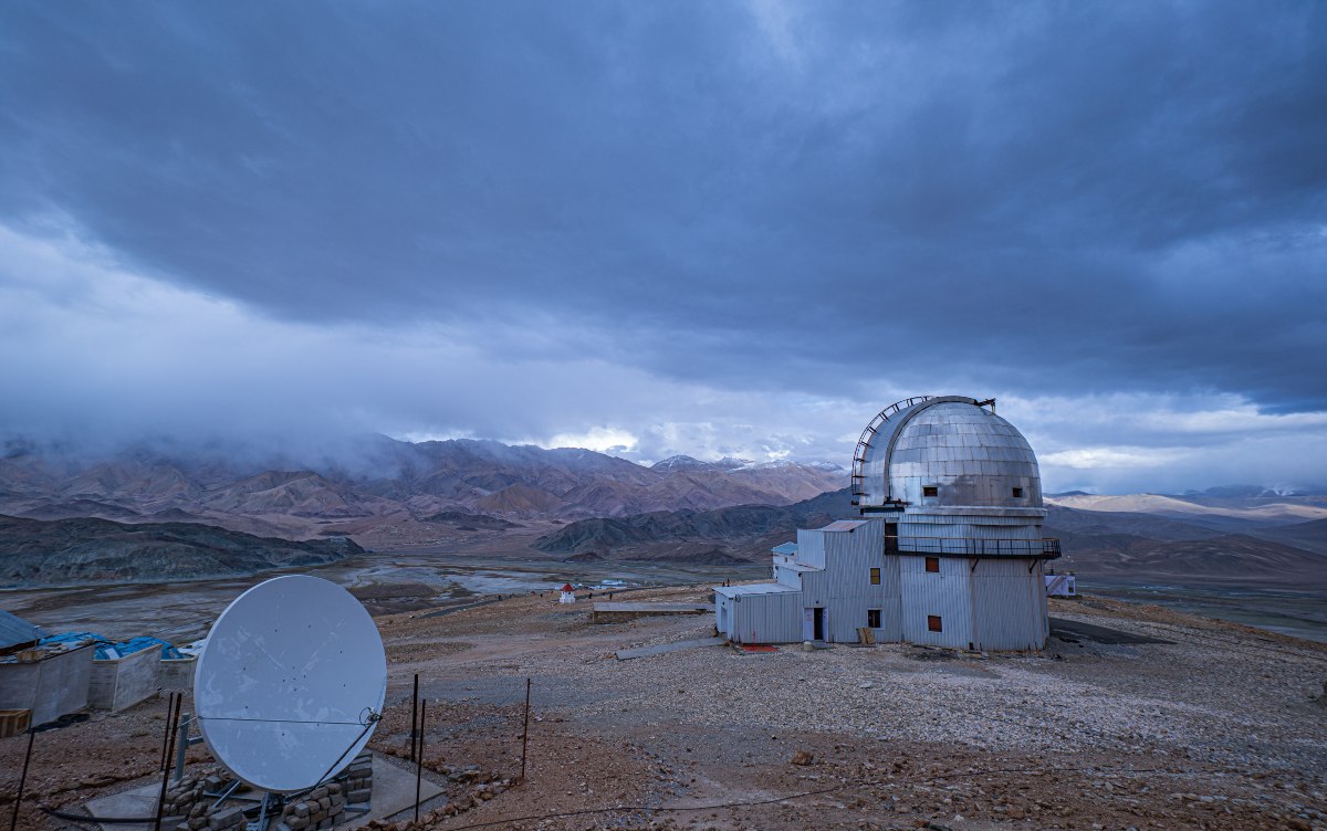 Το Ινδικό Αστρονομικό Παρατηρητήριο στο Χάνλε του Λαντάκ βρίσκεται κάτω από έναν απέραντο γαλάζιο ουρανό, όπου παρασύρονται λευκά σύννεφα. Το σκηνικό και η μοναξιά του δημιουργούν το ιδανικό σημείο για παρατήρηση του διαστήματος.