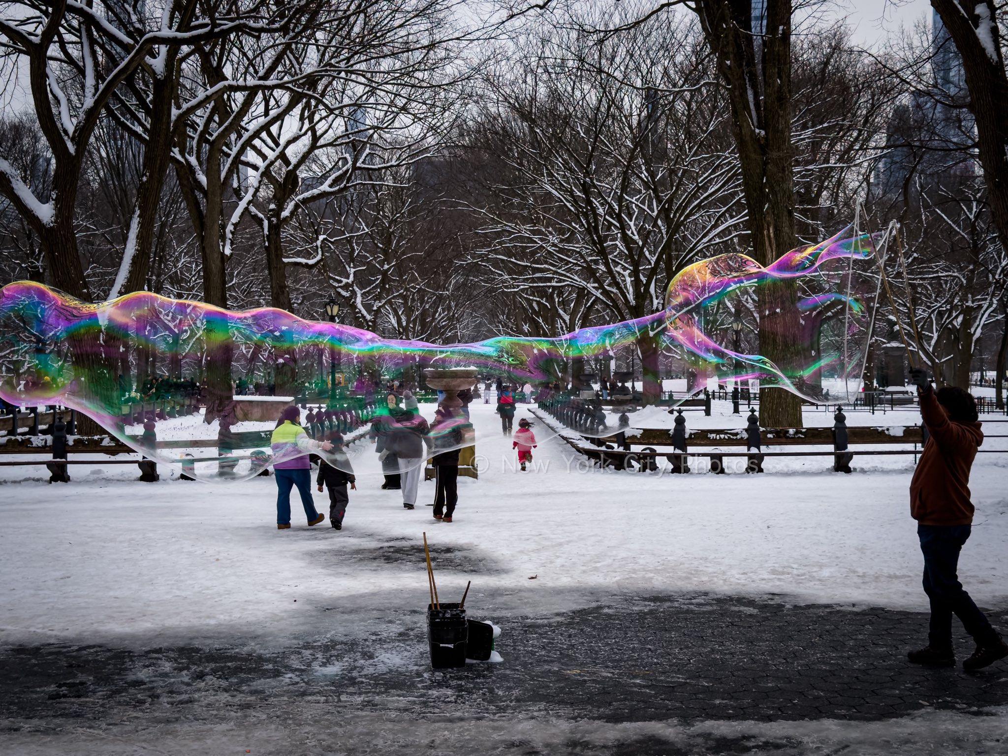 Ανάμεσα στο λευκό και το γκρι του χειμώνα, οι σαπουνόφουσκες που αιωρούνται στον παγωμένο αέρα δίνουν μια απρόσμενη νότα χρώματος. Παιδιά τρέχουν να τις πιάσουν, μεγάλοι σταματούν για μια φωτογραφία. Μικρές στιγμές, αυθόρμητες, που κάνουν το πάρκο να μοιάζει ζωντανό ακόμη και μέσα στο κρύο.