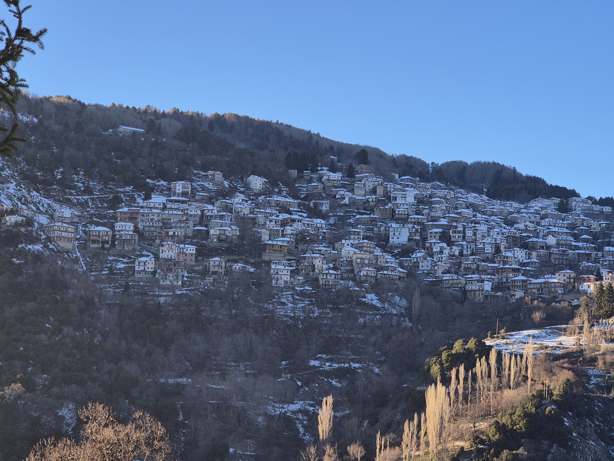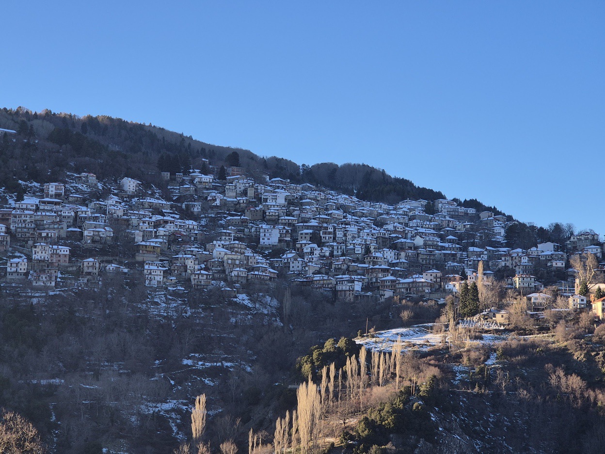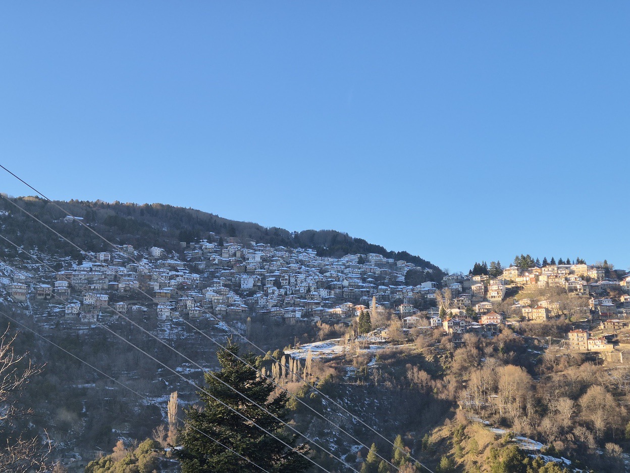 Το Μέτσοβο τον χειμώνα, όταν το κοιτάς από μακριά, μοιάζει με καρτ-ποστάλ. Ο ήλιος πέφτει χαμηλά και φωτίζει άνισα τα σπίτια. Άλλες στέγες λάμπουν, άλλες μένουν στη σκιά. Το τοπίο δεν είναι τέλειο – και γι’ αυτό είναι όμορφο.