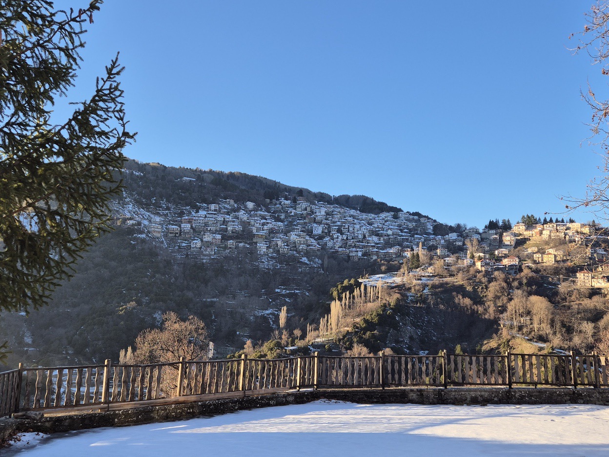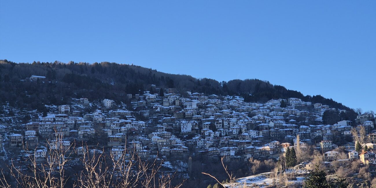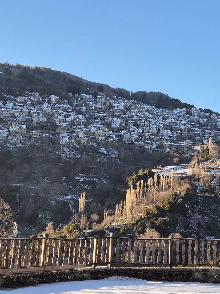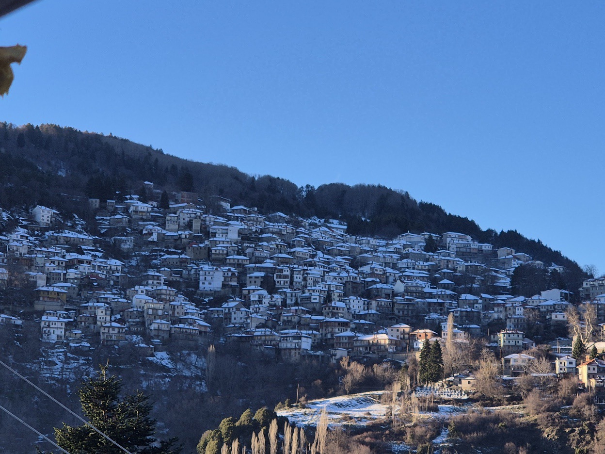 Το Μέτσοβο τον χειμώνα, όταν το κοιτάς από μακριά, μοιάζει με καρτ-ποστάλ. Ο ήλιος πέφτει χαμηλά και φωτίζει άνισα τα σπίτια. Άλλες στέγες λάμπουν, άλλες μένουν στη σκιά. Το τοπίο δεν είναι τέλειο – και γι’ αυτό είναι όμορφο.