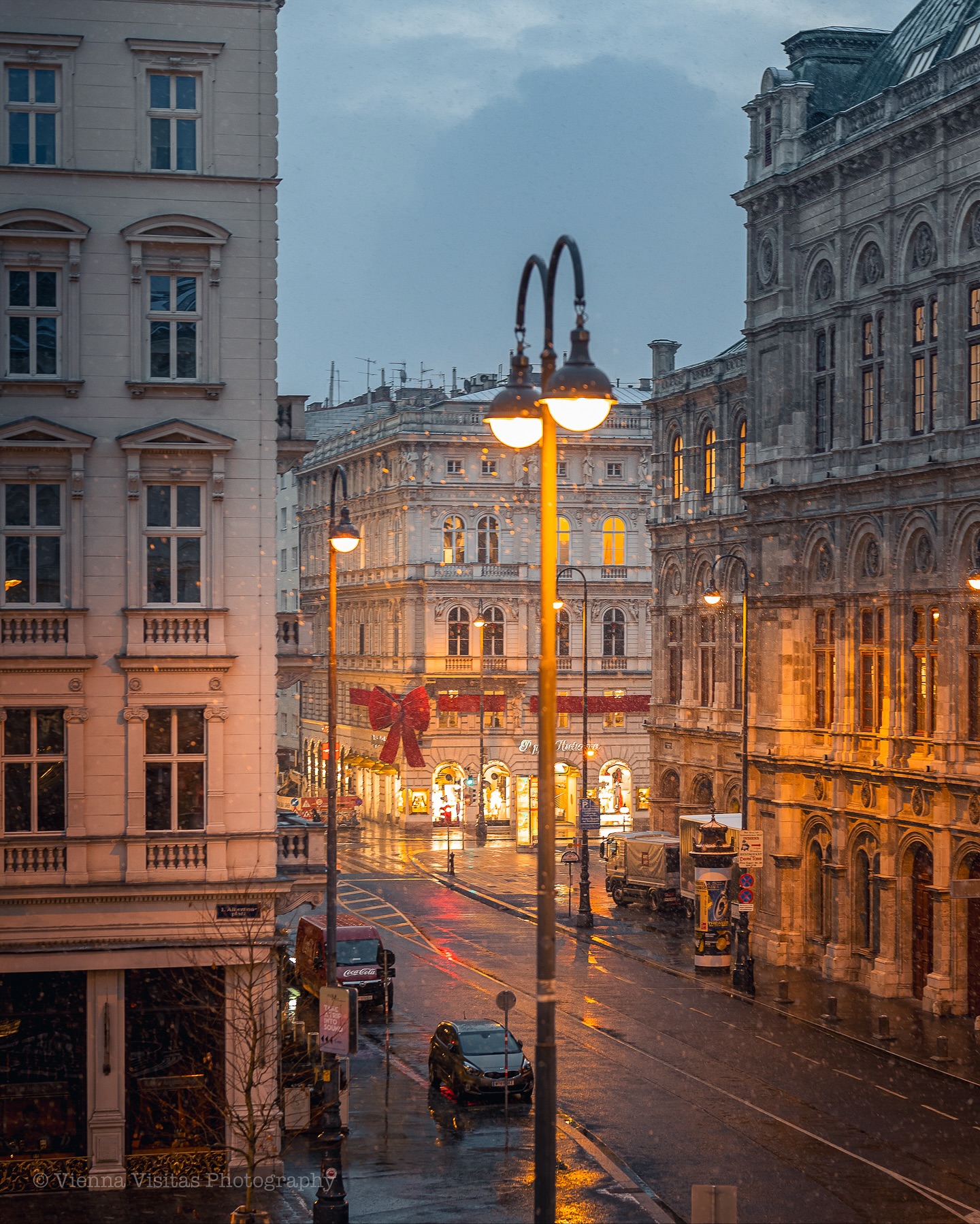 Ακόμη κι όταν βρέχει η πόλη παραμένει μαγική — τα φώτα καθρεφτίζονται στο βρεγμένο οδόστρωμα, οι δρόμοι αποκτούν ρομαντική λάμψη και η Βιέννη δείχνει το πιο γοητευτικό, μελαγχολικό της πρόσωπο.