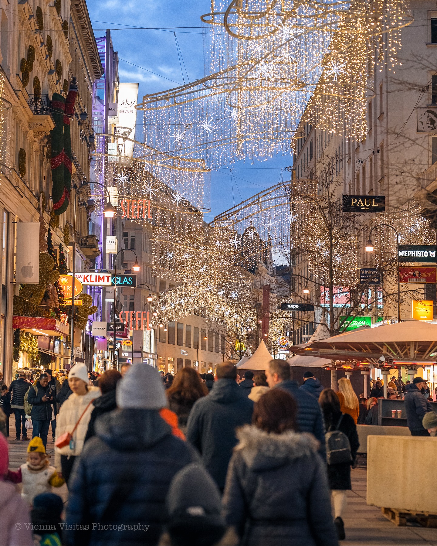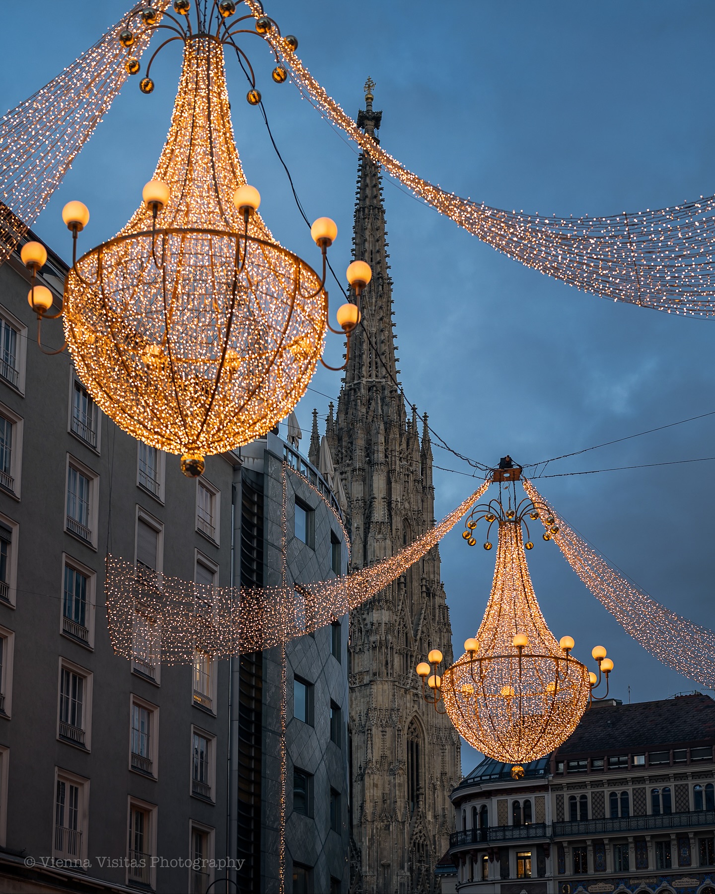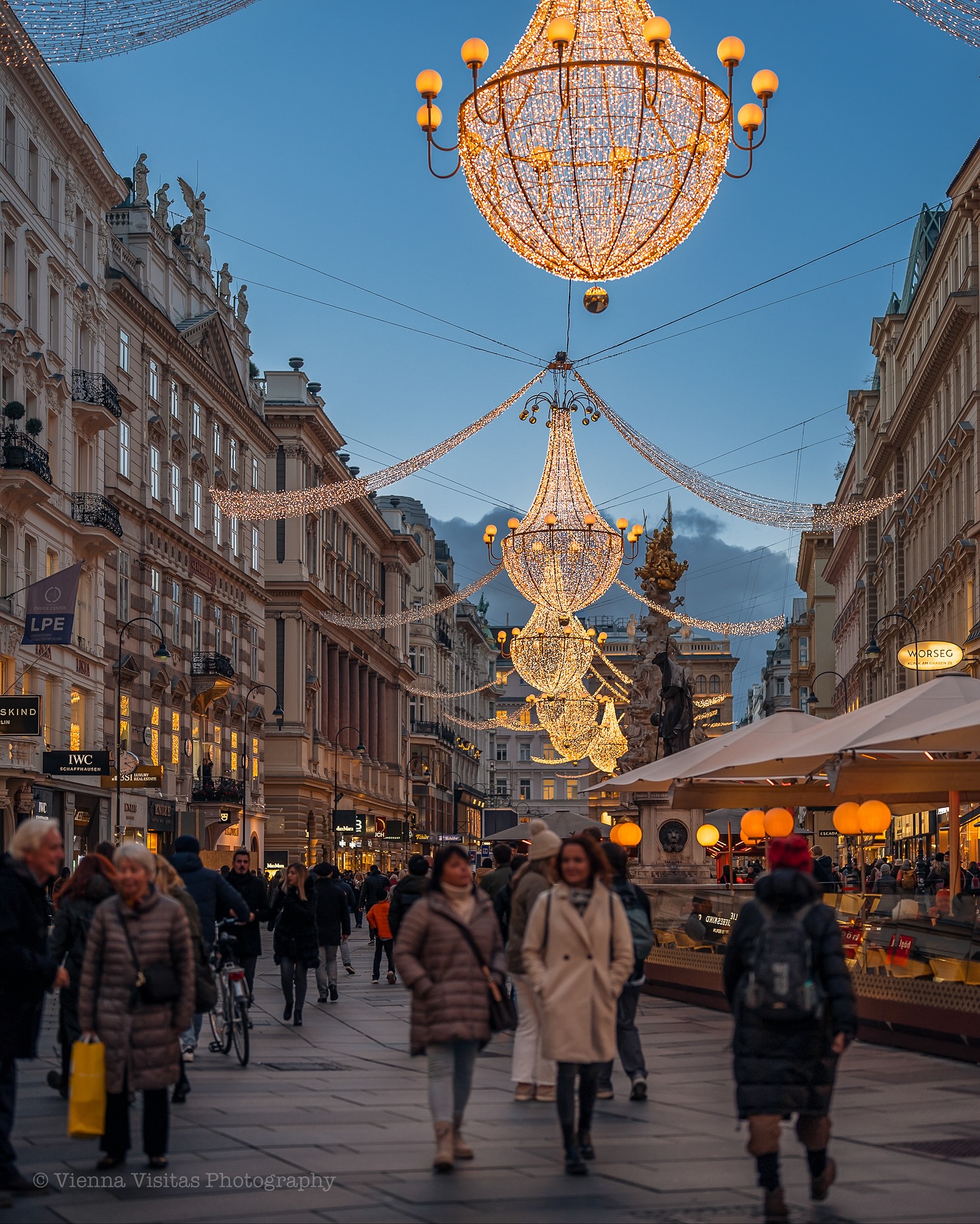 Στη Graben, την πιο αριστοκρατική λεωφόρο της πόλης, οι εντυπωσιακοί πολυέλαιοι φωτίζουν τα ιστορικά κτίρια και δημιουργούν μια ατμόσφαιρα που θυμίζει σκηνικό παλιάς ταινίας. Οι περαστικοί απολαμβάνουν τη βόλτα τους με ζεστή σοκολάτα στο χέρι, ενώ στους δρόμους γύρω από τον Καθεδρικό του Αγίου Στεφάνου οι νότες από βιολιά και σαξόφωνα δίνουν ρυθμό στη γιορτινή πόλη.