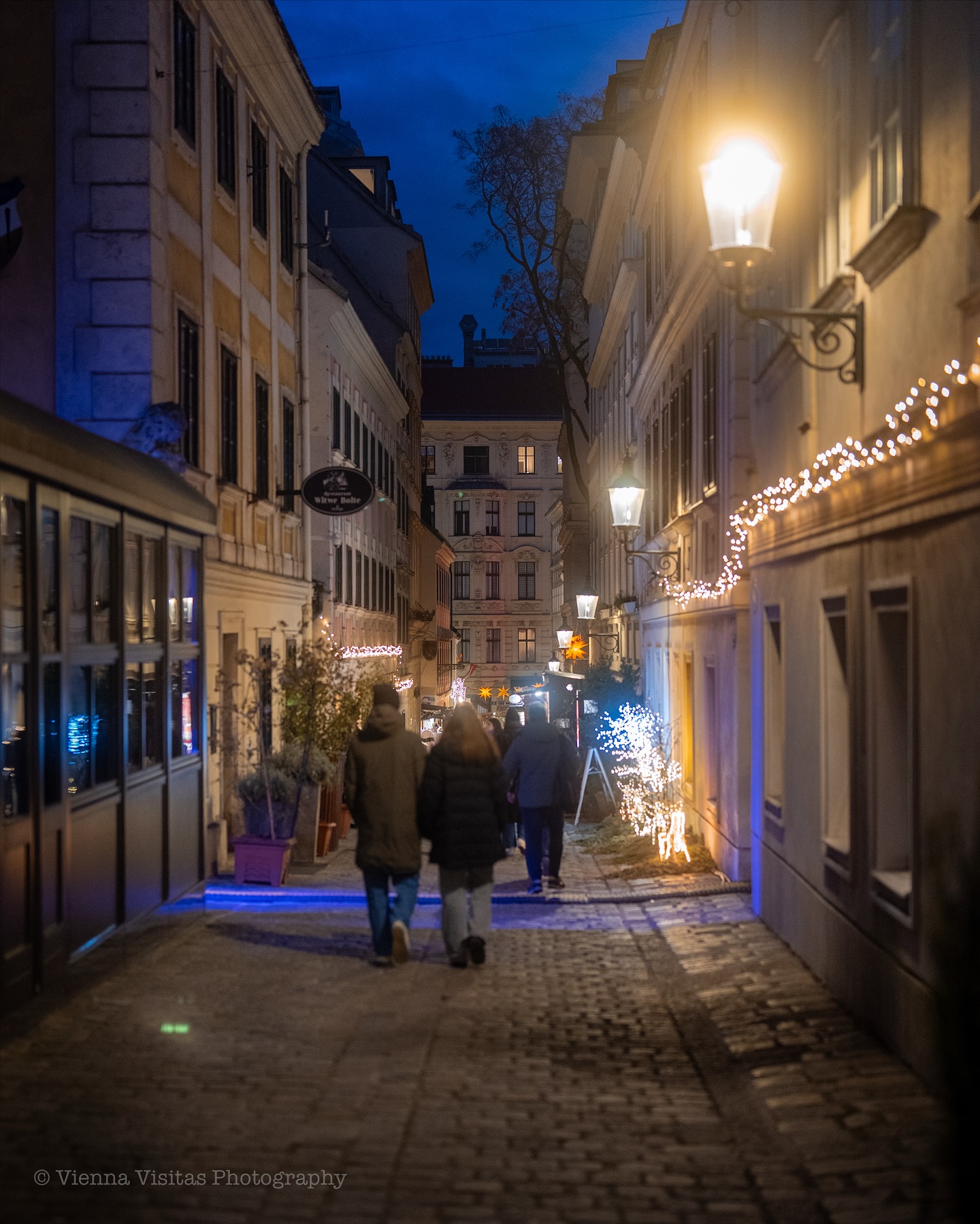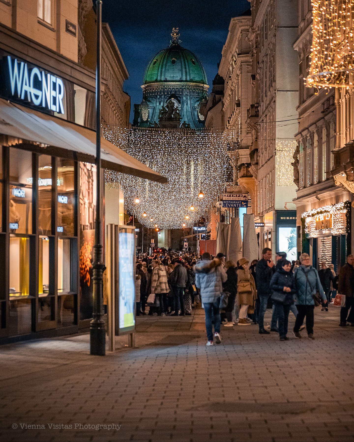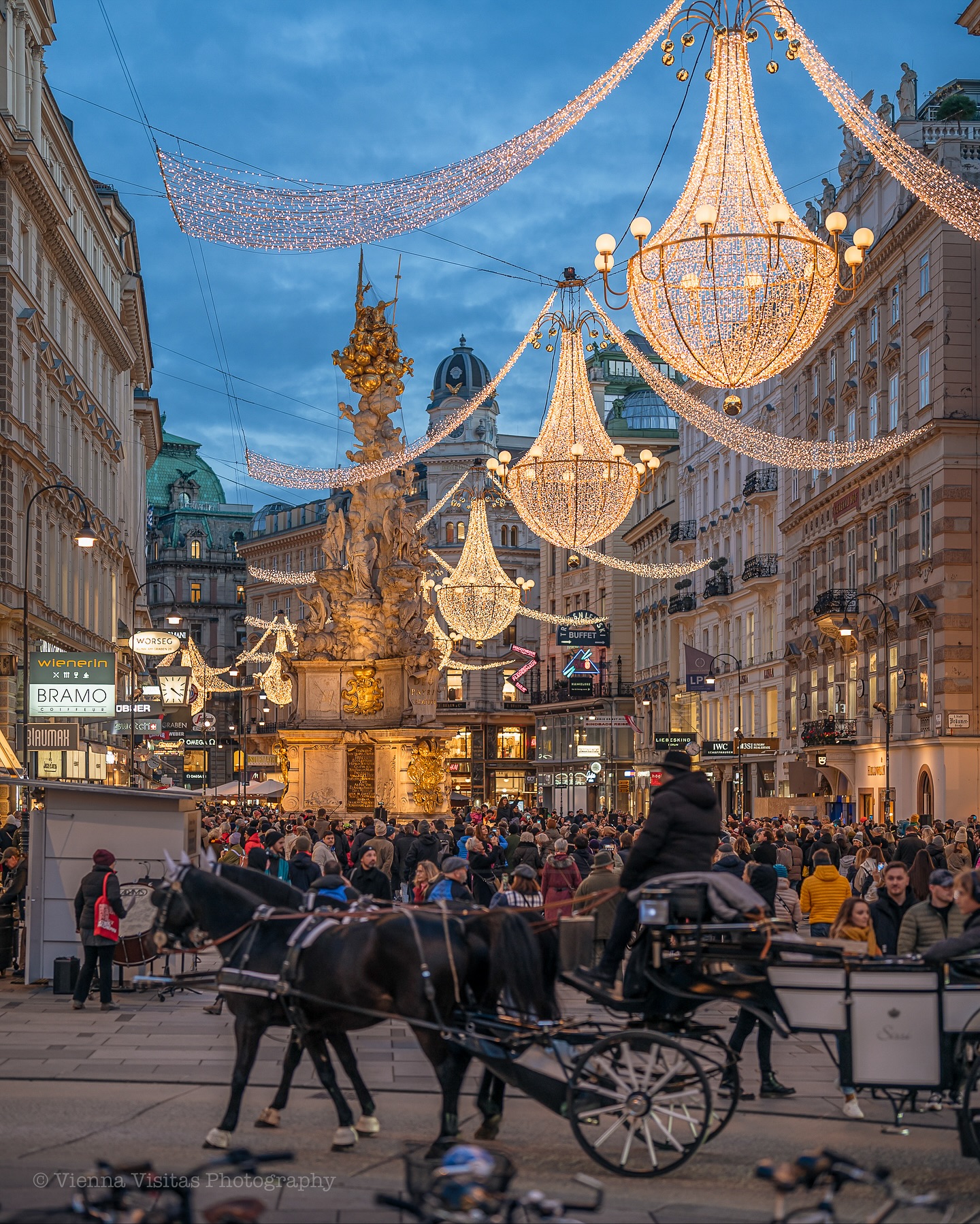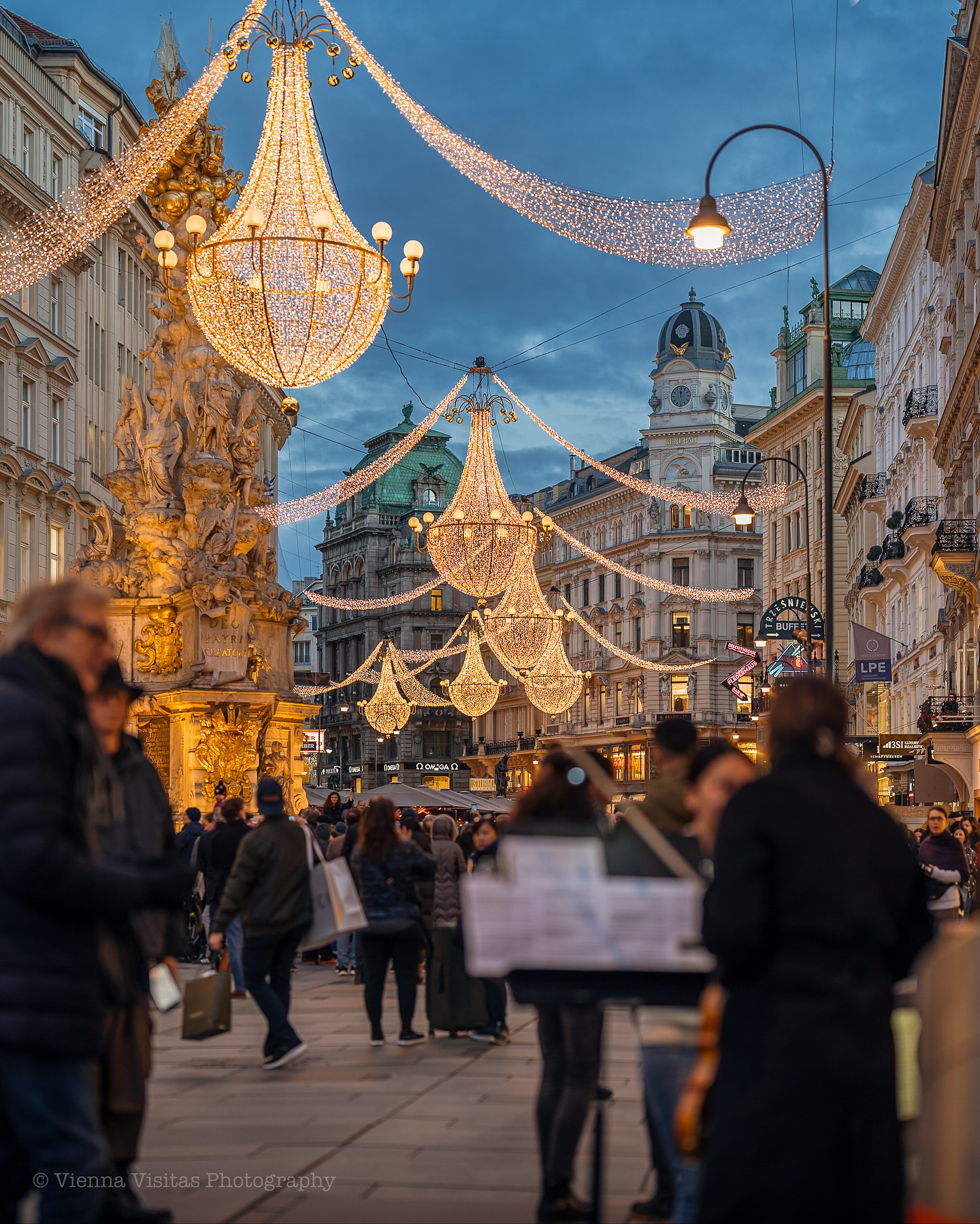 Στη Graben, την πιο αριστοκρατική λεωφόρο της πόλης, οι εντυπωσιακοί πολυέλαιοι φωτίζουν τα ιστορικά κτίρια και δημιουργούν μια ατμόσφαιρα που θυμίζει σκηνικό παλιάς ταινίας. Οι περαστικοί απολαμβάνουν τη βόλτα τους με ζεστή σοκολάτα στο χέρι, ενώ στους δρόμους γύρω από τον Καθεδρικό του Αγίου Στεφάνου οι νότες από βιολιά και σαξόφωνα δίνουν ρυθμό στη γιορτινή πόλη.