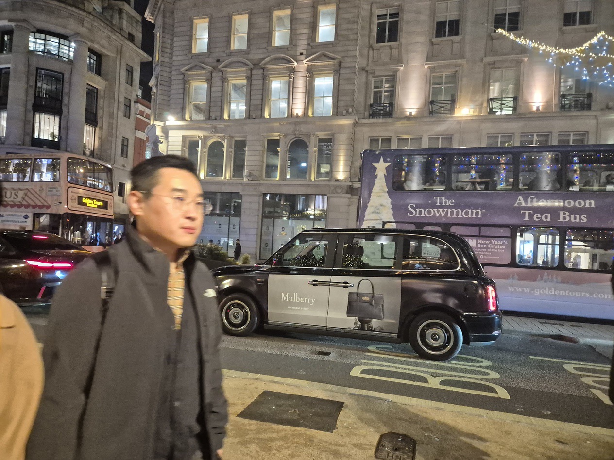 Κι όσο βραδιάζει, η λάμψη γίνεται ακόμη πιο έντονη. Οι αντανακλάσεις στις βιτρίνες, ο θόρυβος που μπλέκεται με τις μελωδίες των δρόμων, οι φωτογραφίες που βγαίνουν η μία μετά την άλλη. Ένα λεωφορείο με χριστουγεννιάτικο θέμα, ένα ταξί που περνά αργά κάτω από τα φωτεινά φτερά, μια παρέα που σταματά κοιτώντας ψηλά — μικρές σκηνές που συνθέτουν το μωσαϊκό μιας μητρόπολης που γιορτάζει χωρίς υπερβολές αλλά με ουσία.