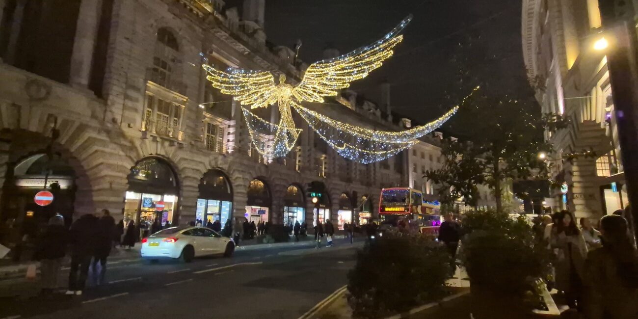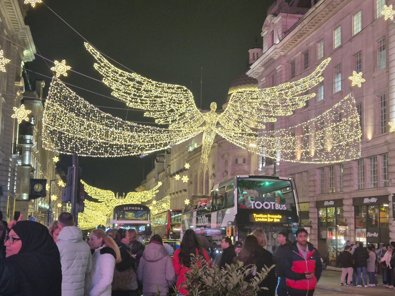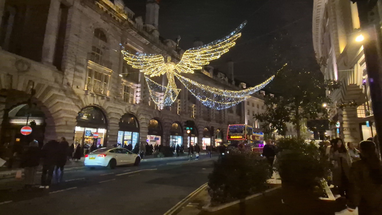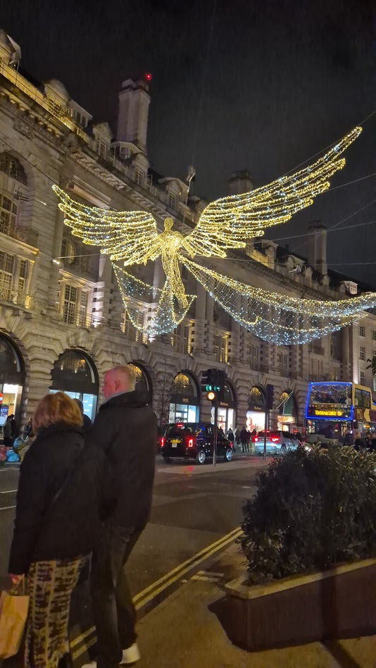 Η βόλτα στο κέντρο ξεκινά σχεδόν πάντα από τη Regent Street, όπου οι διάσημοι φωτεινοί άγγελοι απλώνονται σαν χρυσή γέφυρα πάνω από τον δρόμο. Έχουν γίνει πλέον παγκόσμιο σύμβολο των γιορτών∙ χιλιάδες φωτογραφίες, εκατομμύρια προβολές, αμέτρητα βίντεο κάθε χρόνο. Κι όμως, τίποτα δεν συγκρίνεται με τη στιγμή που τους βλέπεις από κοντά. Οι λάμψεις τους αντανακλούν στα κόκκινα διώροφα λεωφορεία, στα μαύρα ταξί, στις υγρές προσόψεις των κτιρίων — κάθε επιφάνεια μεταμορφώνεται σε καμβά.