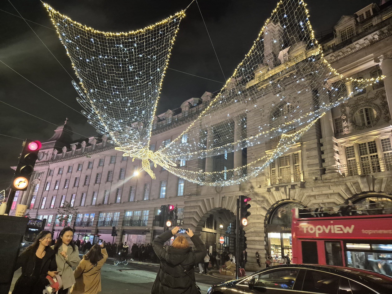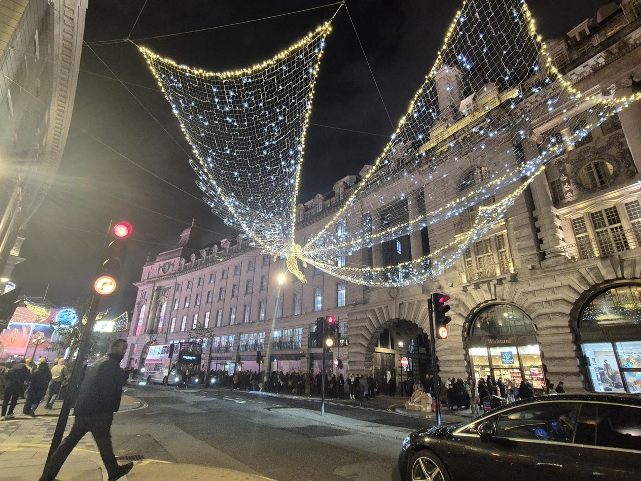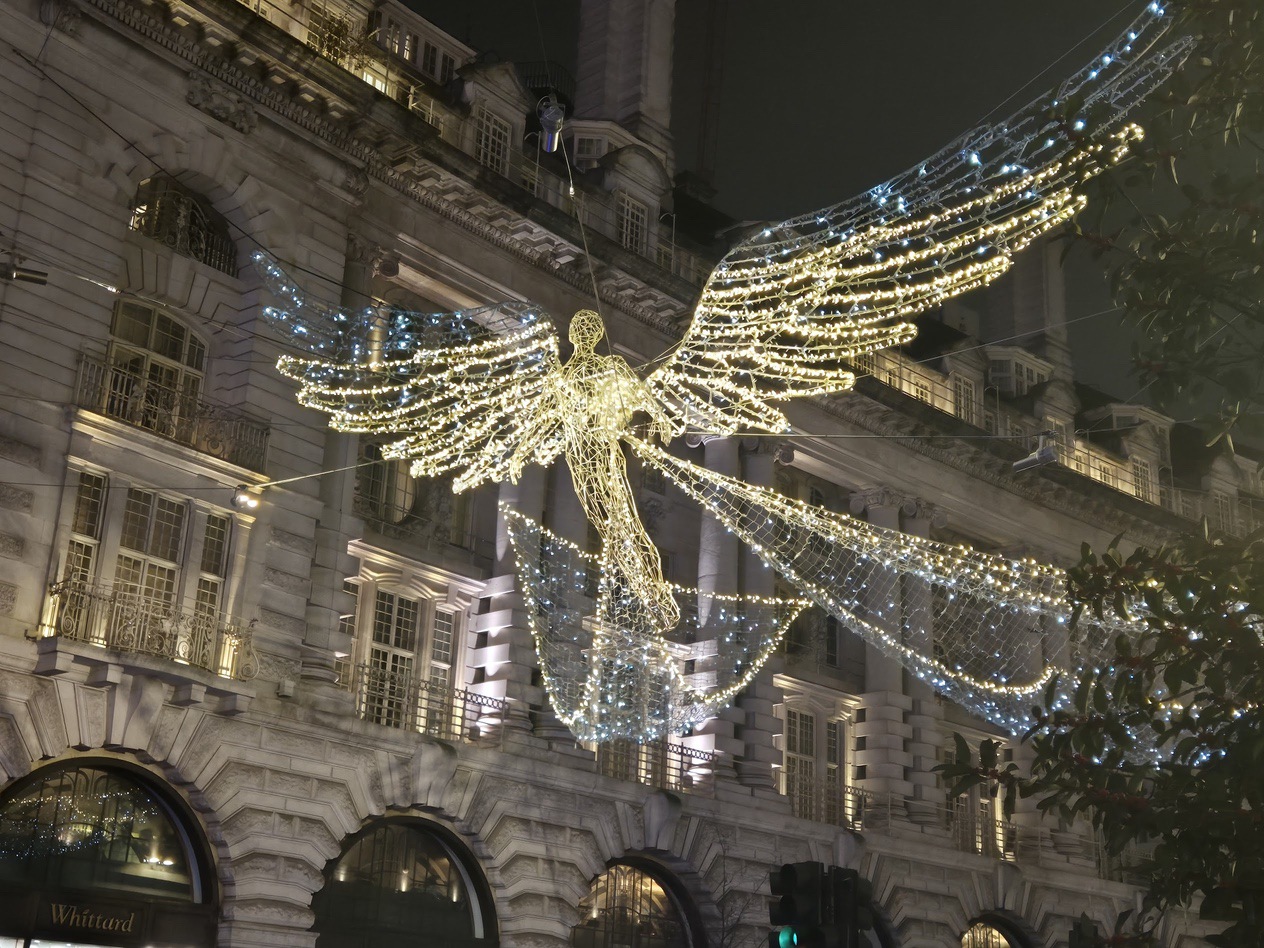 Η βόλτα στο κέντρο ξεκινά σχεδόν πάντα από τη Regent Street, όπου οι διάσημοι φωτεινοί άγγελοι απλώνονται σαν χρυσή γέφυρα πάνω από τον δρόμο. Έχουν γίνει πλέον παγκόσμιο σύμβολο των γιορτών∙ χιλιάδες φωτογραφίες, εκατομμύρια προβολές, αμέτρητα βίντεο κάθε χρόνο. Κι όμως, τίποτα δεν συγκρίνεται με τη στιγμή που τους βλέπεις από κοντά. Οι λάμψεις τους αντανακλούν στα κόκκινα διώροφα λεωφορεία, στα μαύρα ταξί, στις υγρές προσόψεις των κτιρίων — κάθε επιφάνεια μεταμορφώνεται σε καμβά.