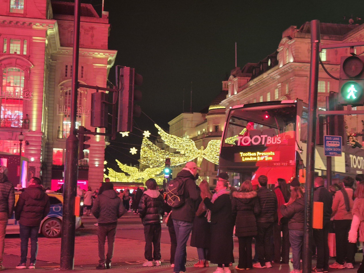 Κι όσο βραδιάζει, η λάμψη γίνεται ακόμη πιο έντονη. Οι αντανακλάσεις στις βιτρίνες, ο θόρυβος που μπλέκεται με τις μελωδίες των δρόμων, οι φωτογραφίες που βγαίνουν η μία μετά την άλλη. Ένα λεωφορείο με χριστουγεννιάτικο θέμα, ένα ταξί που περνά αργά κάτω από τα φωτεινά φτερά, μια παρέα που σταματά κοιτώντας ψηλά — μικρές σκηνές που συνθέτουν το μωσαϊκό μιας μητρόπολης που γιορτάζει χωρίς υπερβολές αλλά με ουσία.